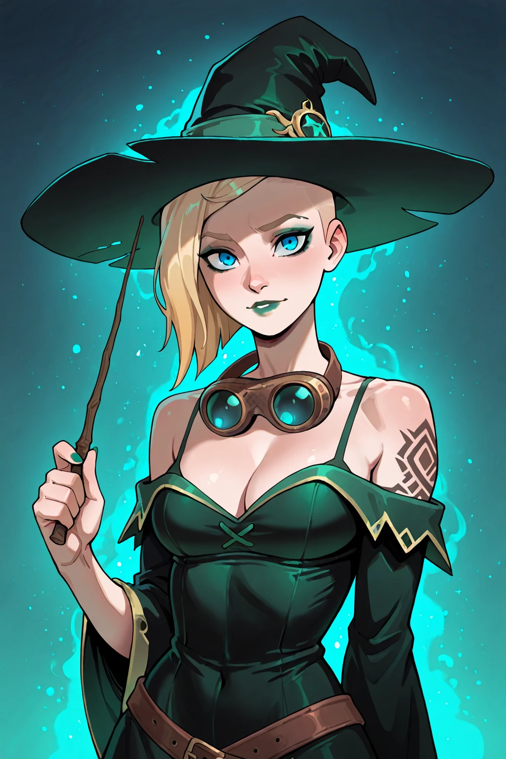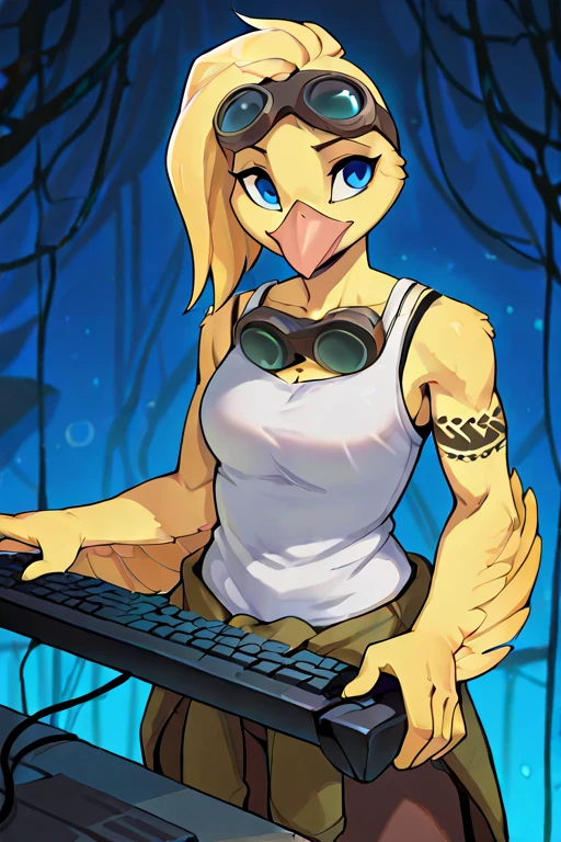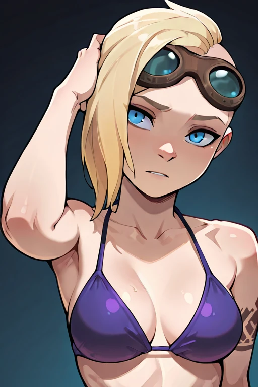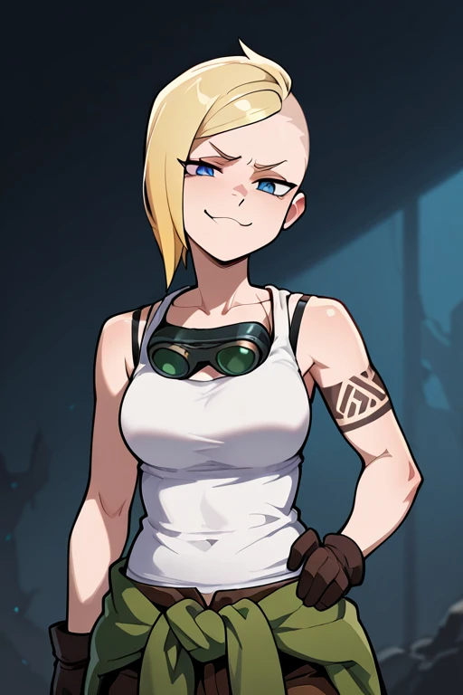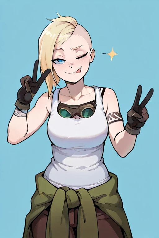 Prompts: sofiaporter, blonde hair, asymmetrical hair, blue eyes, goggles, tattoo, white tanktop, gloves, straps, clothes around waist, brown pants,