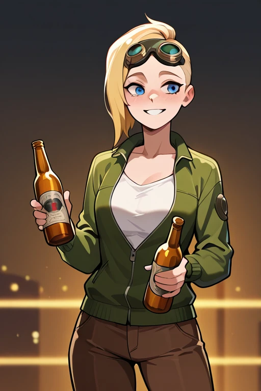 sofiaporter, blonde hair, asymmetrical hair, blue eyes, goggles, green jacket, white shirt, brown pants