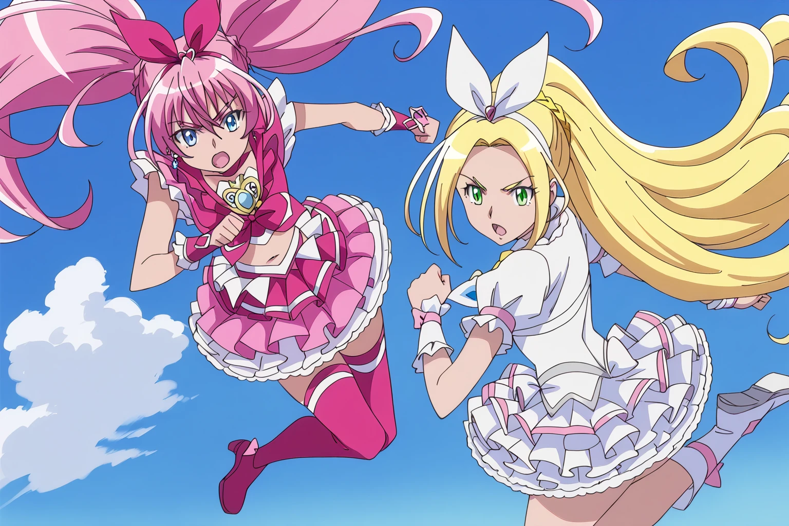 cure rhythm, blonde hair, ponytail, very long hair, braid, eyelashes, green eyes, white dress, puffy short sleeves, frilled sleeves, white choker, ribbon choker, brooch, white neckwear, earrings, hair bow, white bow, white hairband, wrist cuffs, arm warmers, hair ornament, pink bow, white skirt, frilled skirt, layered skirt, petticoat, knee boots, white footwear, cross-laced footwear