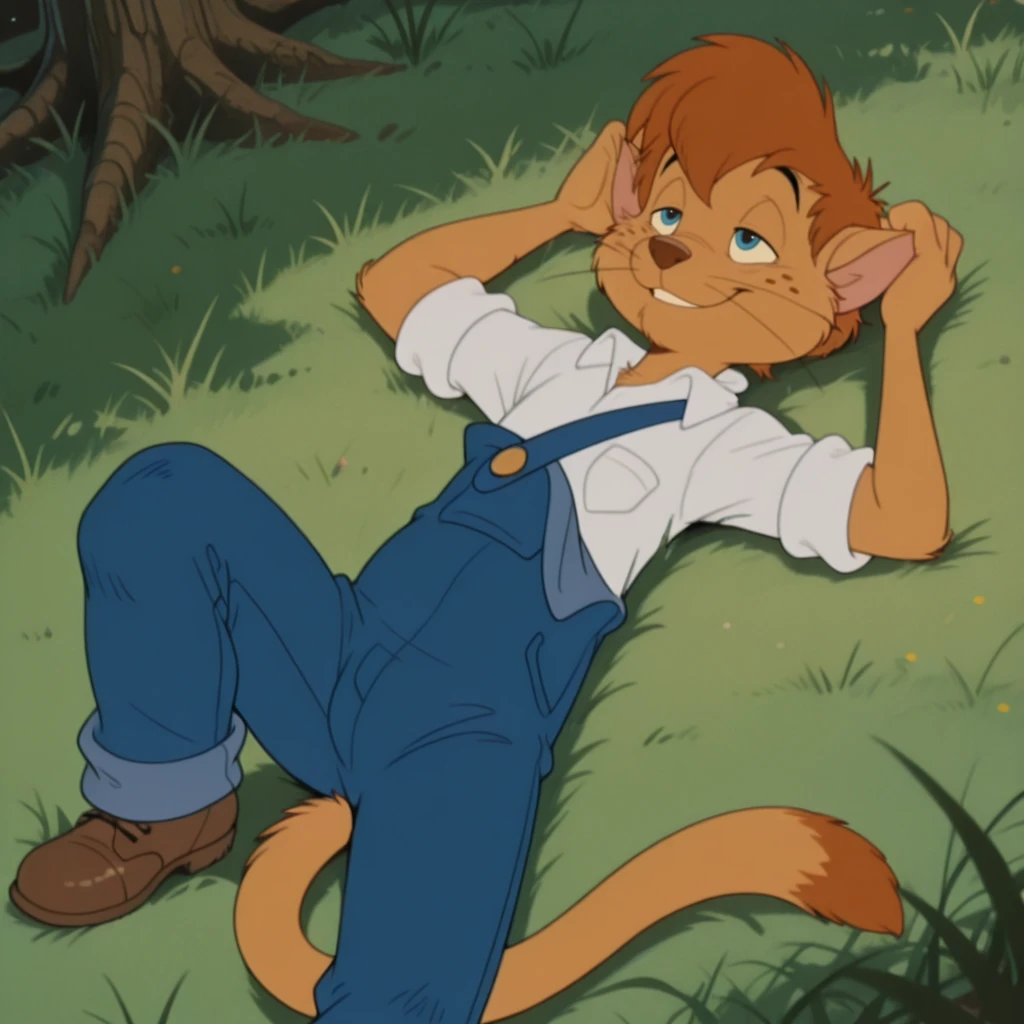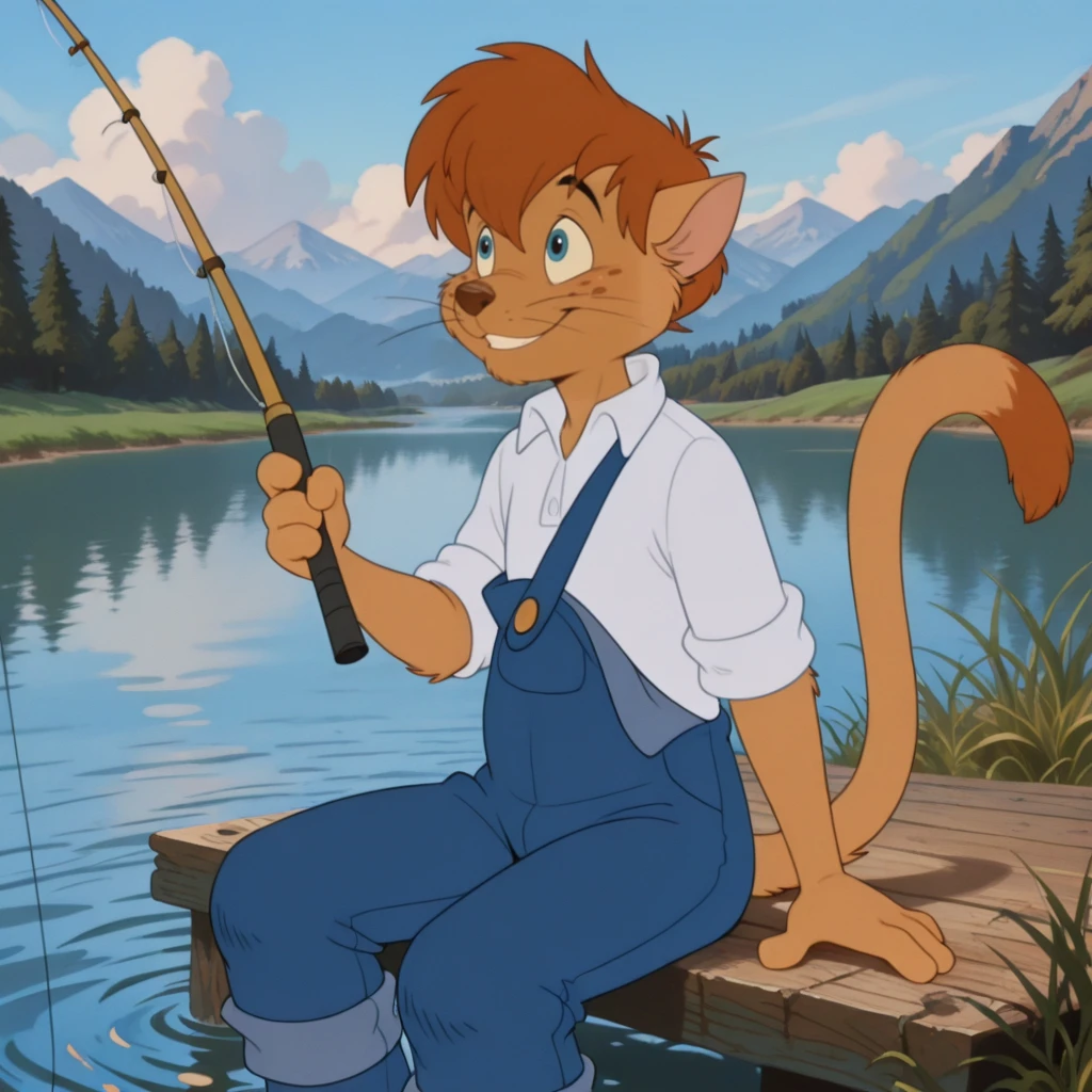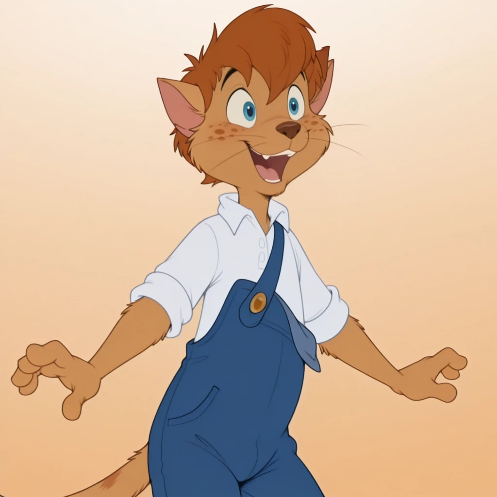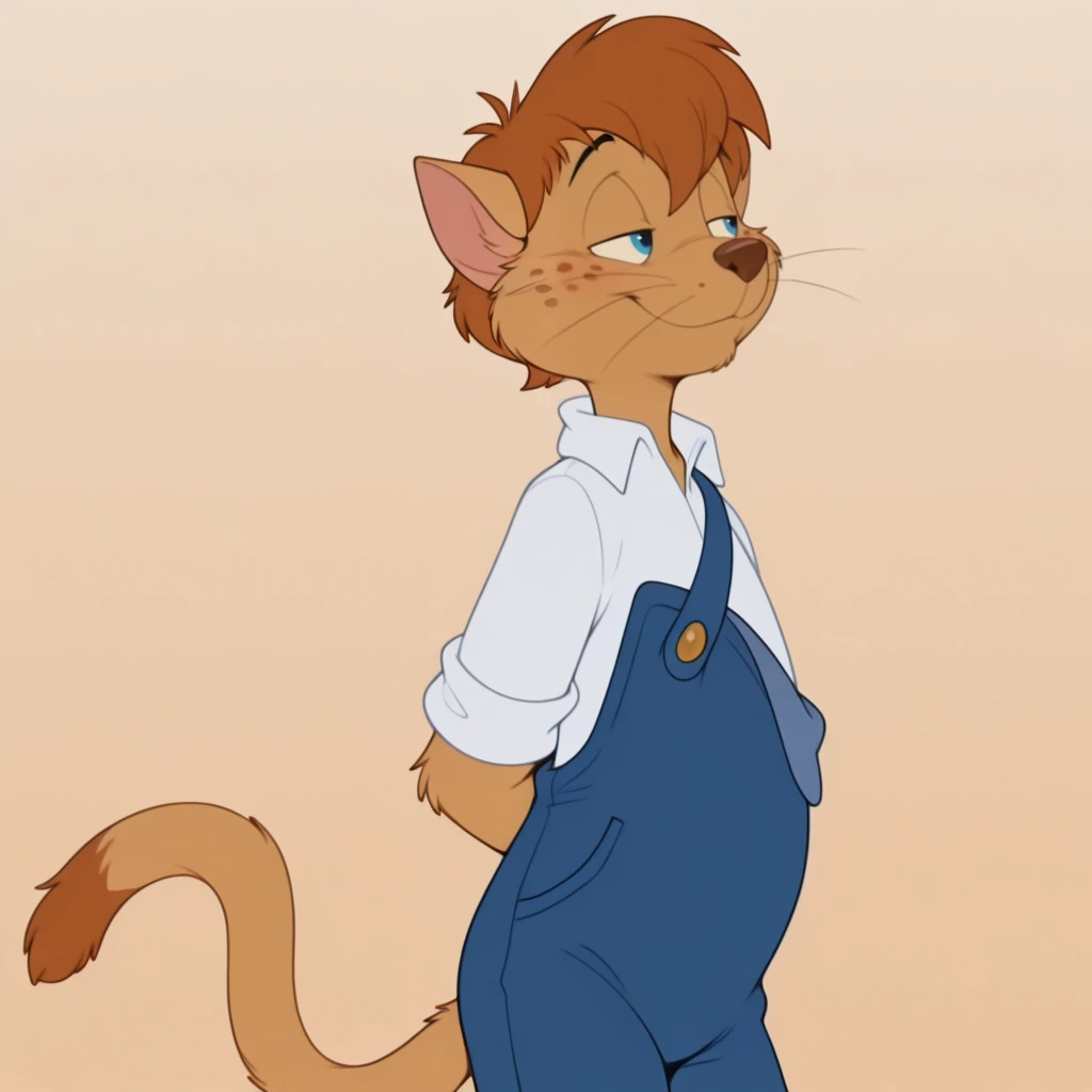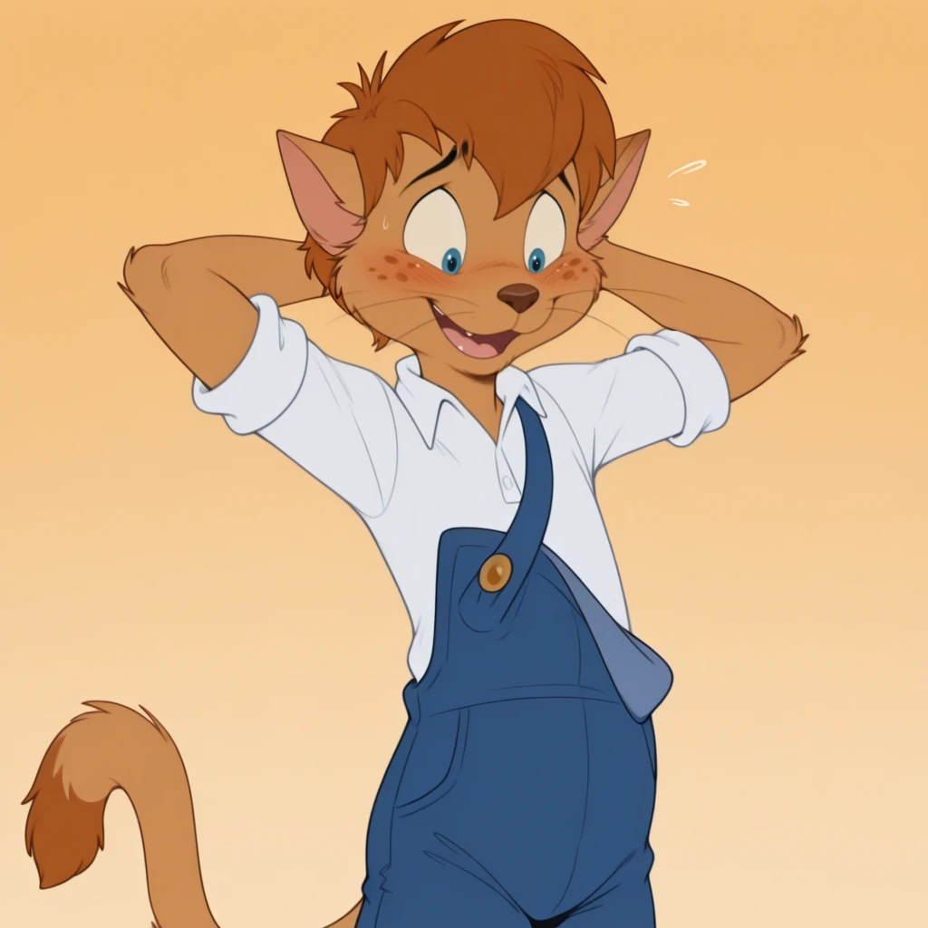 1boy, male, furry, anthro, cat, solo, brown hair, short hair, tan fur, blue eyes, brown nose, freckles, whiskers, cat ears, tail, dipstick tail