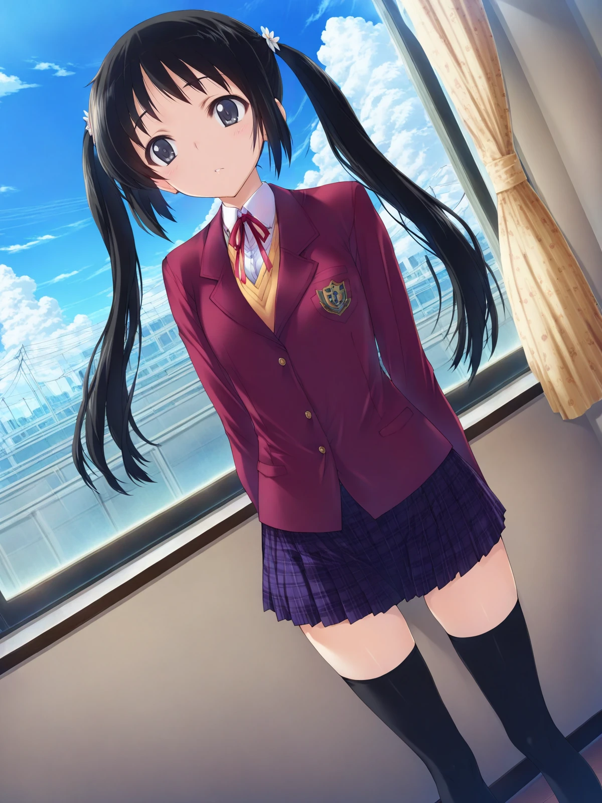 mana-mizuki, twintails, black hair, long hair, black eyes, hair flower,