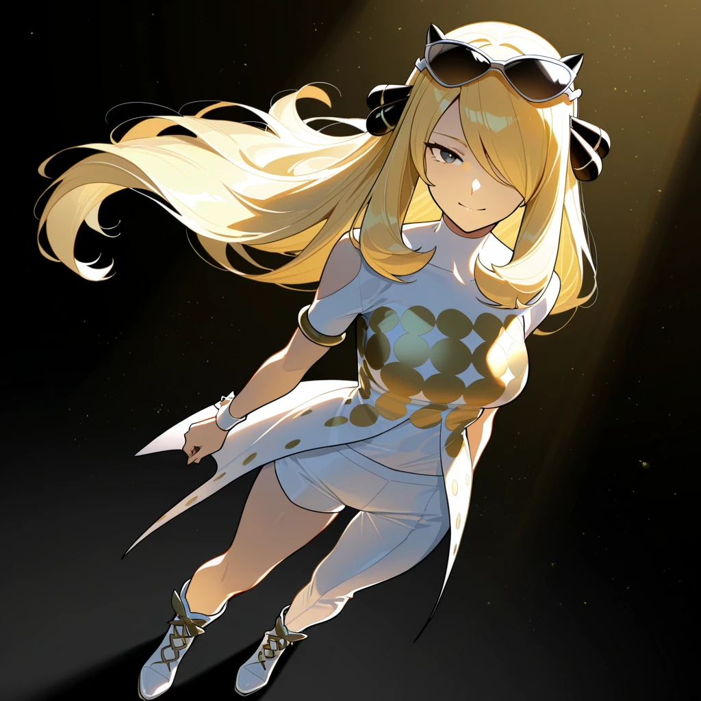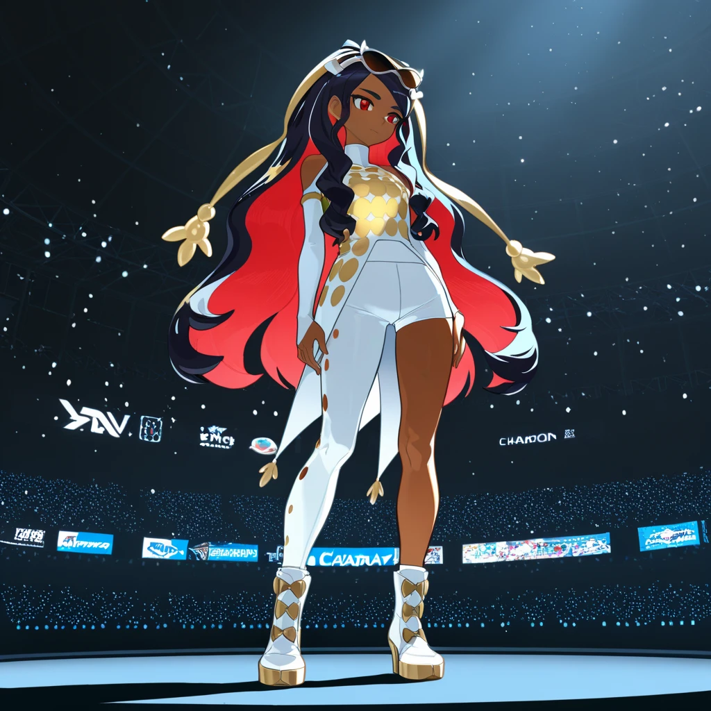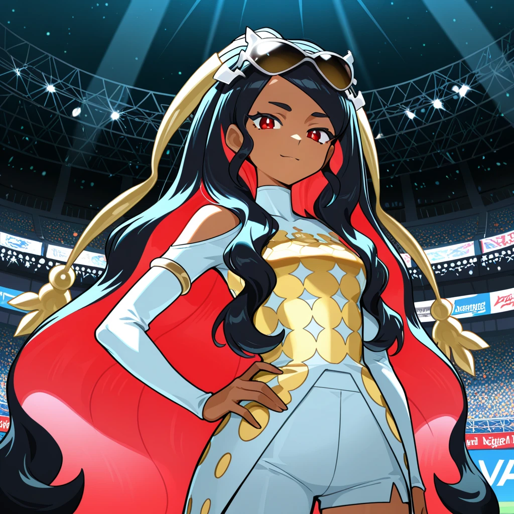 • champion dress, diva sunglasses, eyewear on head, hair extension decoration, elbow gloves, shoulder vent, asymmetric pants, asymmetric shorts