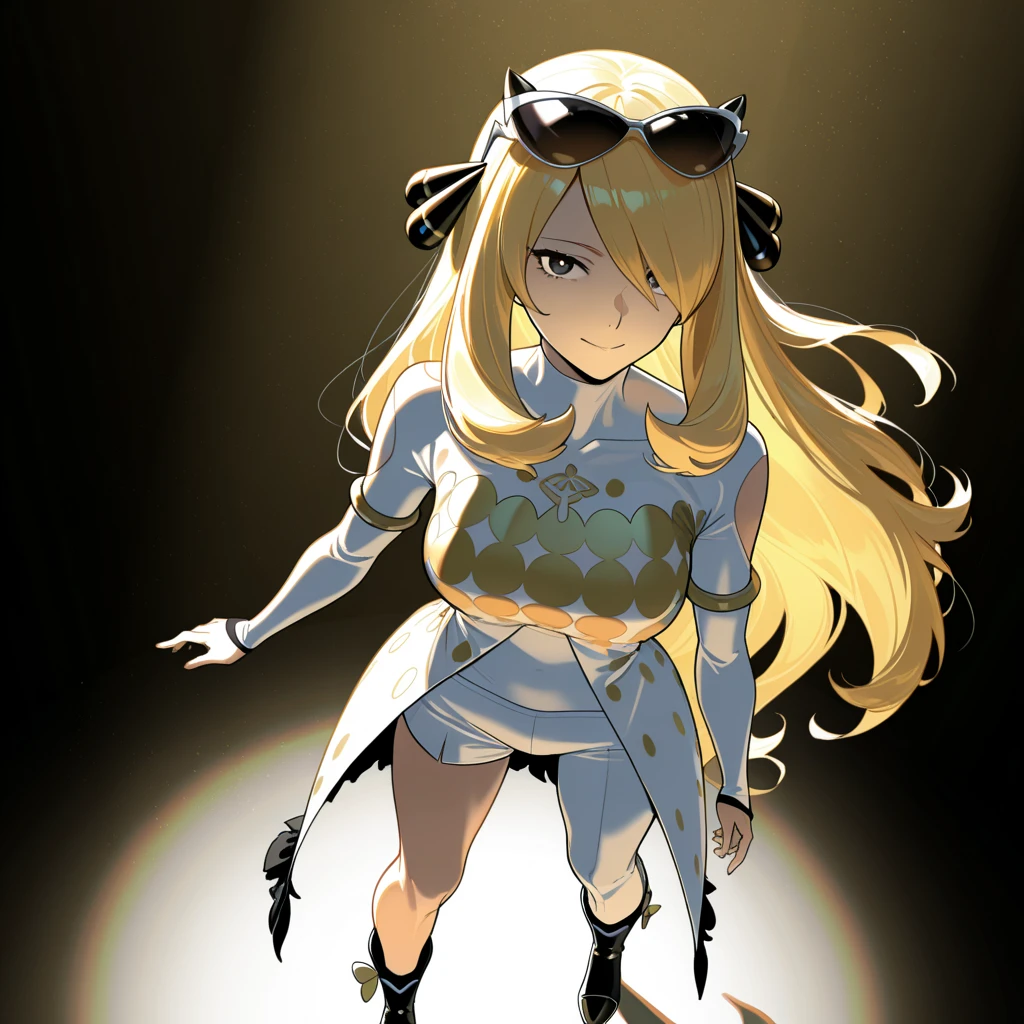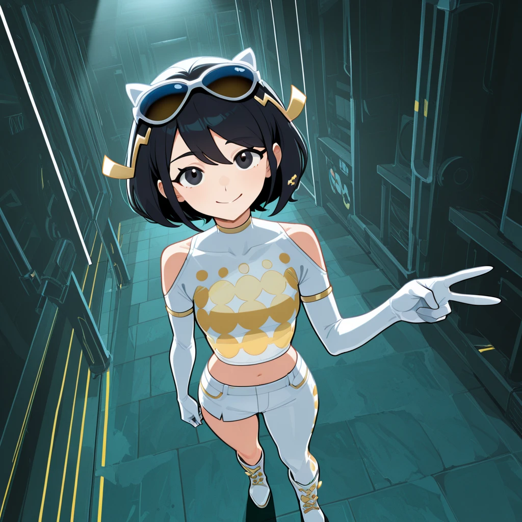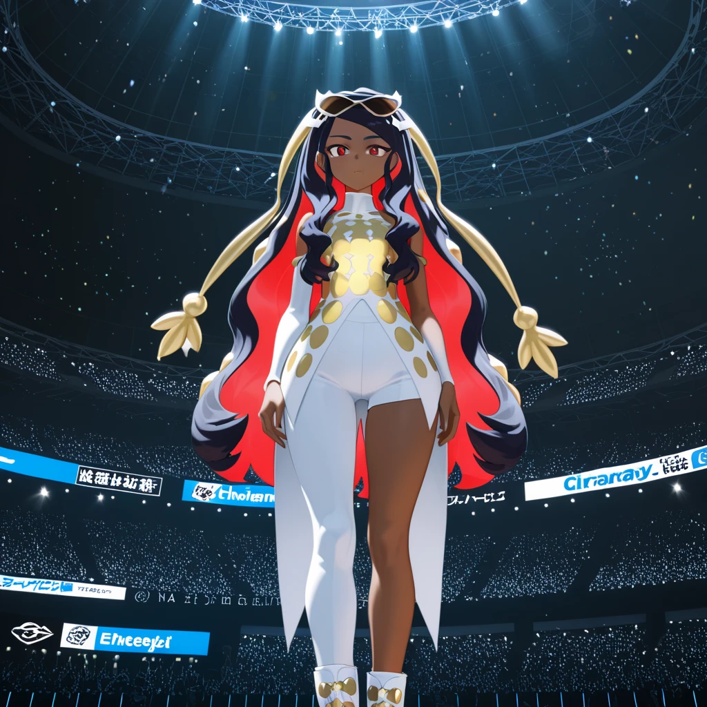 • champion dress, diva sunglasses, eyewear on head, hair extension decoration, elbow gloves, shoulder vent, asymmetric pants, asymmetric shorts