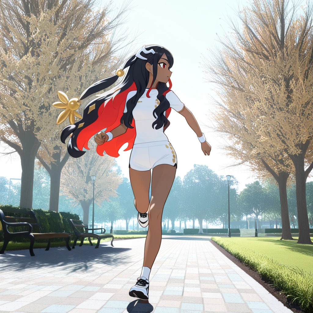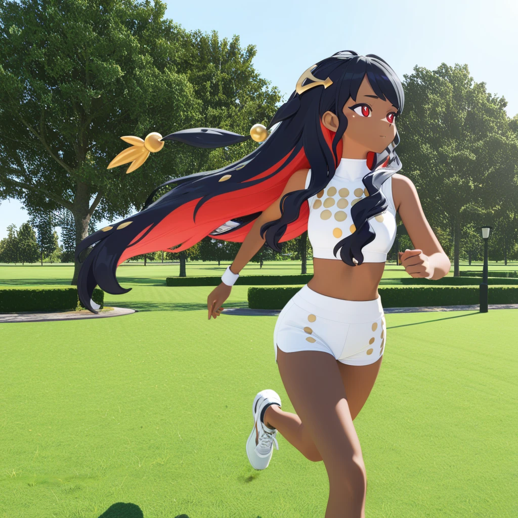 • dark skin, long hair, black hair, multicolored hair, two-tone hair, red eyes