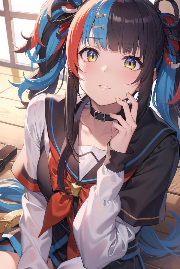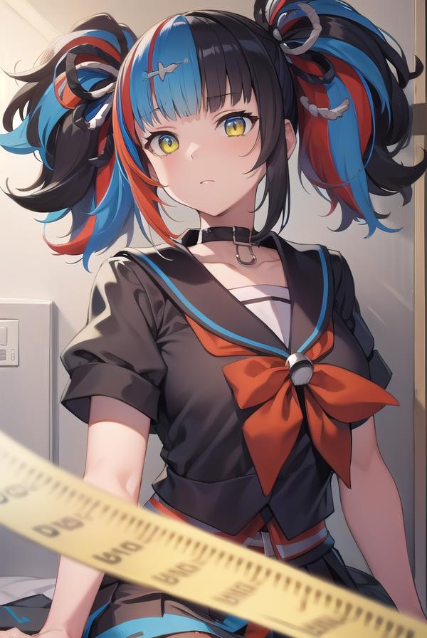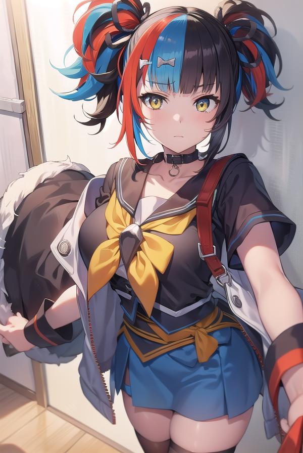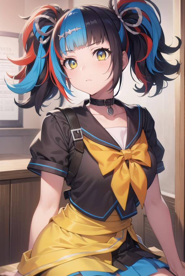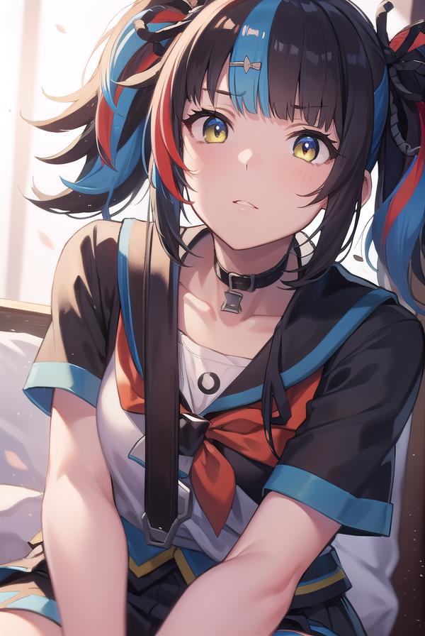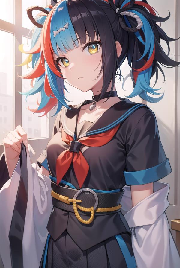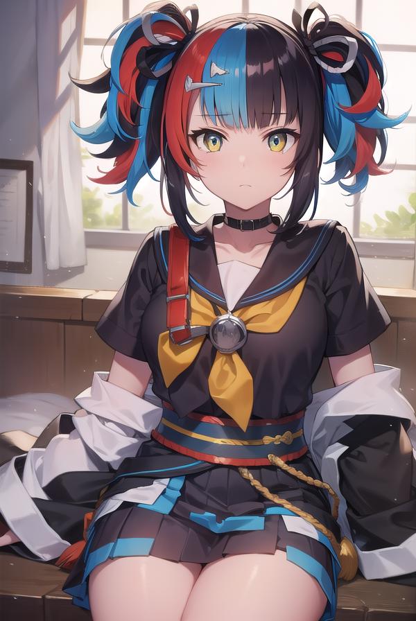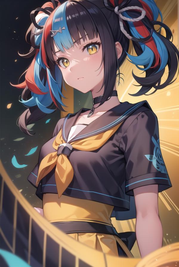 sei shounagon, aqua hair, black hair, blunt bangs, multicolored hair, red hair, twintails, (brown eyes:1.5),