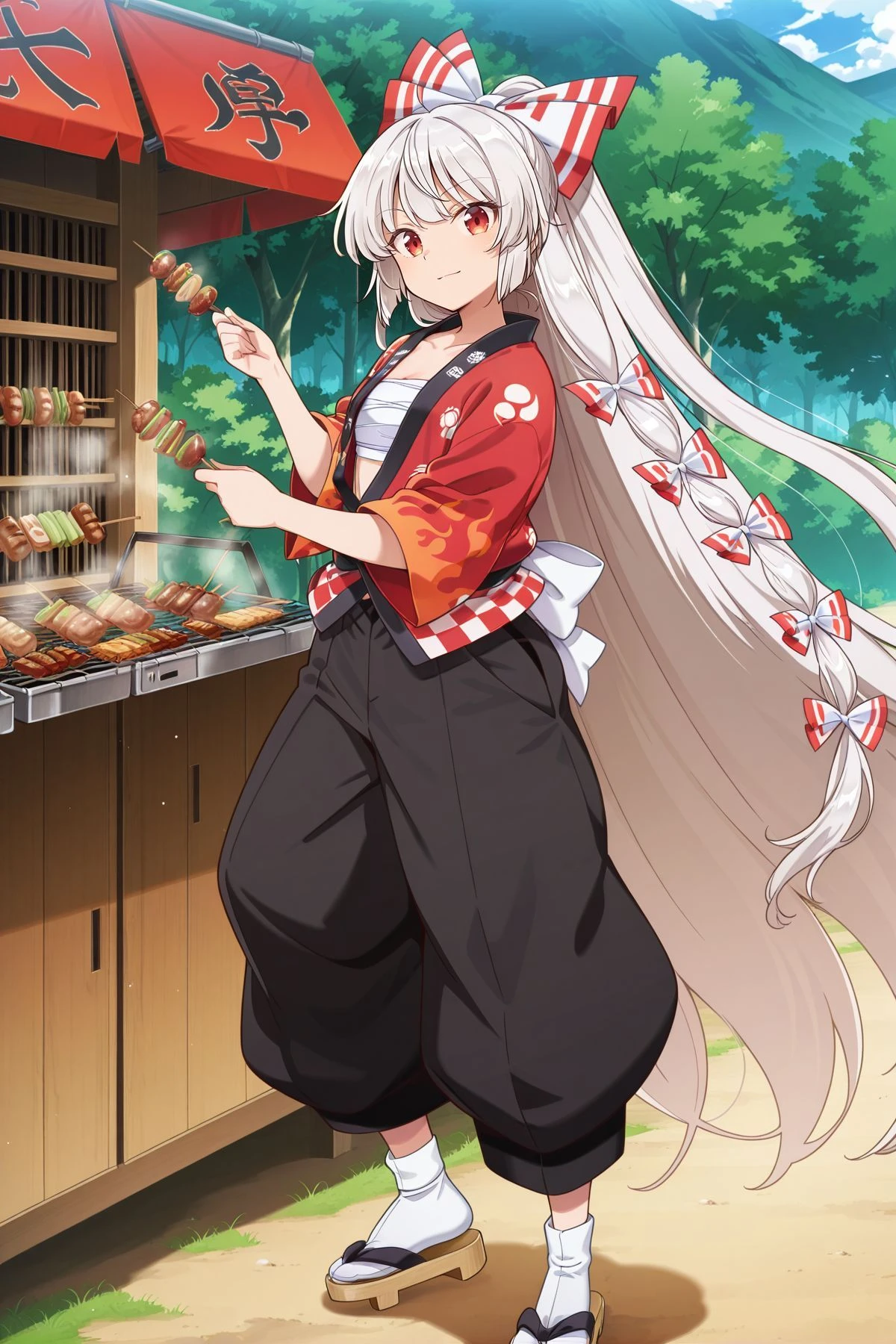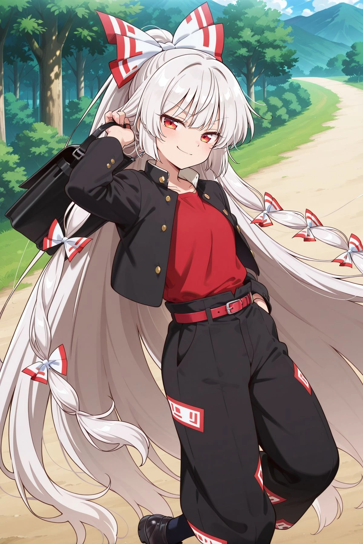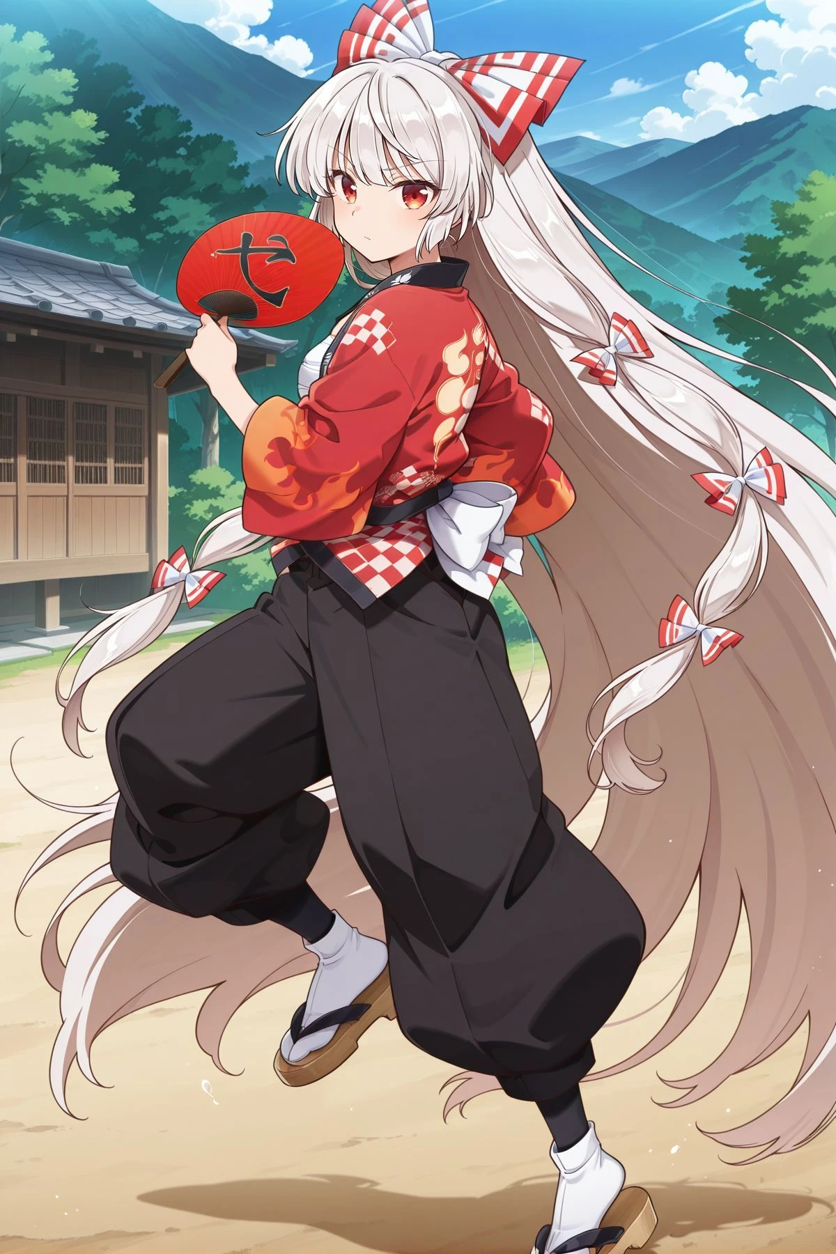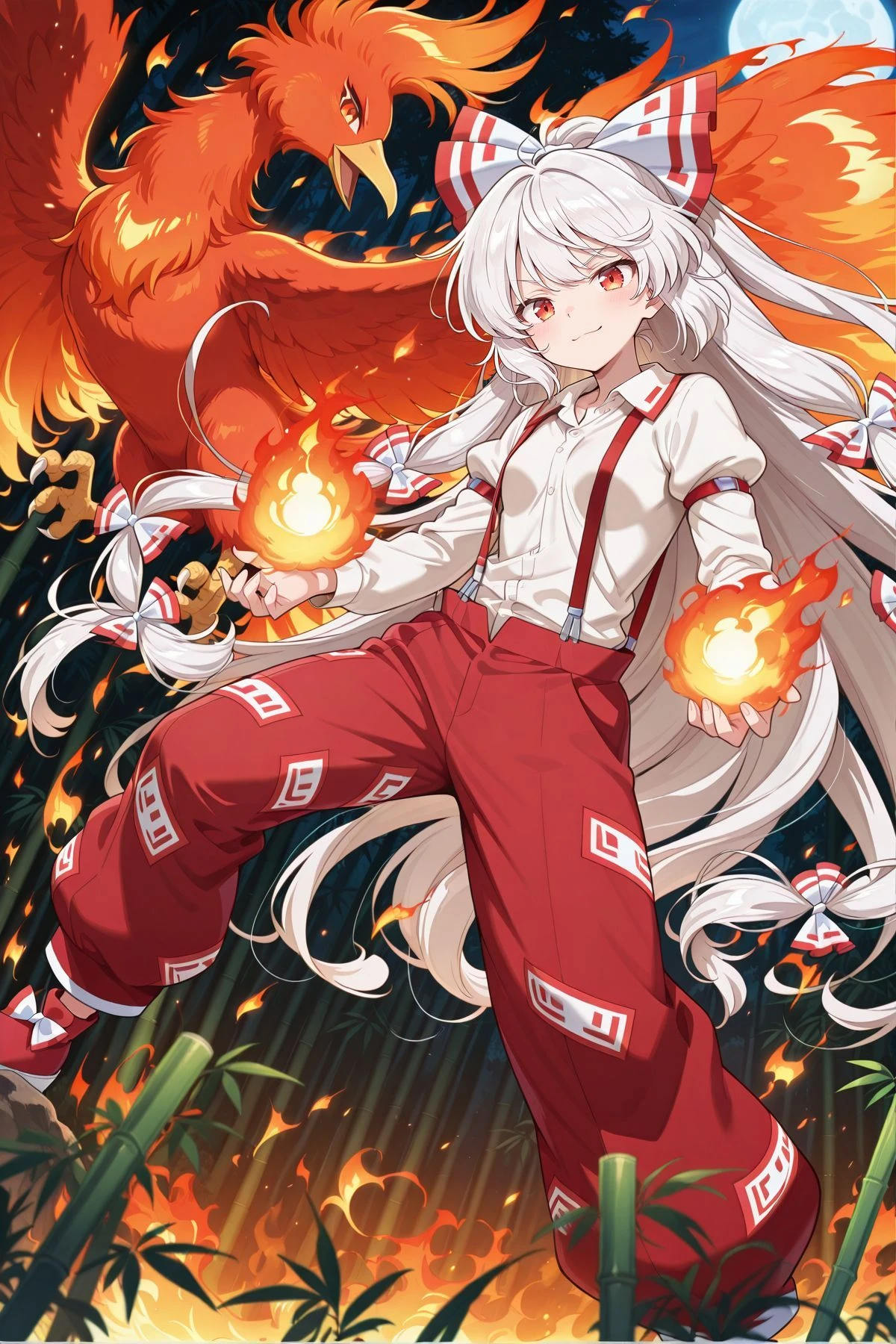 fujiwara no mokou, 1girl, solo, red eyes, white hair, very long hair, small breasts,hair bow, white bow, multiple hair bows, white shirt, long sleeves, red suspenders, red pants, red shoes,Optional :