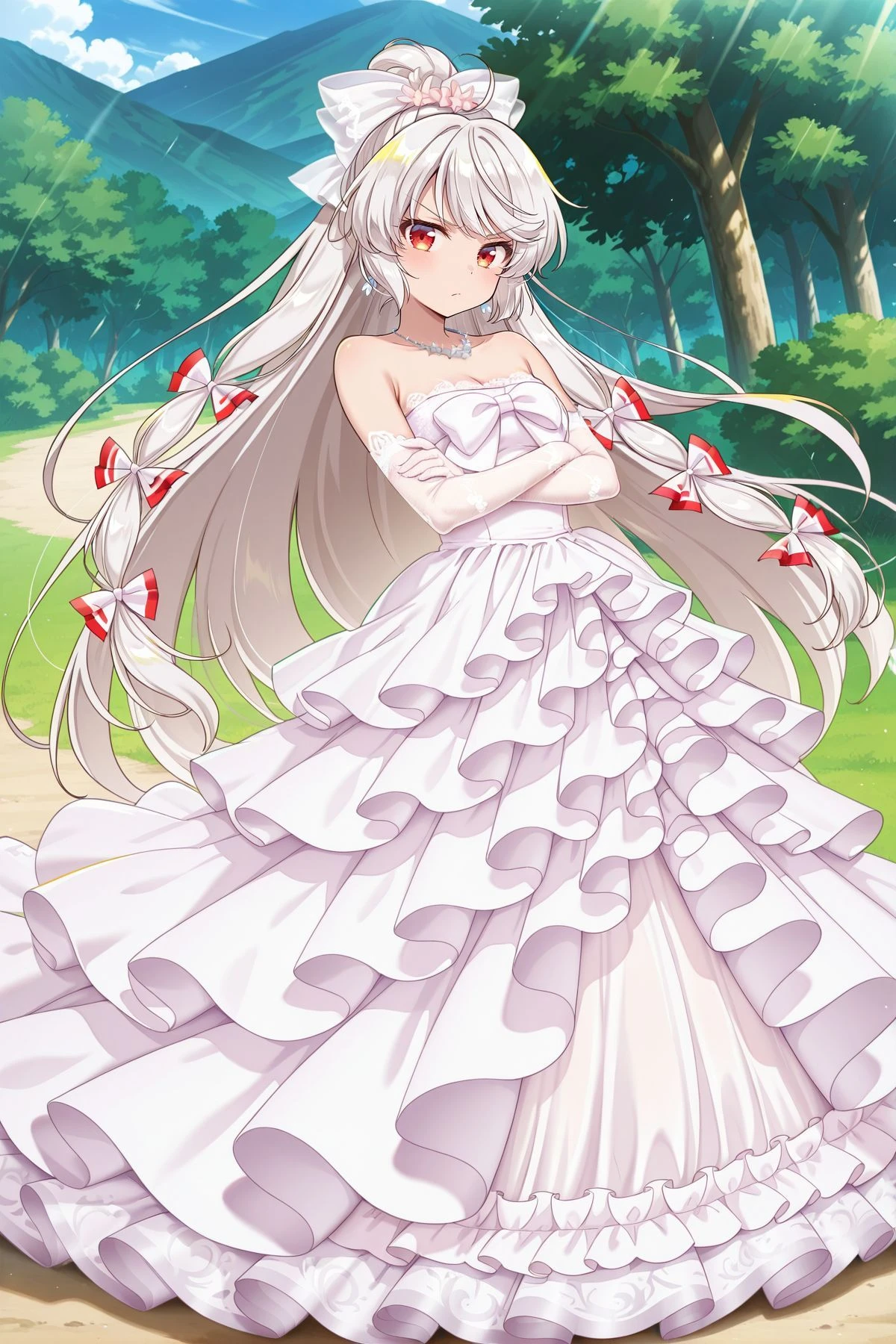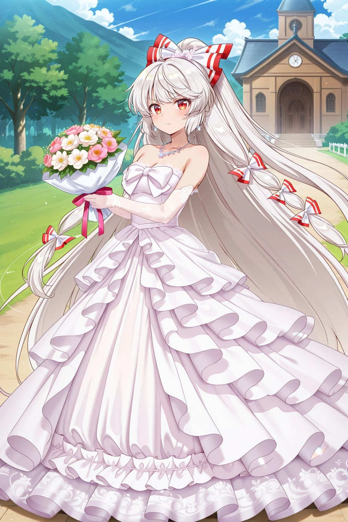fujiwara no mokou, 1girl, solo, red eyes, white hair, very long hair,, fujiwara no mokou (burning white phoenix), alternate costume, alternate hairstyle, hair bun, hair bow, pink bow, tress ribbon, necklace, ???? shoulders, white dress, wedding dress, long dress, strapless dress, white bow, collarbone, white gloves, elbow gloves, holding bouquet,fujiwara no mokou, 1girl, solo, red eyes, white hair, very long hair,, fujiwara no mokou (fiery and solitary student), alternate costume, hair bow, black jacket, open jacket, red shirt, black pants, red belt, holding bag,fujiwara no mokou, 1girl, solo, red eyes, white hair, very long hair,, fujiwara no mokou \(yakitori stand chef\), alternate costume, hair bow, red shirt, checkered print, long sleeves,, brown pants, hand fan, japanese clothes,fujiwara no mokou \(silver gale\), cape, black cape, torn cape, torn clothes, torn shirt, hair bow, white bow, white shirt, long sleeves, suspenders, red pants, footwear bow, red footwear, Optional :
