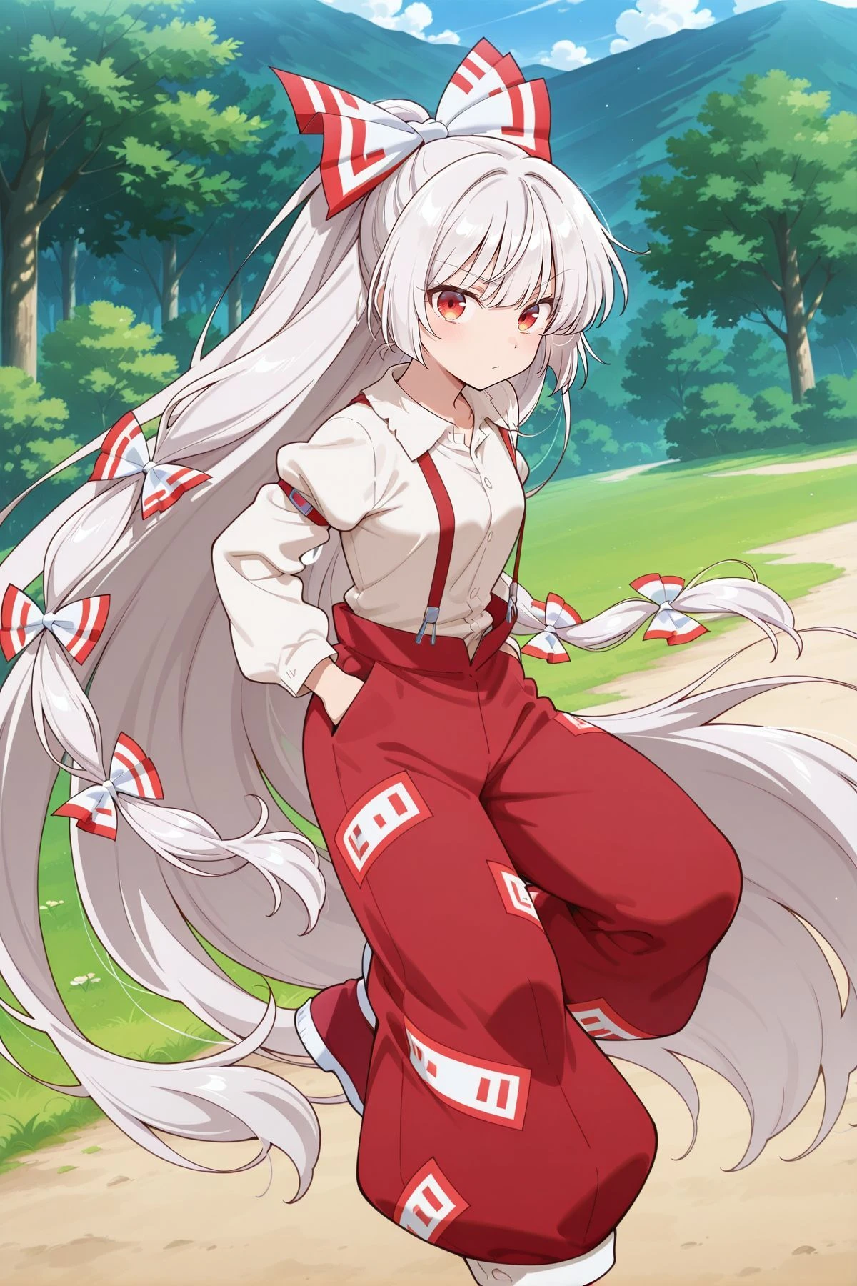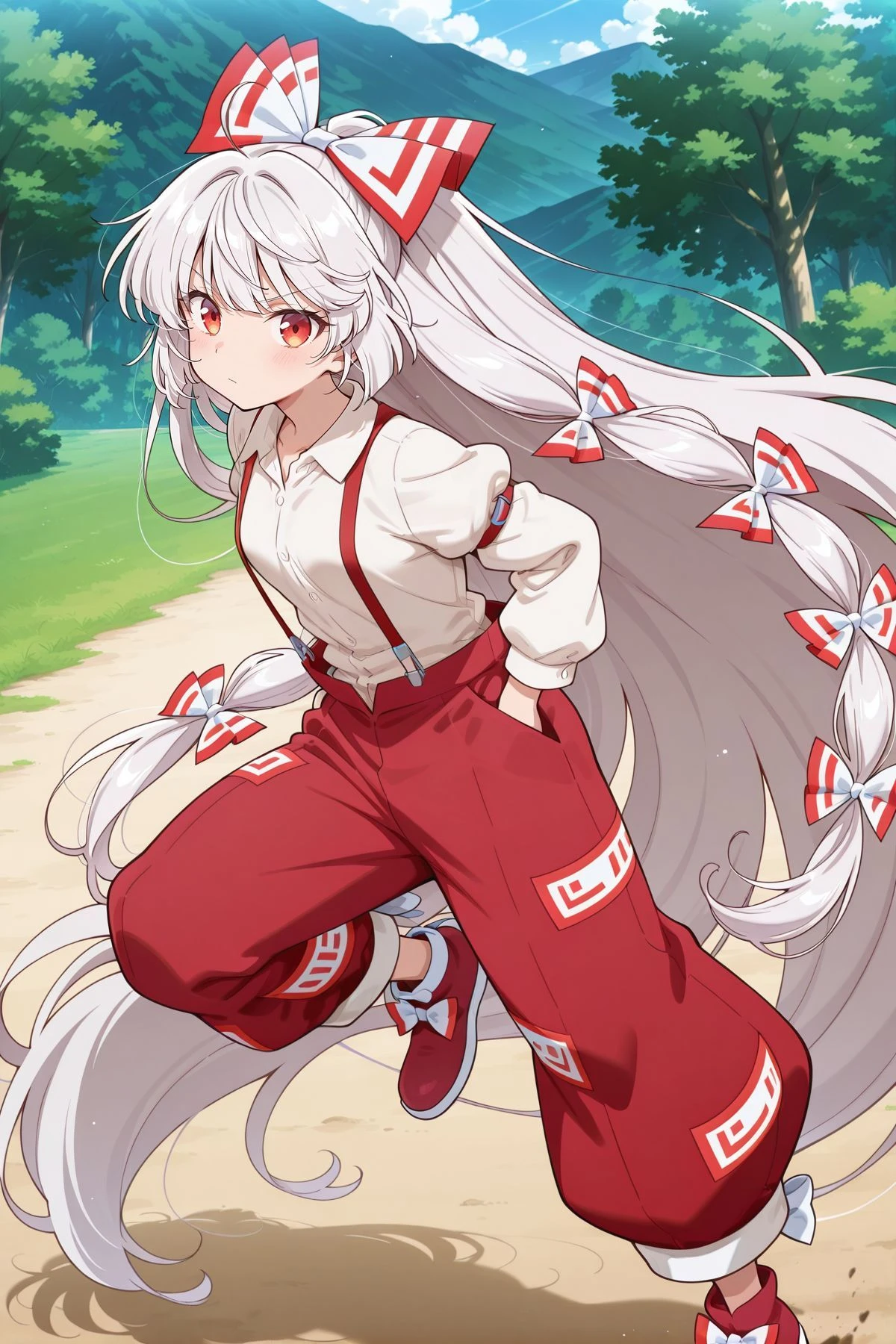 fujiwara no mokou, 1girl, solo, red eyes, white hair, very long hair,hair bow, white bow, multiple hair bows, white shirt, long sleeves, red suspenders, red pants, red shoes,Optional :
