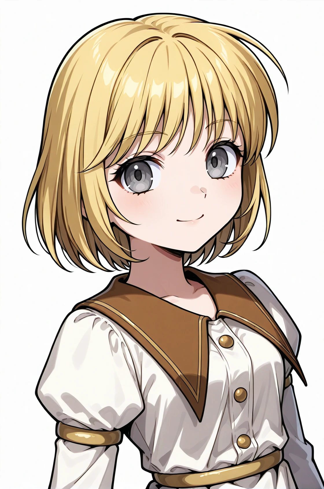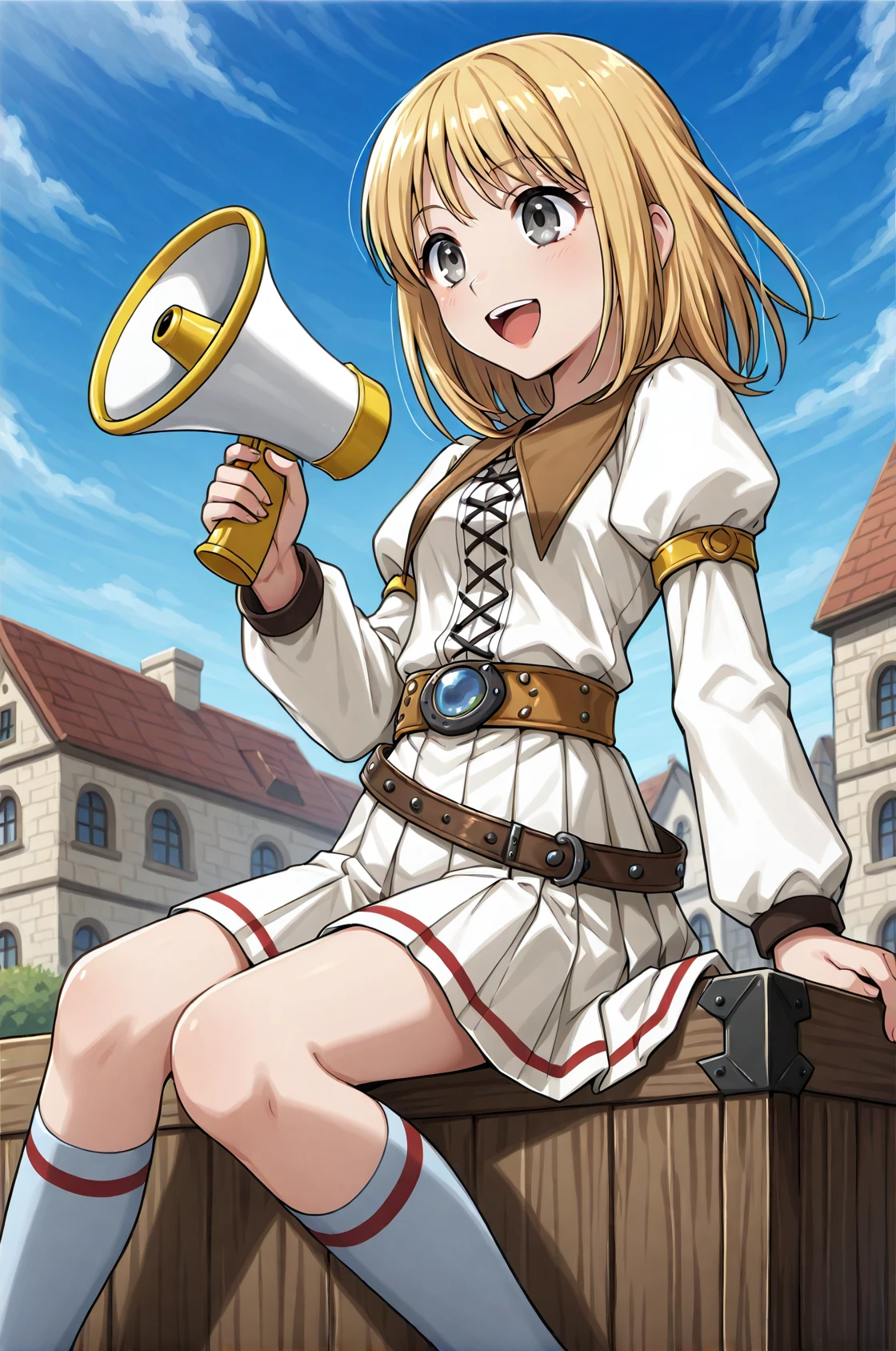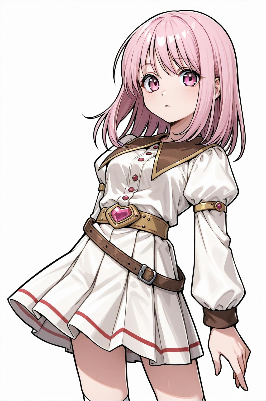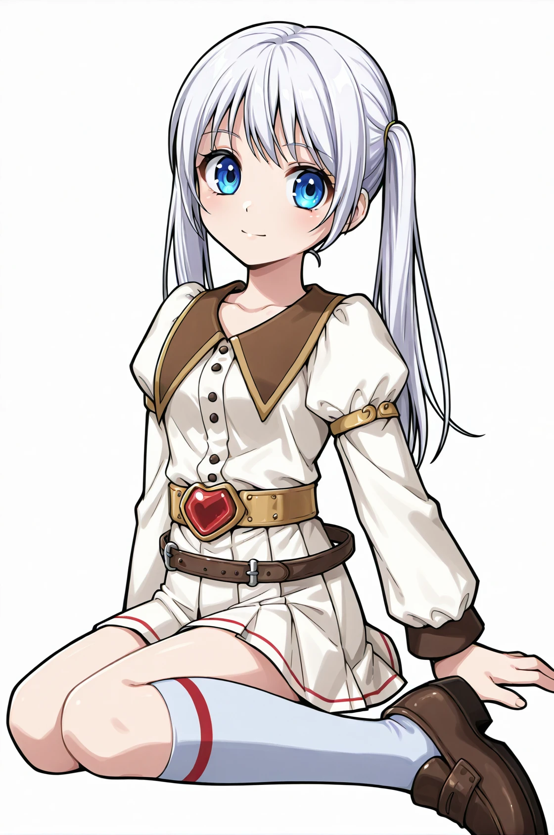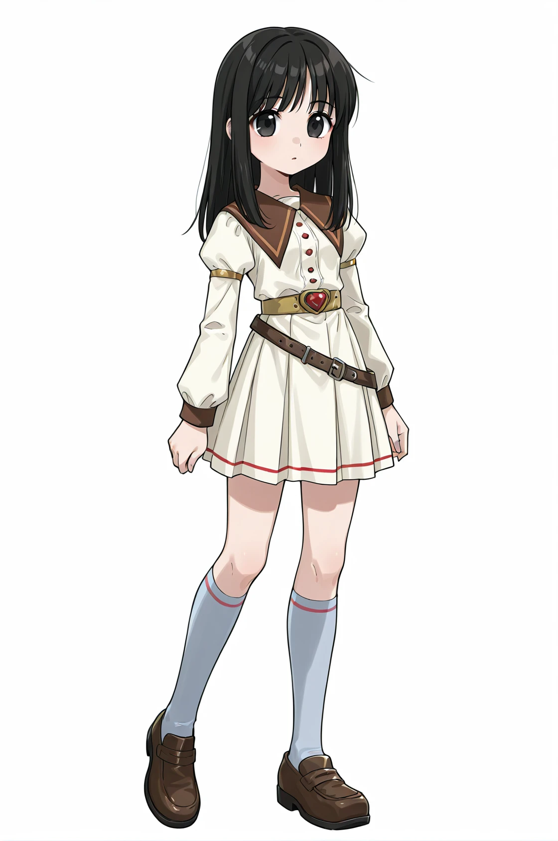 prompt: gmRO, brown neckline, white dress, long sleeves, puffy sleeves, pleated skirt, belt, kneehighs, socks, shoes,