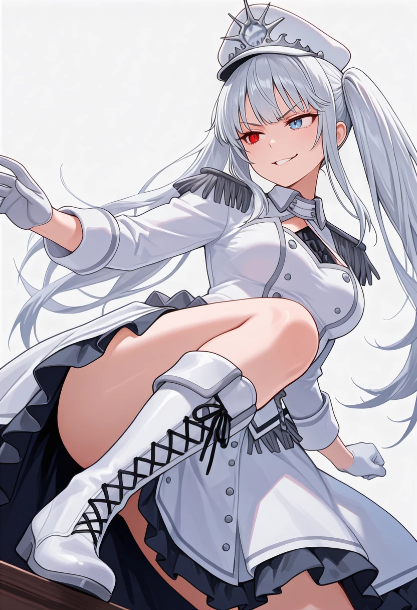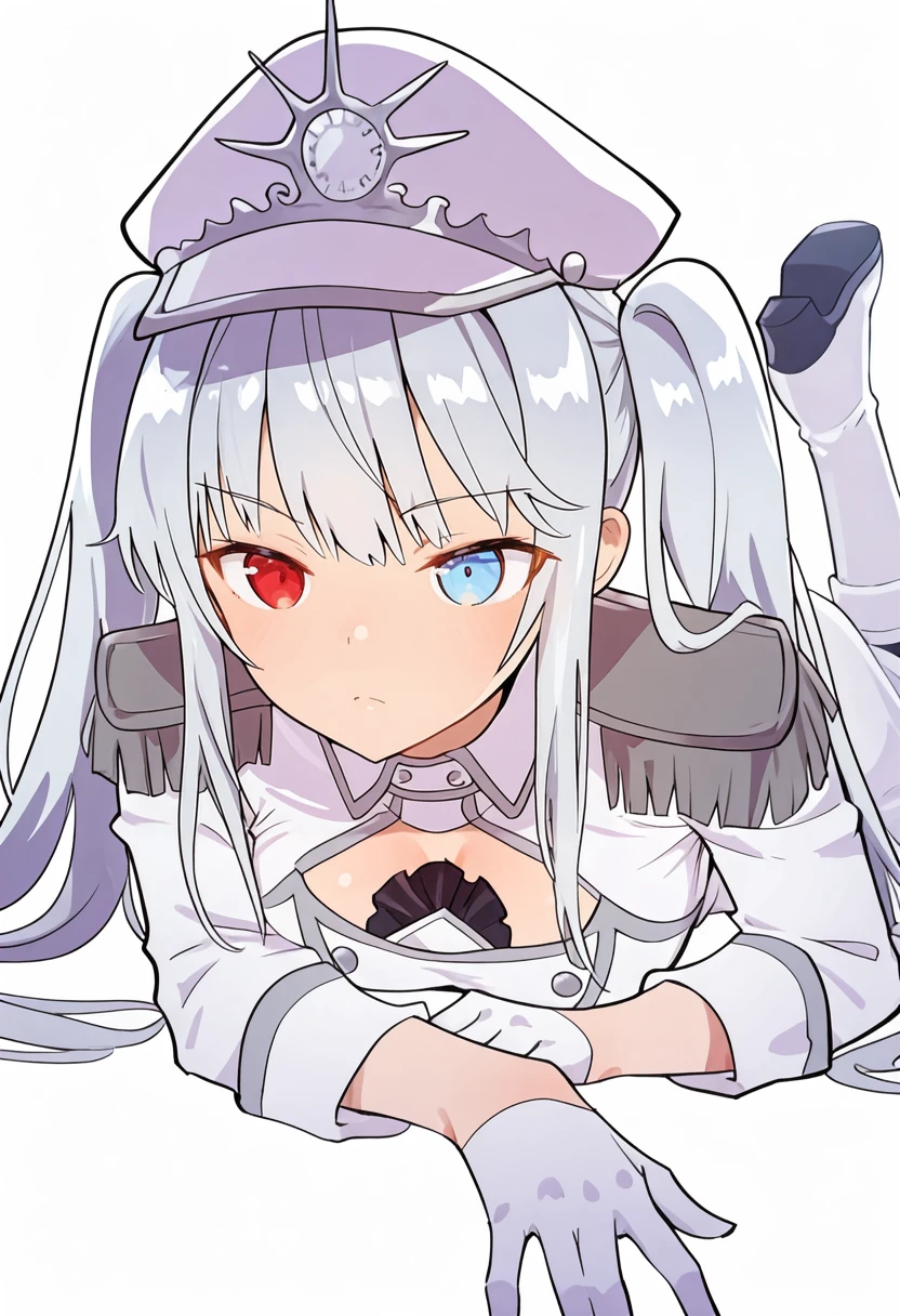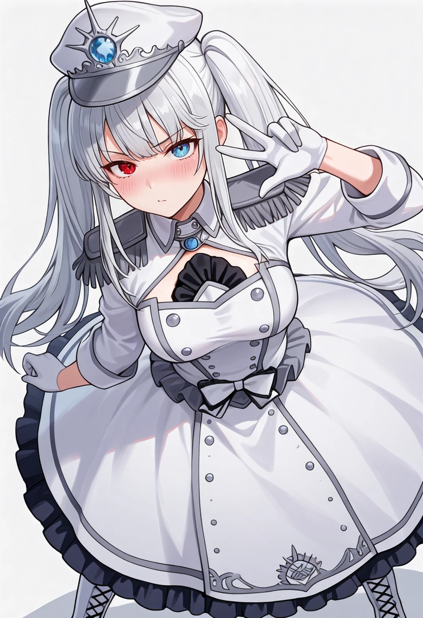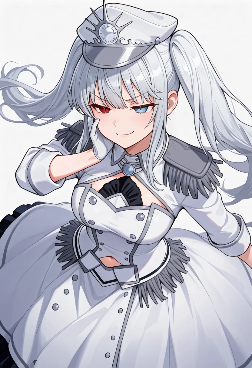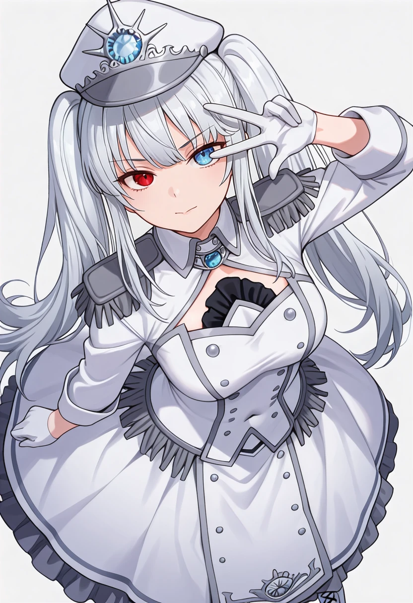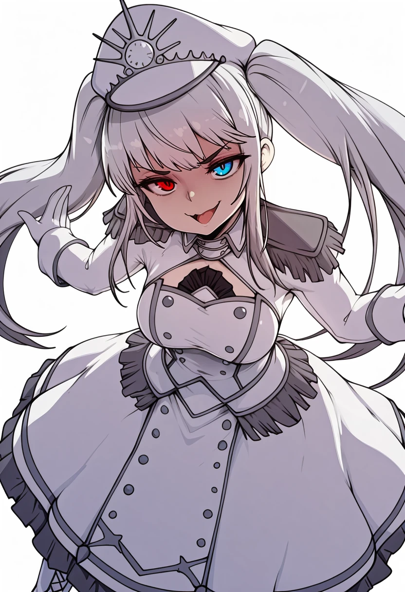 queen_cnr, 1girl, long hair, twintails, grey hair, blue eyes, heterochromia, red eyes, white hair, medium breasts, sidelocks,