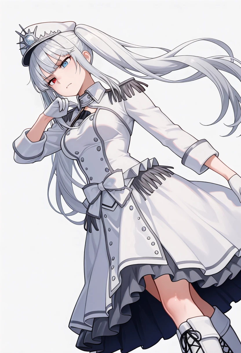 epaulettes,white uniform,large dress, white gloves, long sleeves,white peaked cap,boots,