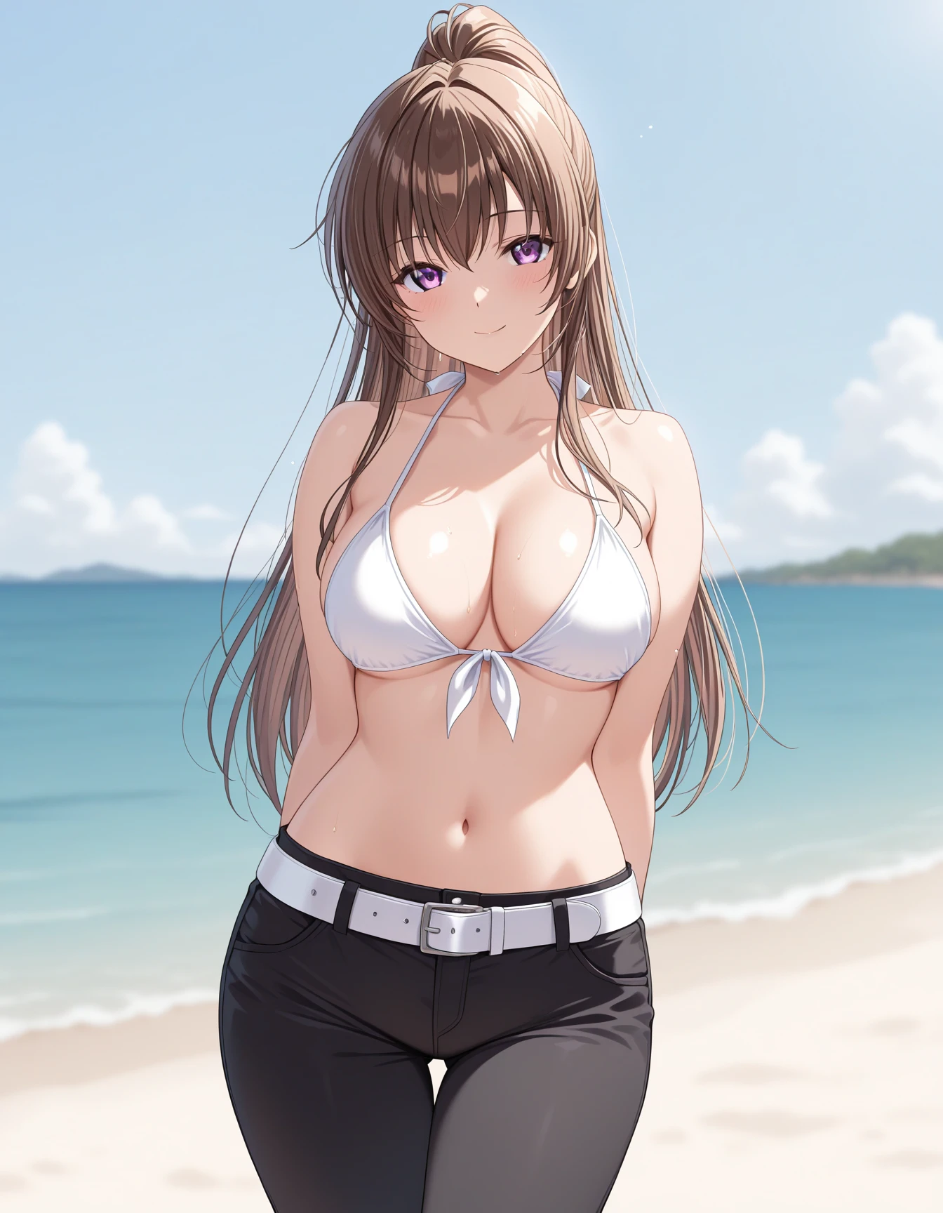 white bikini top, front-tie bikini top, halterneck, midriff, black pants, white belt