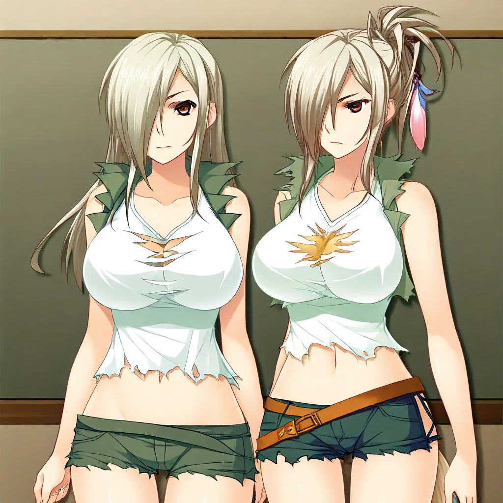 kitsune-casual, hair feather, white shirt, green vest, open vest, sleeveless, ripped clothes, midriff, short shorts, denim shorts, belt,