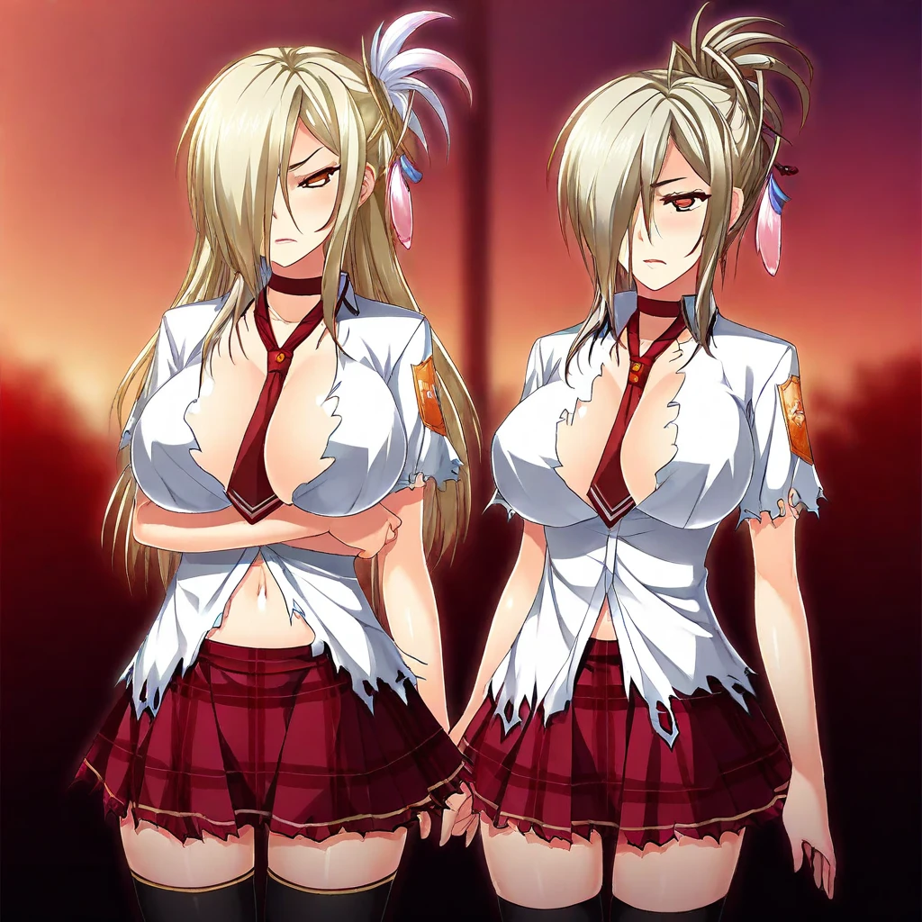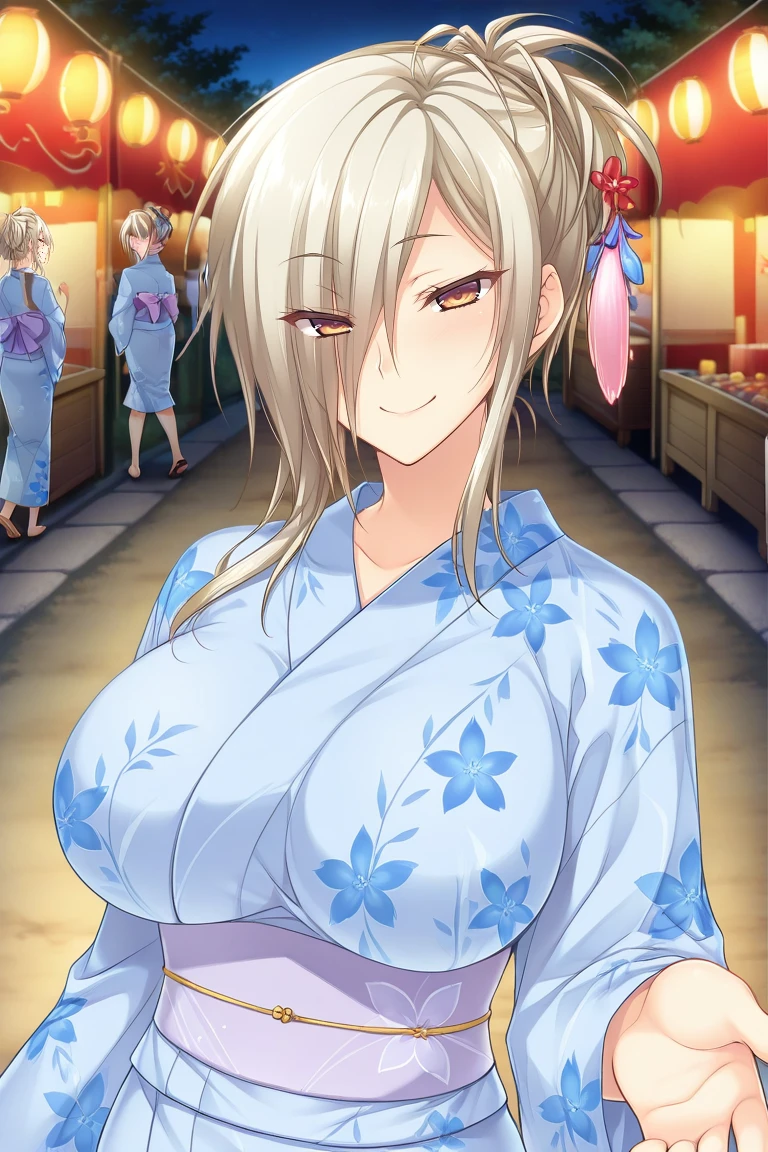 blond hair, long hair, sidelocks, hair over one eye, updo, amber eyes, large breasts,