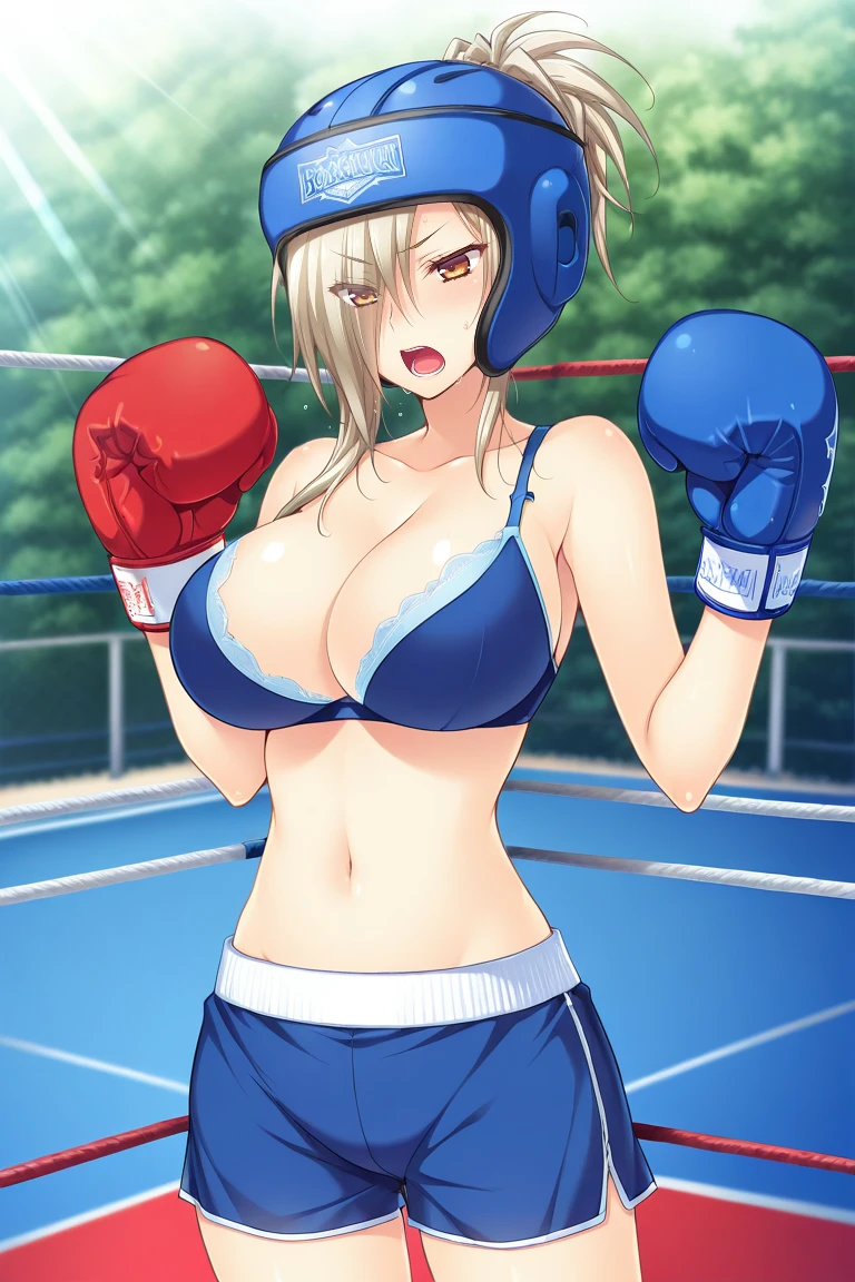 kitsune-boxing, headgear, blue bra, blue shorts, boxing gloves,