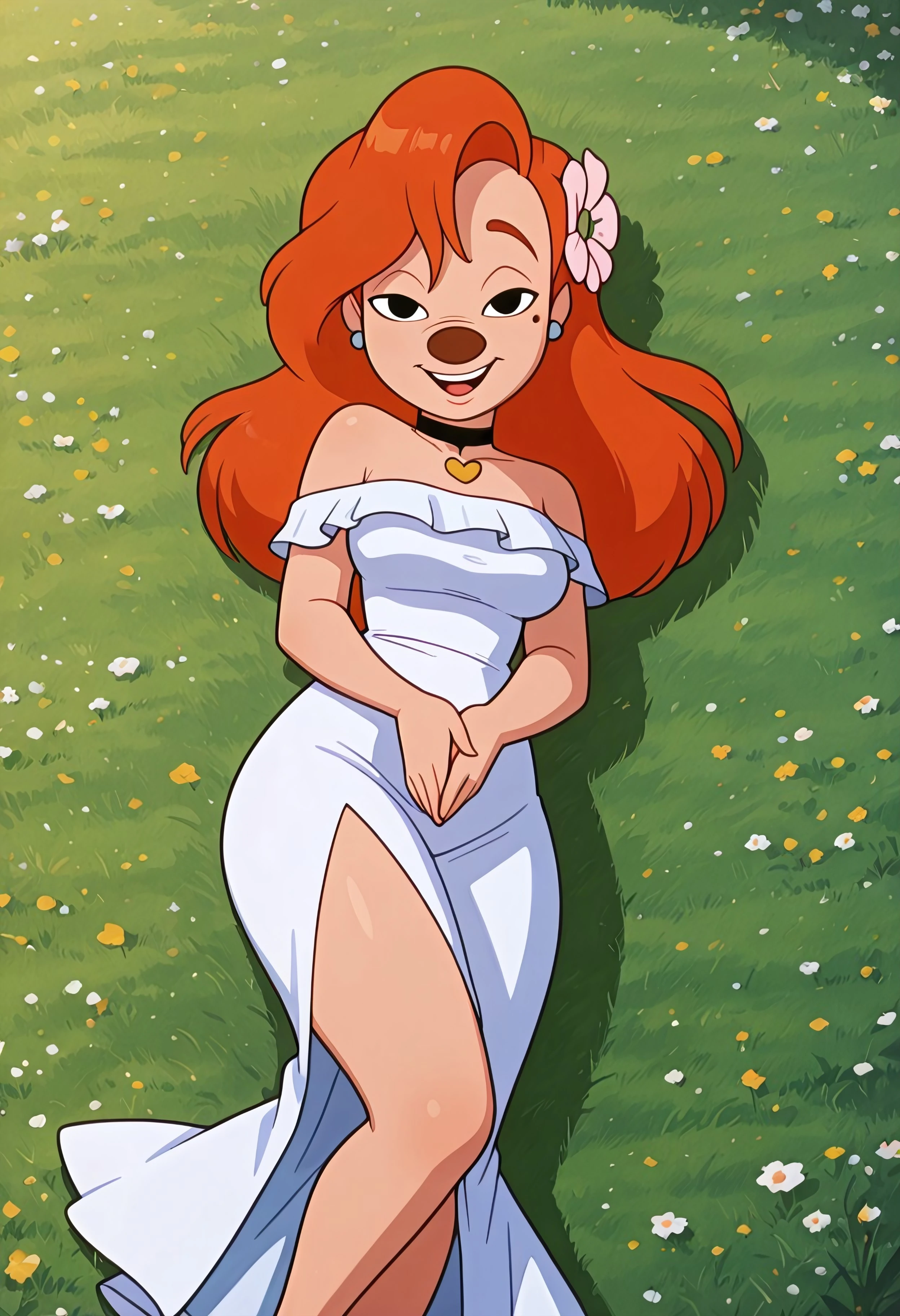 jewelry, dress, hair flower, hair ornament, necklace, bare shoulders, choker, white dress