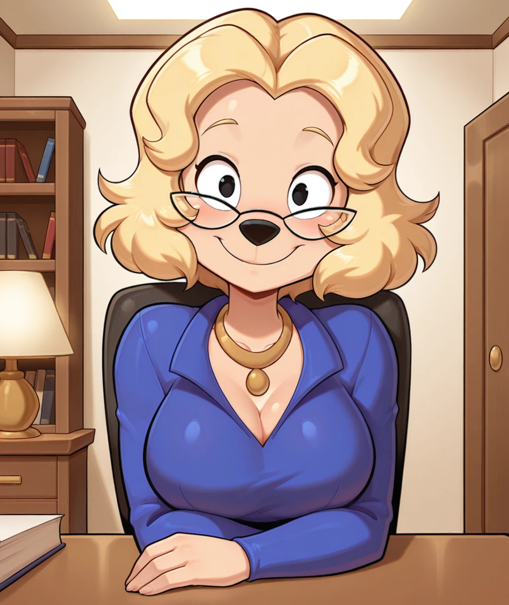furry female, animal nose, black eyes, blonde hair, curly hair, short hair