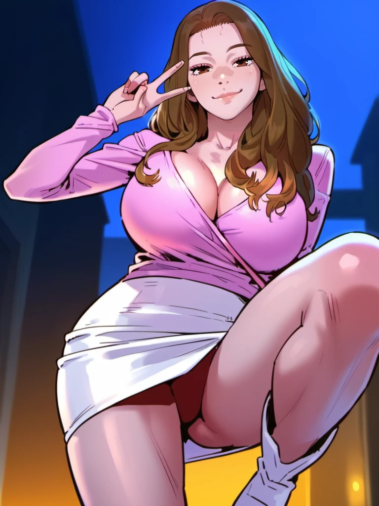 Gayoung, 1girl, brown hair, brown eyes, long hair, white skirt, jewelry, earrings, purple shirt, no bra, cleavage, pencil skirt, long sleeves, high-waist skirt,