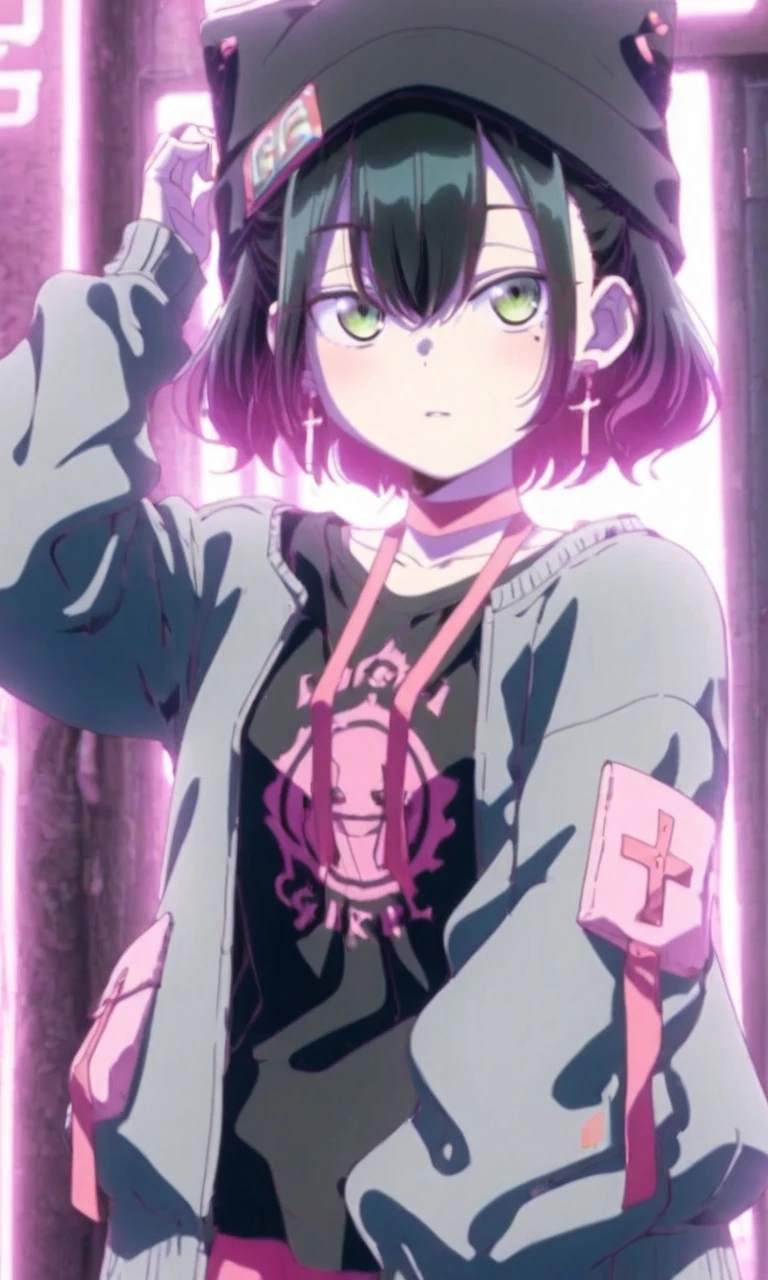 badgirl1ed, Rura Ruriha, black hair, multicolored hair, hair between eyes, short hair, bangs, green eyes, mole under eye, pink string choker around the neck, jewelry, black cat ears headwear, cross earrings, long sleeves, gray hoodie with pink pocket, open hoodie, black T-shirt with pink stars, pink skirt,