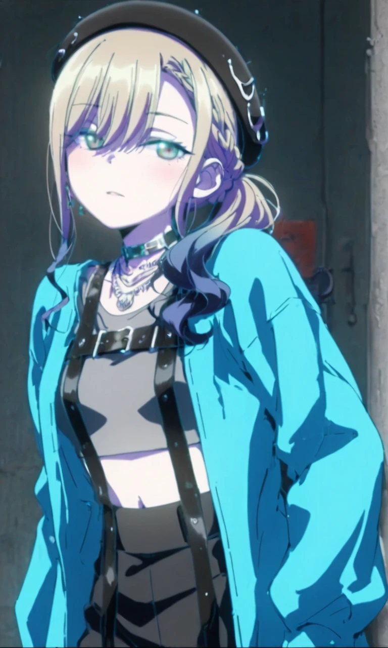 badgirl1ed, Suzu Suzukaze, blonde hair, long hair, multicolored hair, gradient hair, sidelocks, braid, side ponytail, blue gradient eyes, black beret, chokers, necklaces, suspenders, blue coat, gray croptop tanktop, midriff, navel baring, black long pants,
