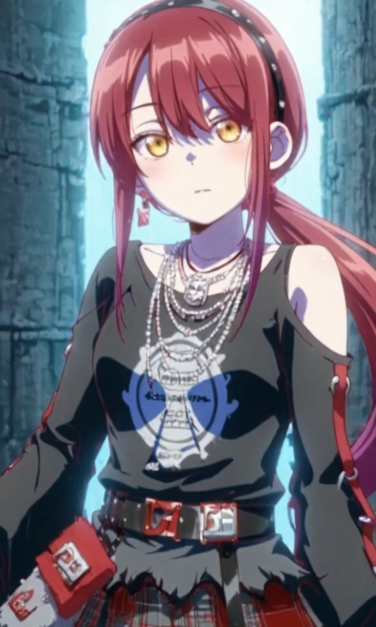 badgirl1ed, Atori Mizutori, red hair, very long hair, low pony tail, hair between eyes, yellow eyes, jewelry, black headband, one shoulder black shirt, torn shirt, shoulder cut shirt, long sleeves, bare one shoulder, necklace, belt, red and gray check skirt,