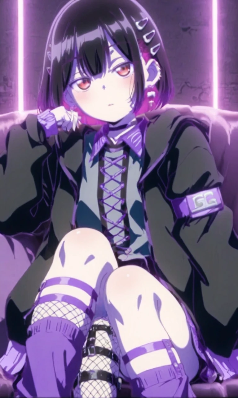 badgirl1ed, Yuu Yuutani, black hair, pink inner hair, multicolored hair, short hair, red eyes, hair ornament, jewelry, earrings, open jacket, bangs, black hooded jacket with purple interior, hairclip, long sleeves, gray shirt, purple skirt, choker, purple garter belt with one-legged fishnet knee-high socks, purple garter belt and purple socks with one-legged,