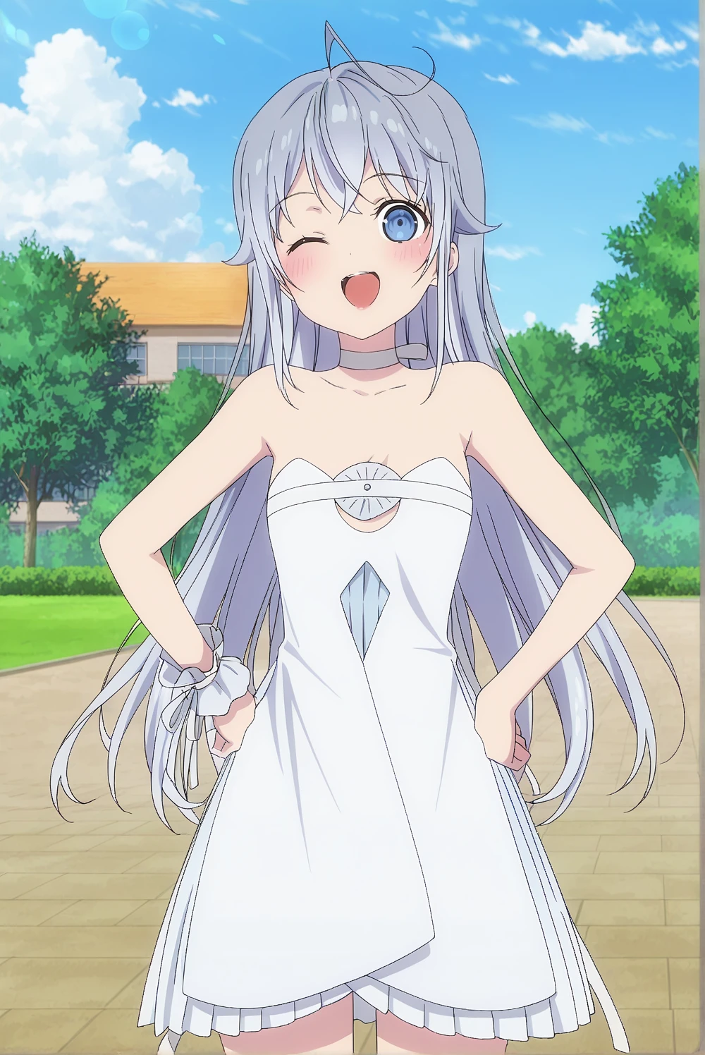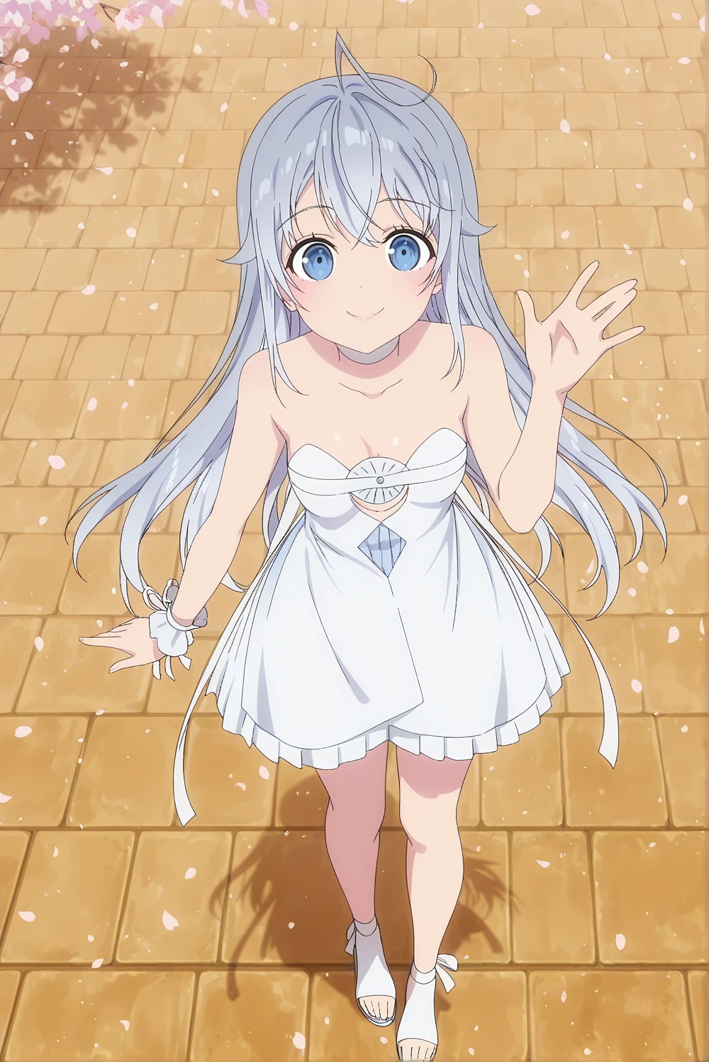Outfit: h1b1k1, def, 1girl, blue eyes, grey hair, ahoge, long hair, choker, white dress, ???? shoulders, strapless, strapless dress, frilled bracelet, sandals