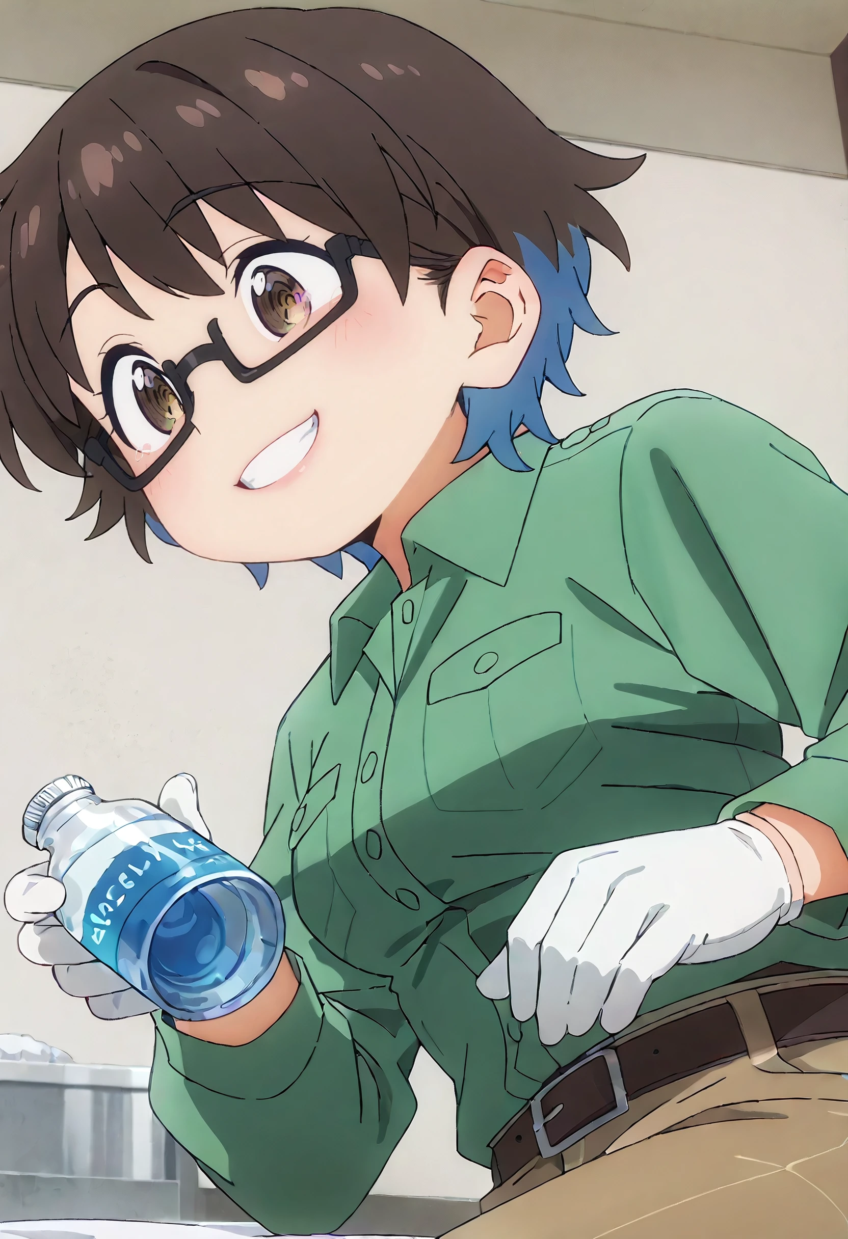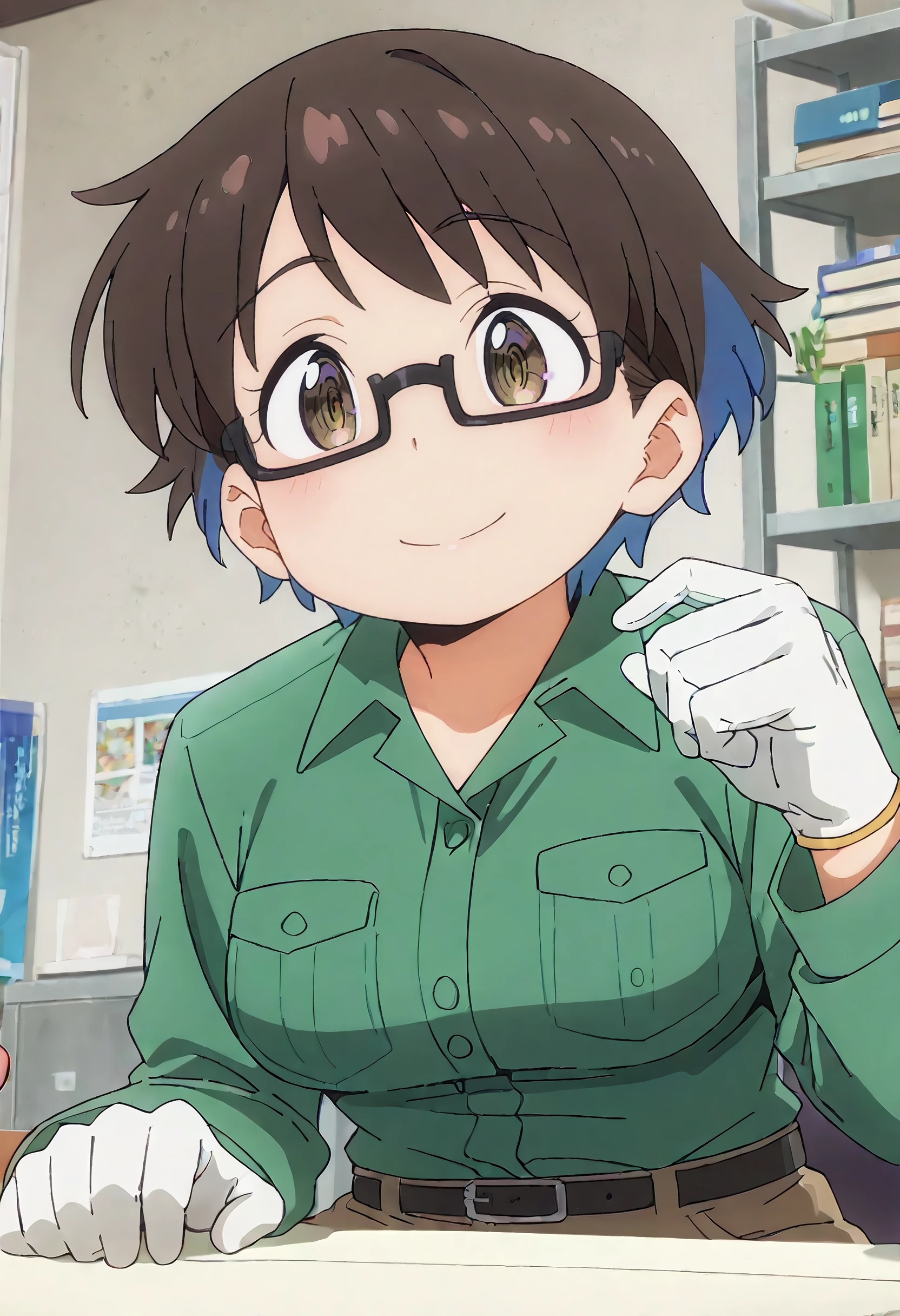 YoukoShirtB, green shirt, collared shirt, long sleeves, pocket, breast pocket, pants, belt, brown pants, brown belt, green jacket, white gloves, shirt tucked in,