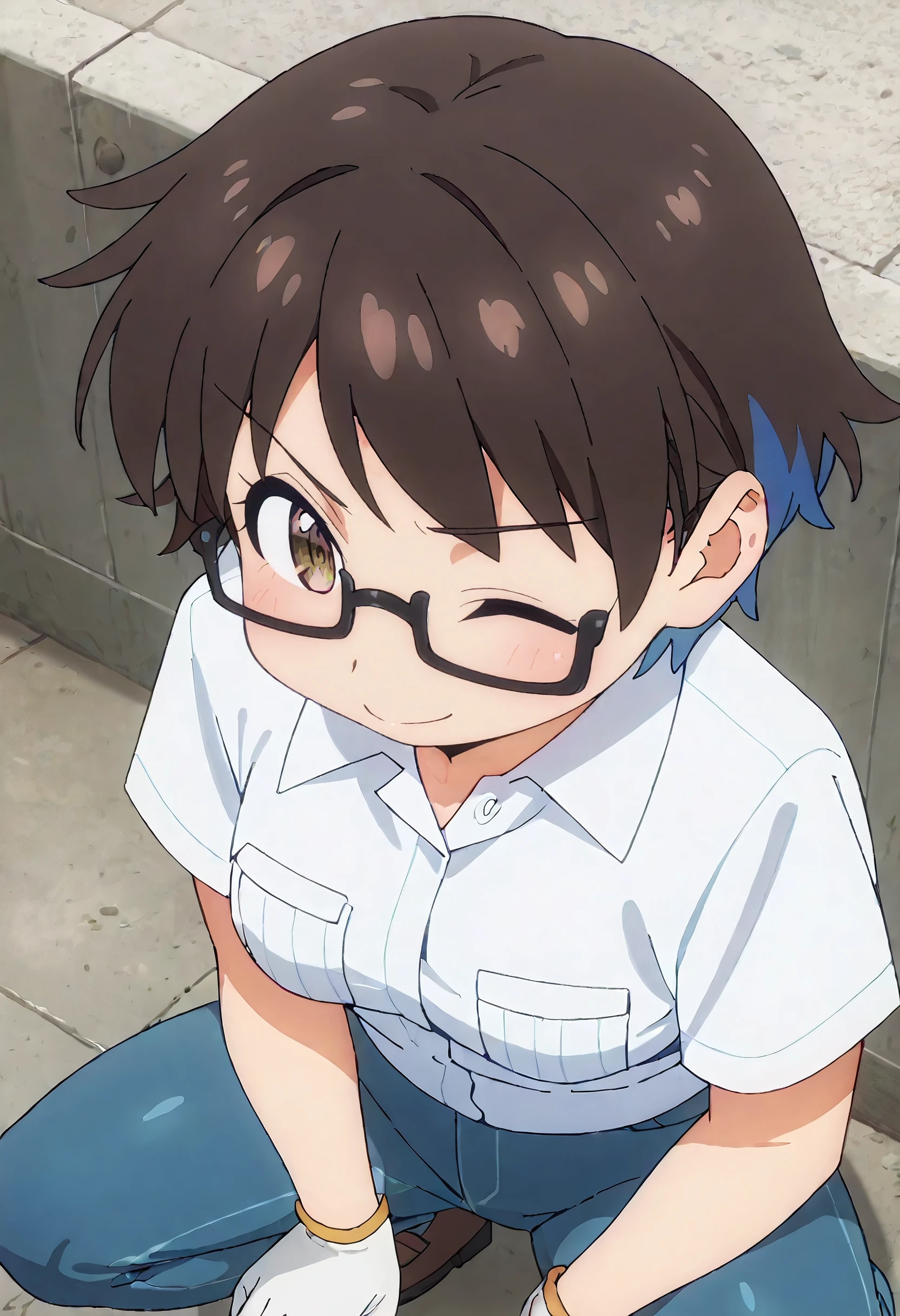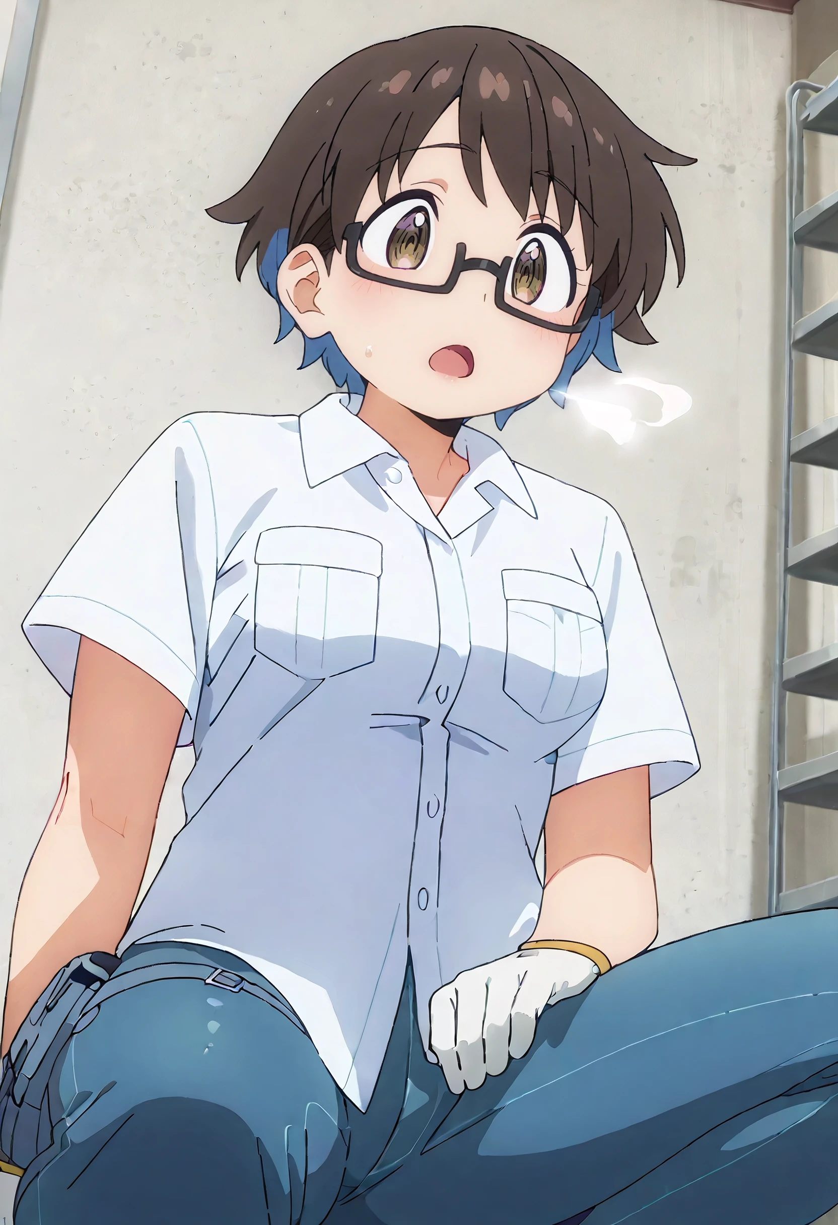 YoukoShirtD, white shirt, collared shirt, short sleeves, white gloves, pocket, pants, jeans, blue pants, breast pocket, denim, dress shirt, pouch,