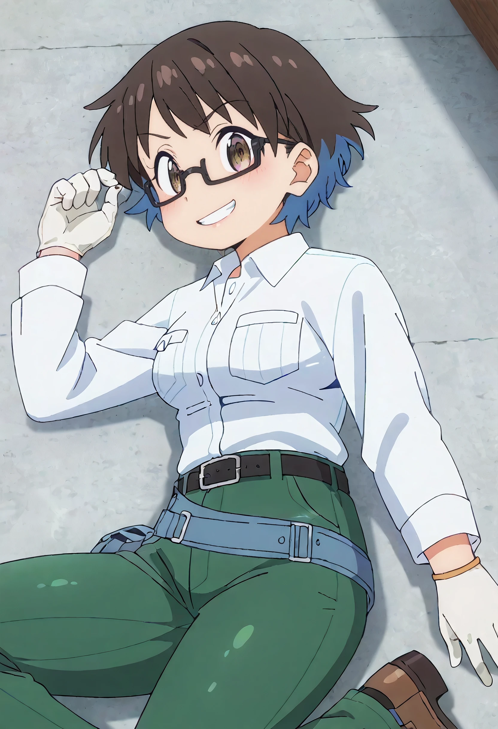 YoukoShirtC, white shirt, collared shirt, long sleeves, pocket, breast pocket, pants, green pants, belt, white gloves, black belt, shirt tucked in, pouch, shoes, brown footwear,