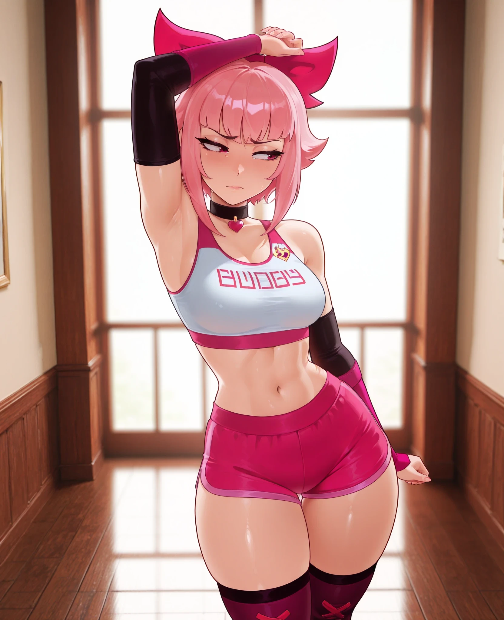 Trigger: RRg1mf1t, "color" trim, white sports bra, midriff, "color" shorts, elbow pads, kneepads
