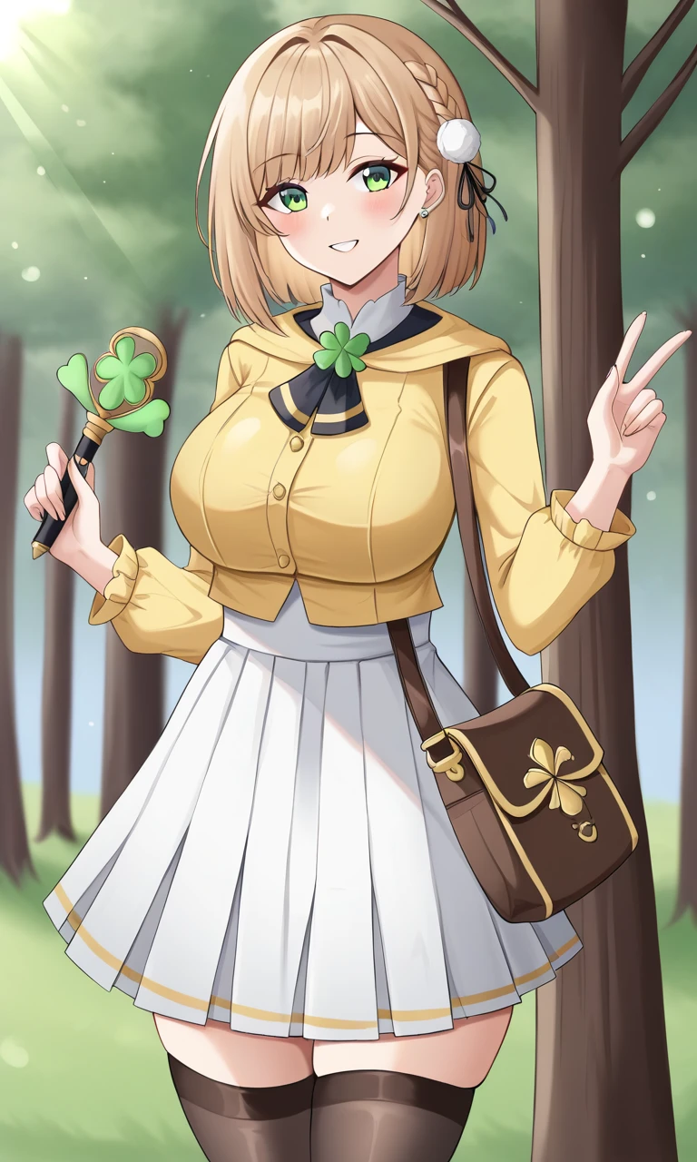 ChloePawapua, light brown hair, bob cut, green eyes, bangs, hair braid, pom-pom accessory, sailor-style collar, yellow jacket, frilly sleeve edges, white skirt, pleated skirt, high-waisted skirt, thigh-high socks, black stockings, brown heeled boots, gold accents,