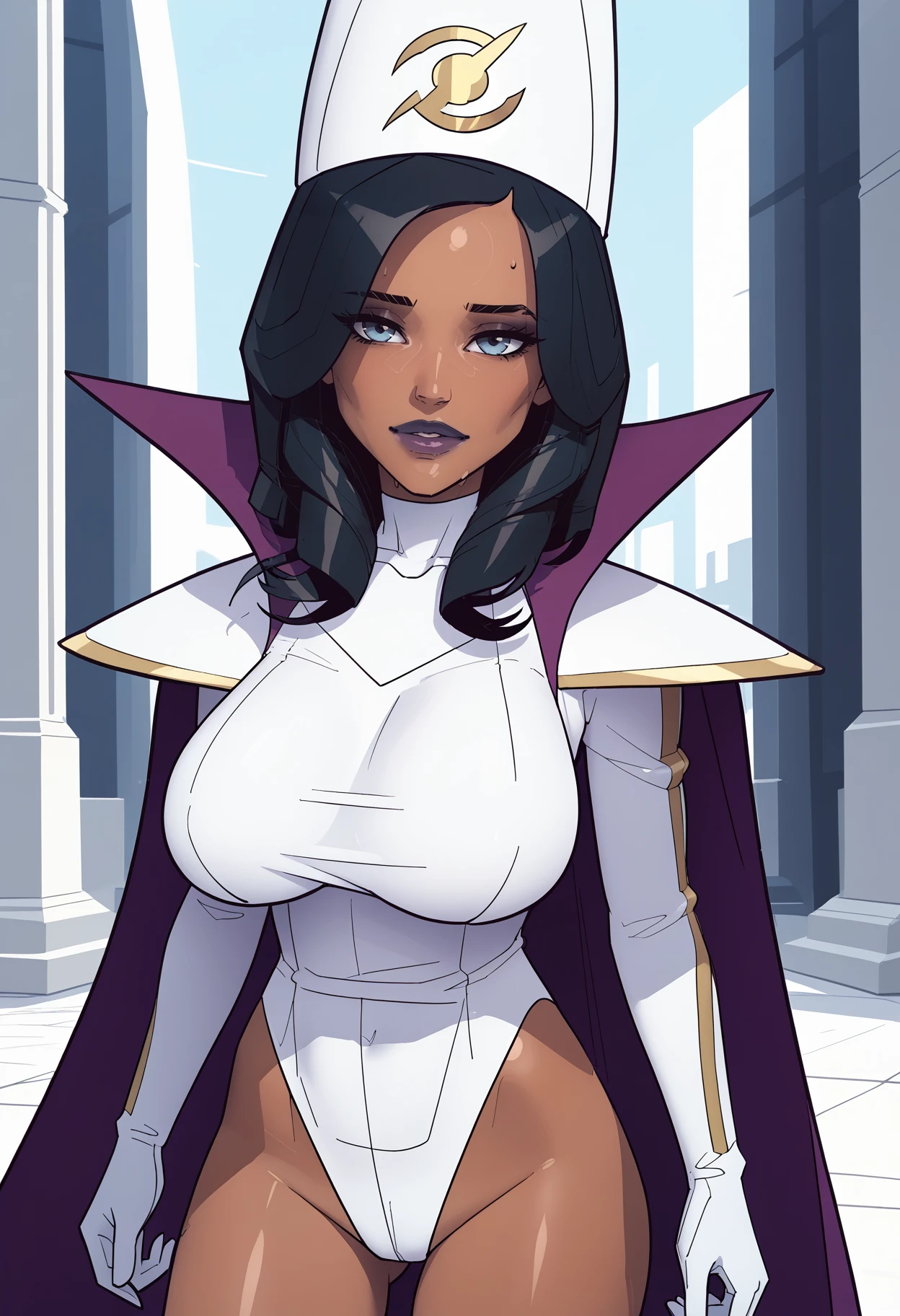 outfit tags: makeup, lipstick, purple lips, hat, white hat, cape, leotard, closed leotard, gloves, white gloves,