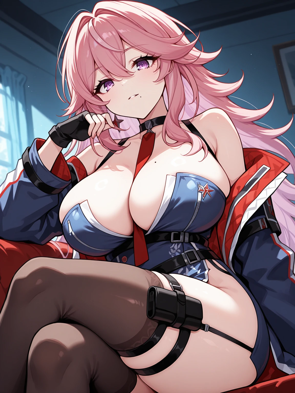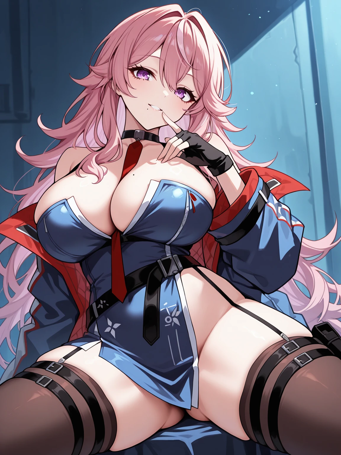 Main outfit: mole on breast, blue dress, short skirt, cleavage, side slit dress, bare shoulders, blue coat, black choker, red necktie, black gloves, fingerless gloves, no panties, single garter strap, brown thighhighs, black belt, thigh strap, hip holster