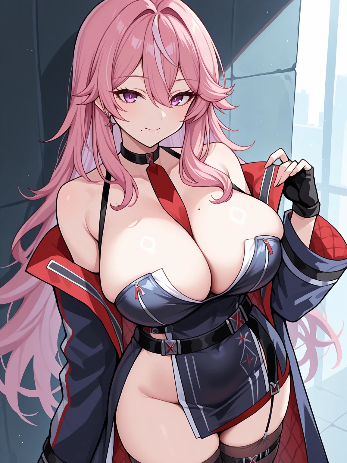 Apperance: ilfranklin, purple eyes, pink hair, messy hair, long hair, mole under mouth, large breasts