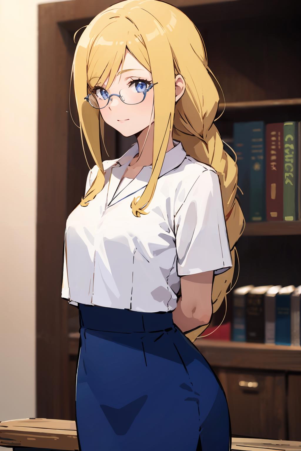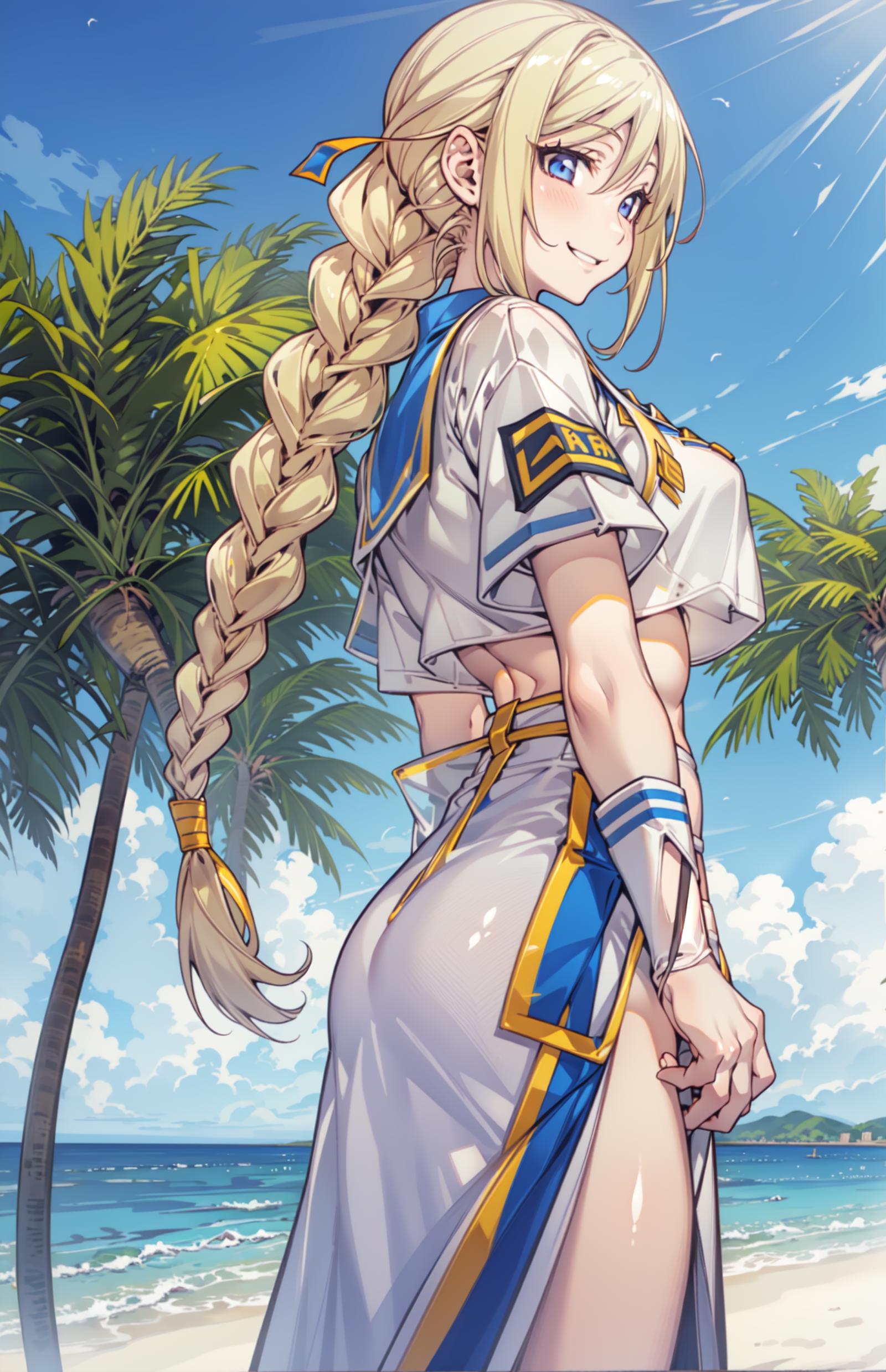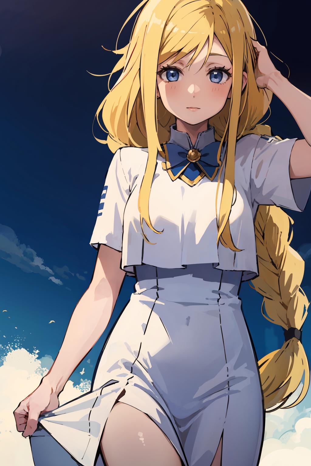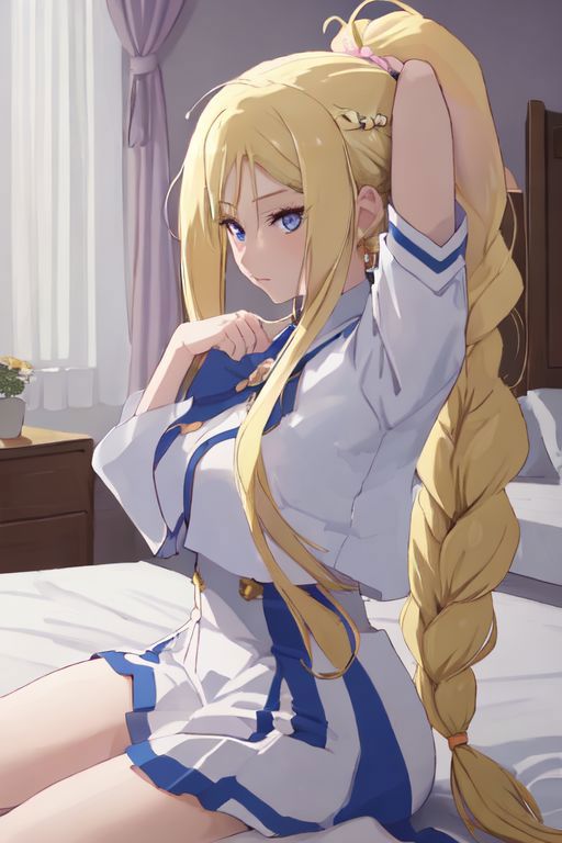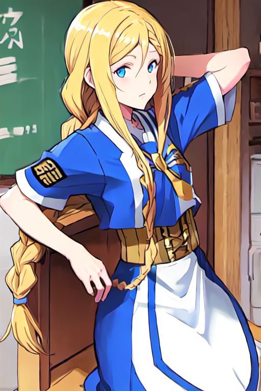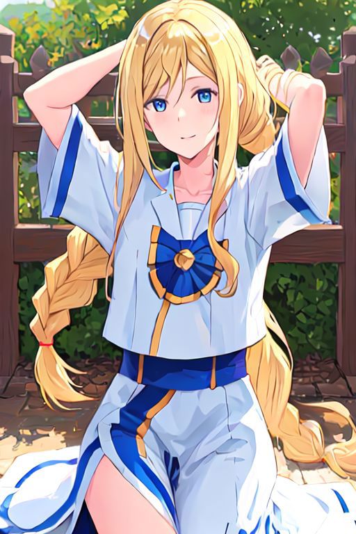 Optional Words: blonde hair,braided ponytail,blue eyes