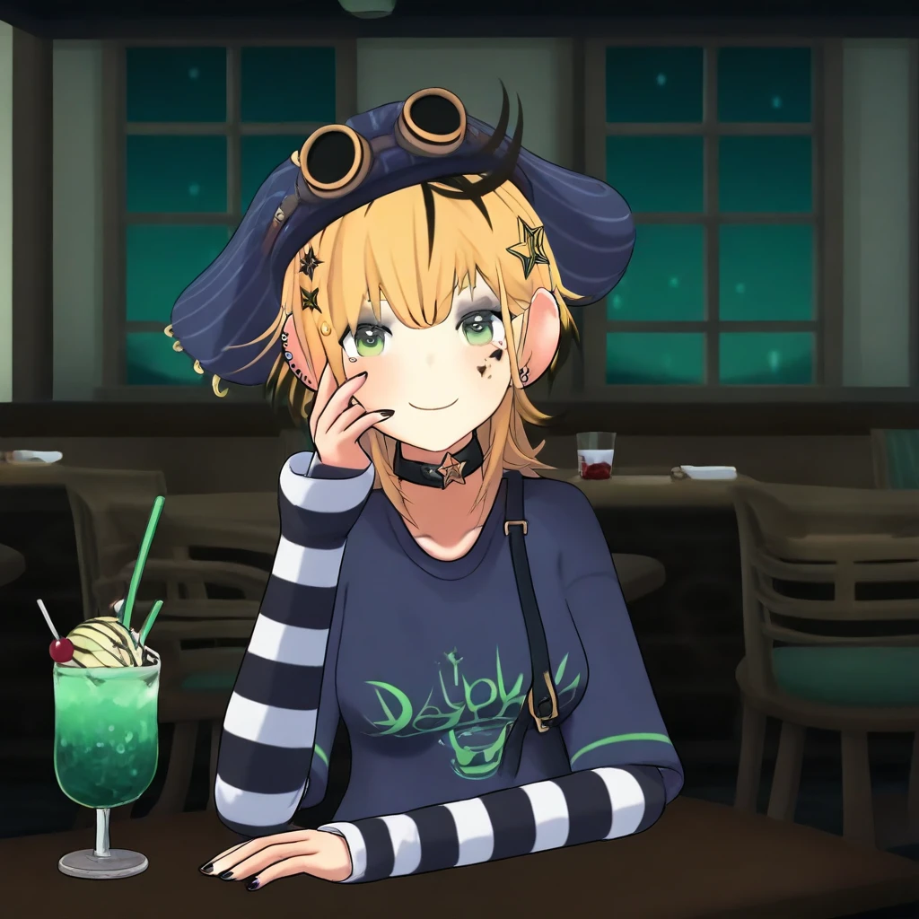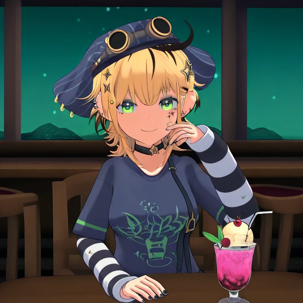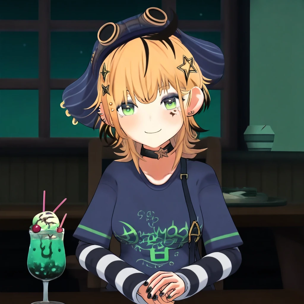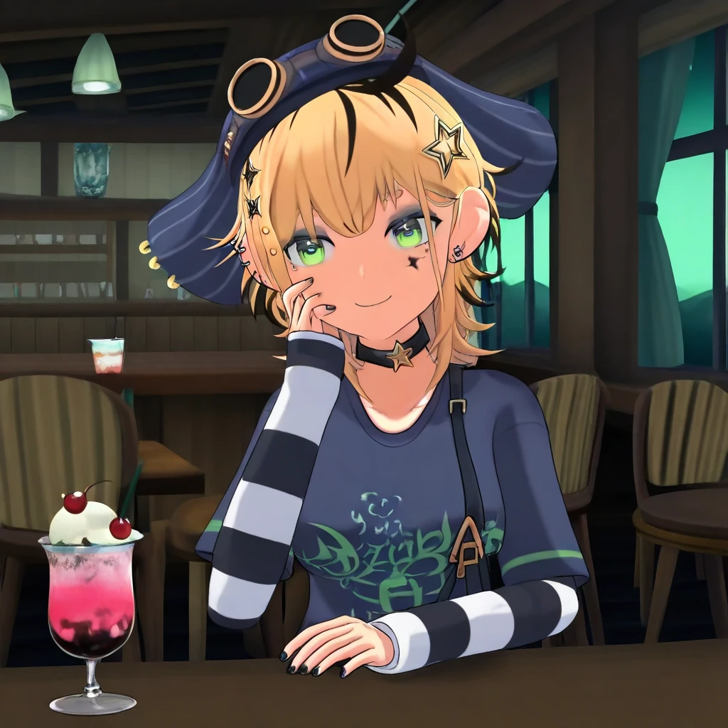 Dooby3d, 1girl, Green eyes, Blonde hair, multicolored hair, medium hair, hat, googles, hair ornament, ahoge, medium , smile at viewer, piercing, choker, star (symbol), eye shadow, ear piercing, black nails, shirt, tail, face marks, solo, lazypos, anime-style, anime screenshot