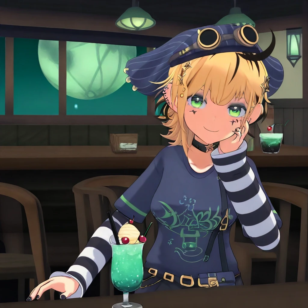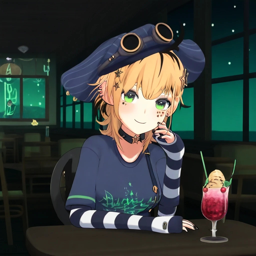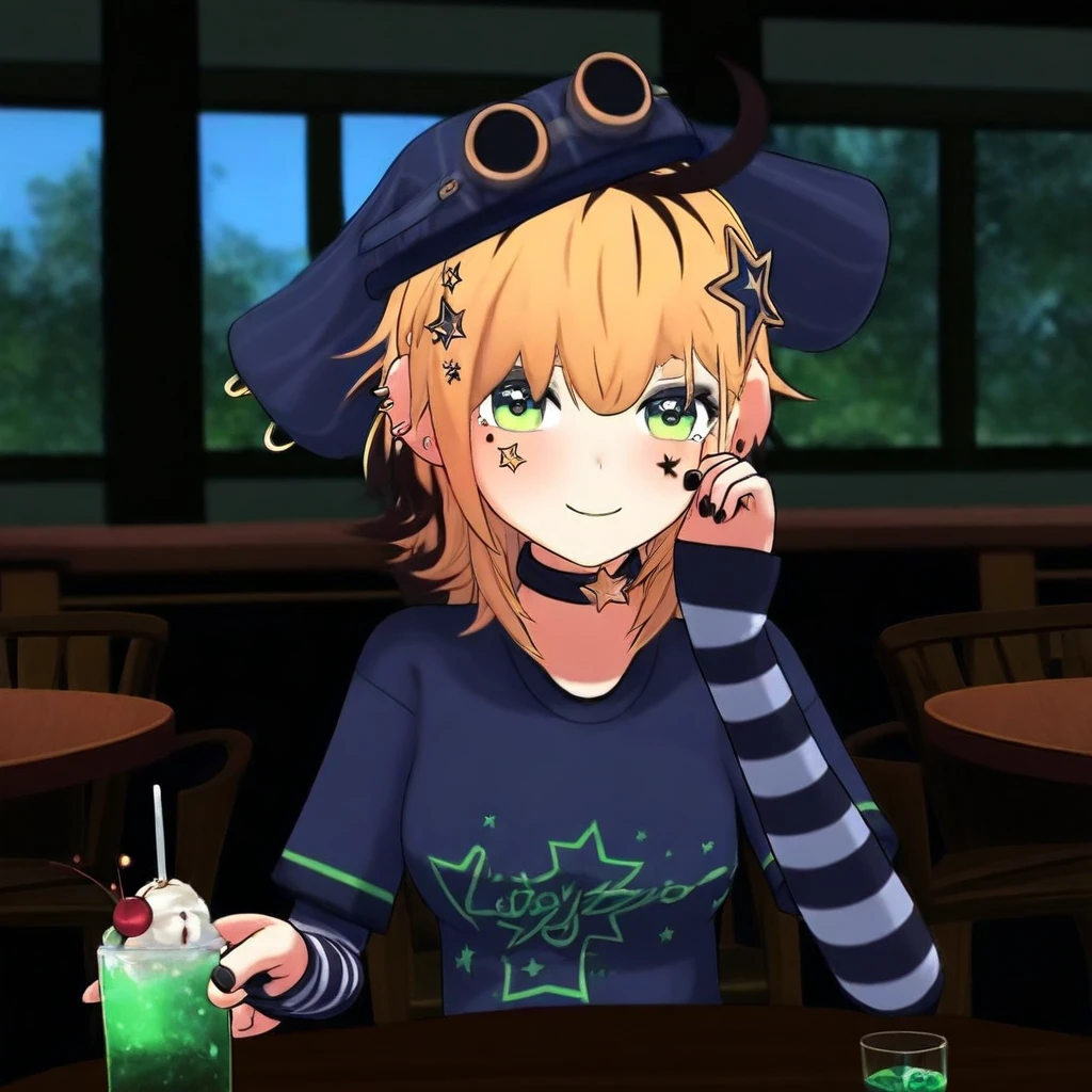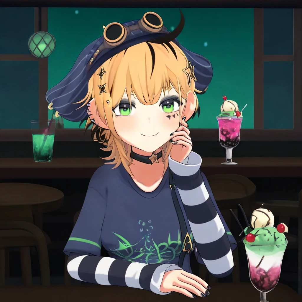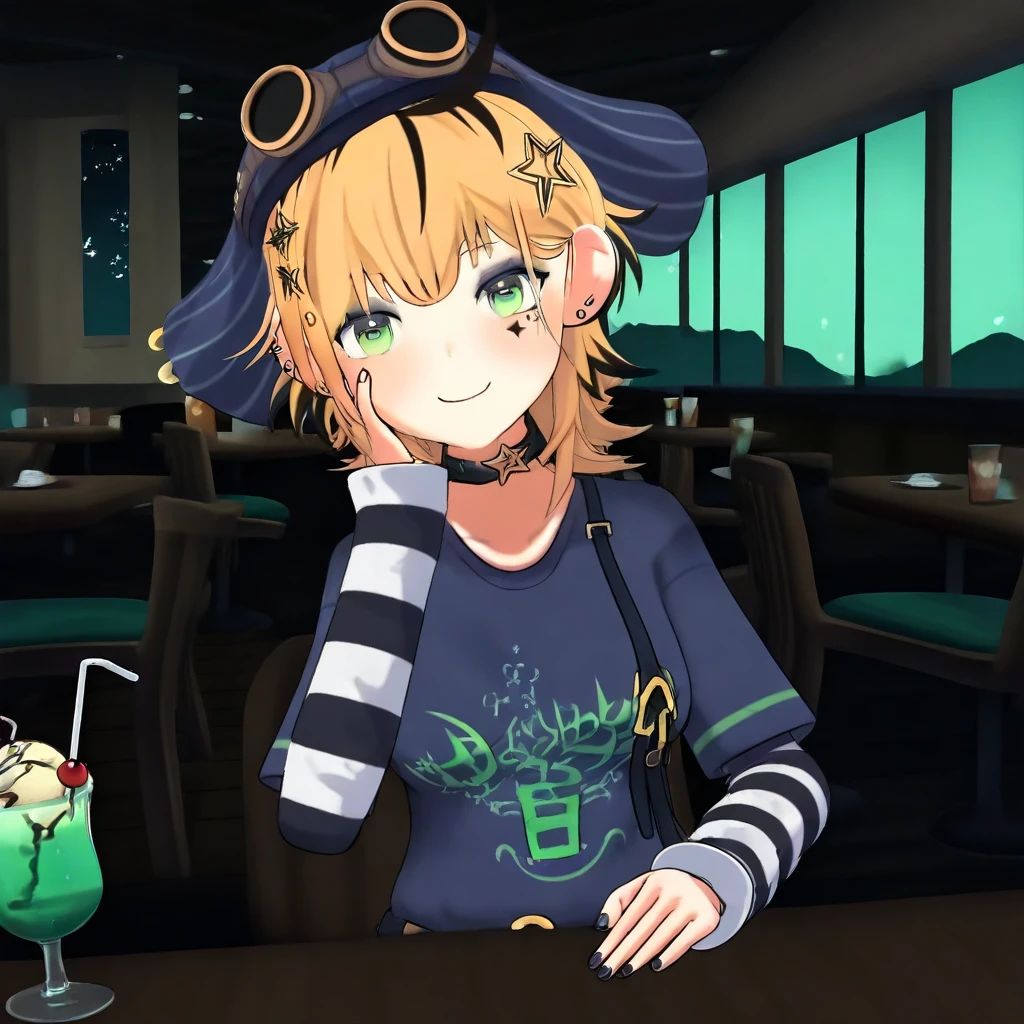 Dooby3d, 1girl, Green eyes, Blonde hair, multicolored hair, medium hair, hat, googles, hair ornament, ahoge, medium , smile at viewer, piercing, choker, star (symbol), eye shadow, ear piercing, black nails, shirt, tail, face marks, solo, lazypos, anime-style, anime screenshot