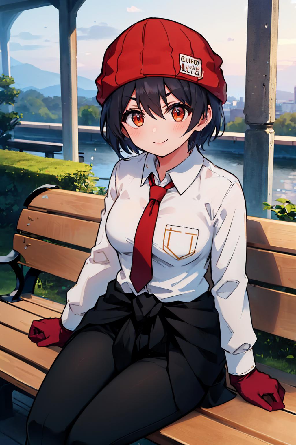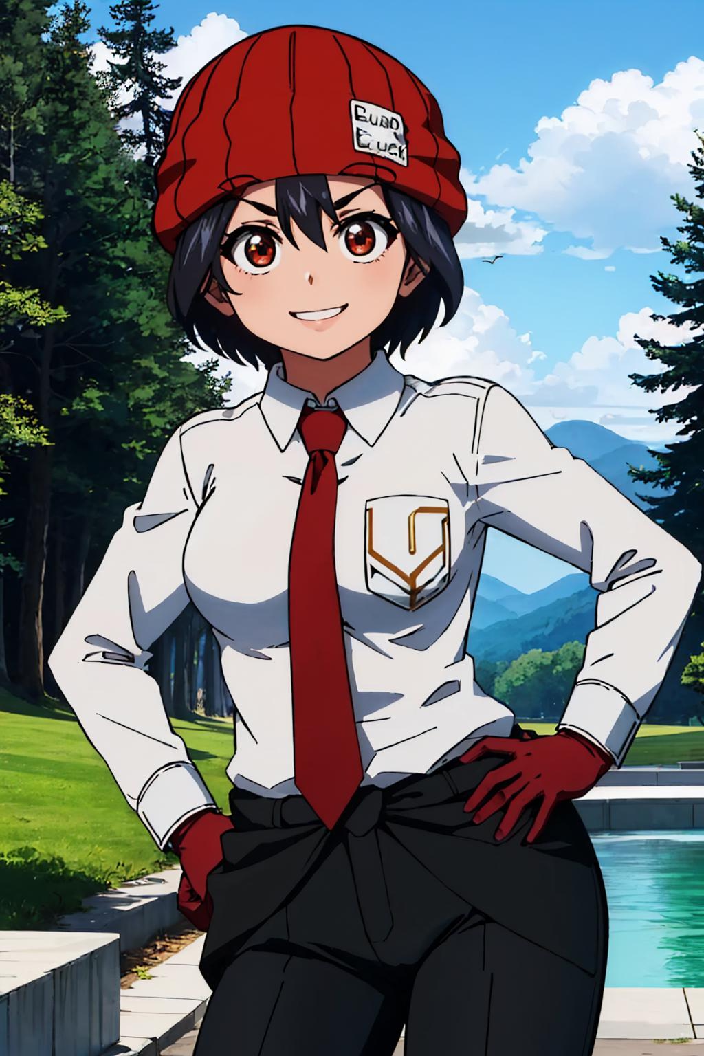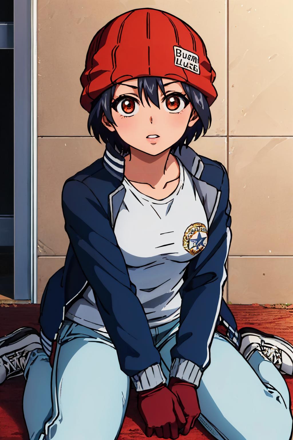 Default Outfit: red headwear, beanie, jacket, white shirt, gloves, blue pants