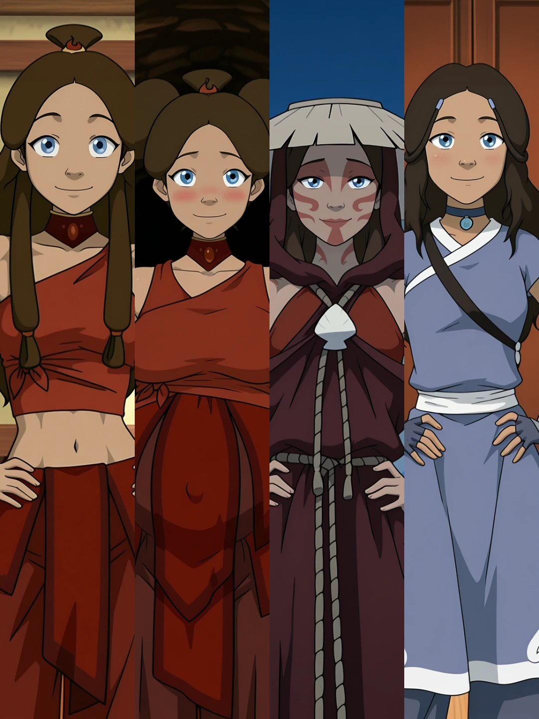 Outfit 2 trigger: short hair, double bun, big bun, topknot, hair ornament, armlet, bracelet, red necklace, pregnant, big belly, large breasts, firenation_attire, red shirt, tied shirt, bare shoulders, collarbone, midriff, navel, waist cape, side slit, red skirt, brown pants, capri pants, bell-bottoms, sandals,