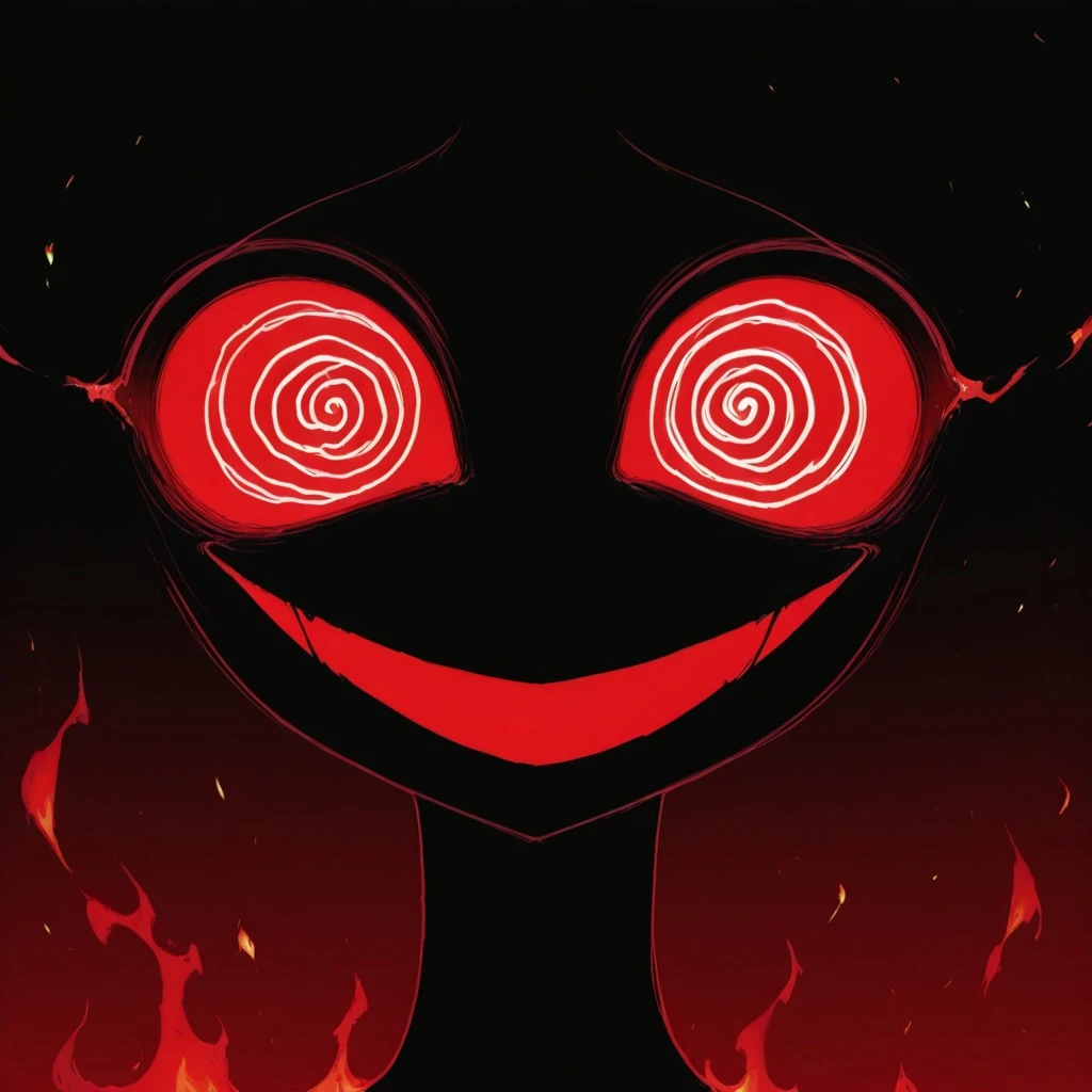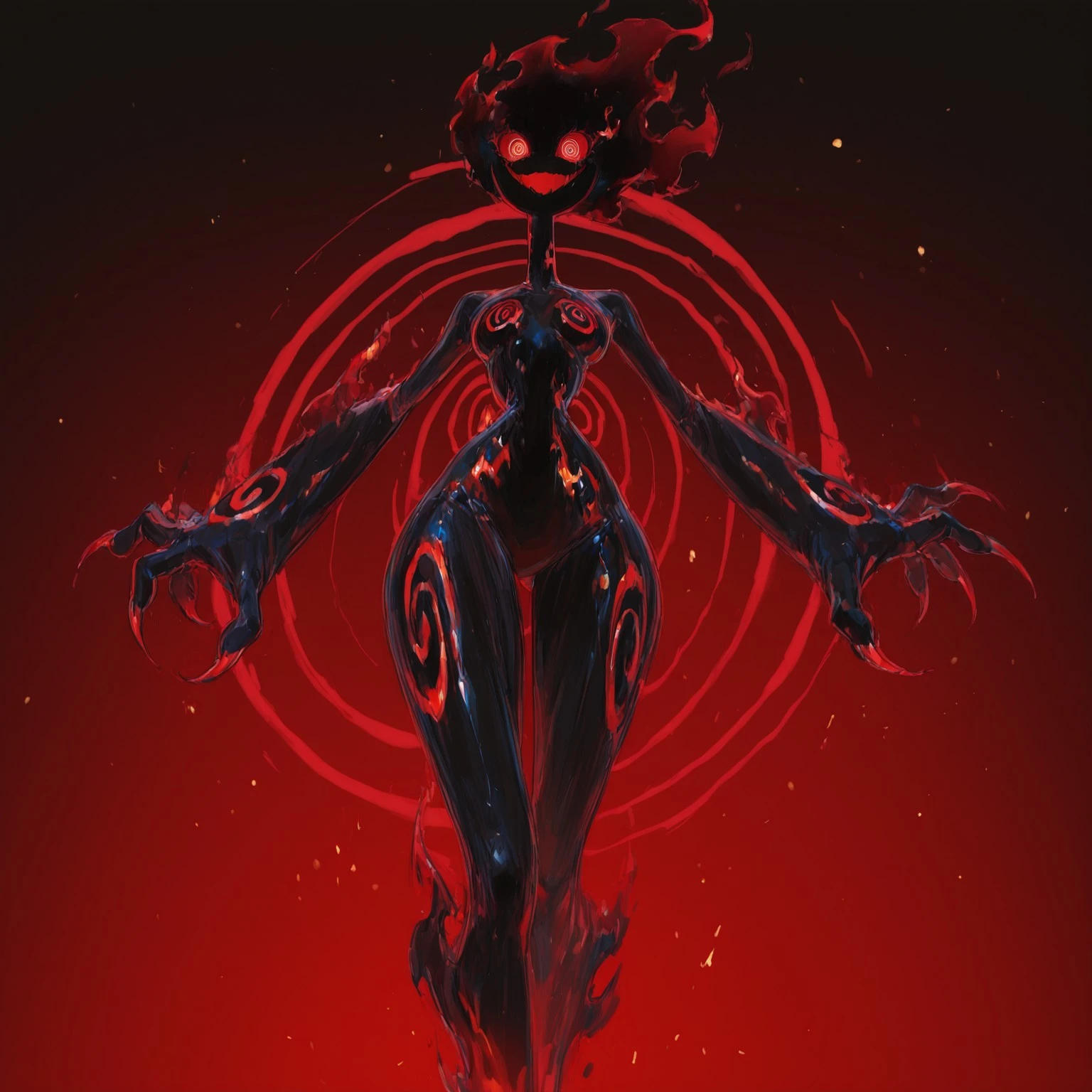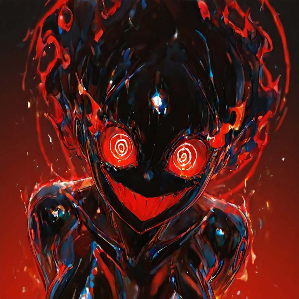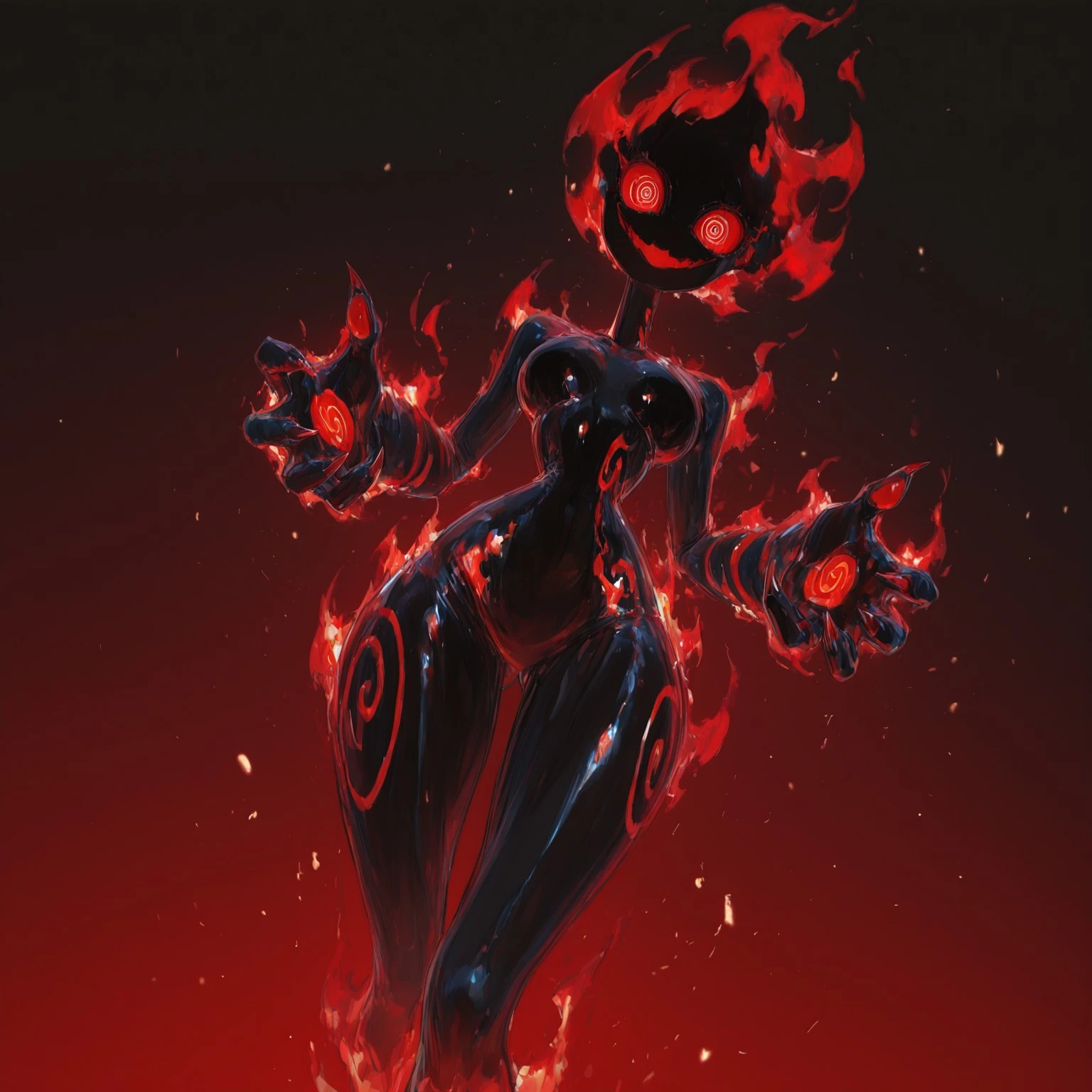 (pitch black skin, black fiery hair, spiral eyes, fire eyes, large eyes, wide eyes, spiral details on body, jagged details),