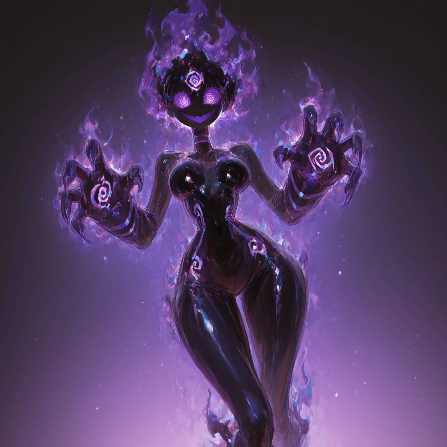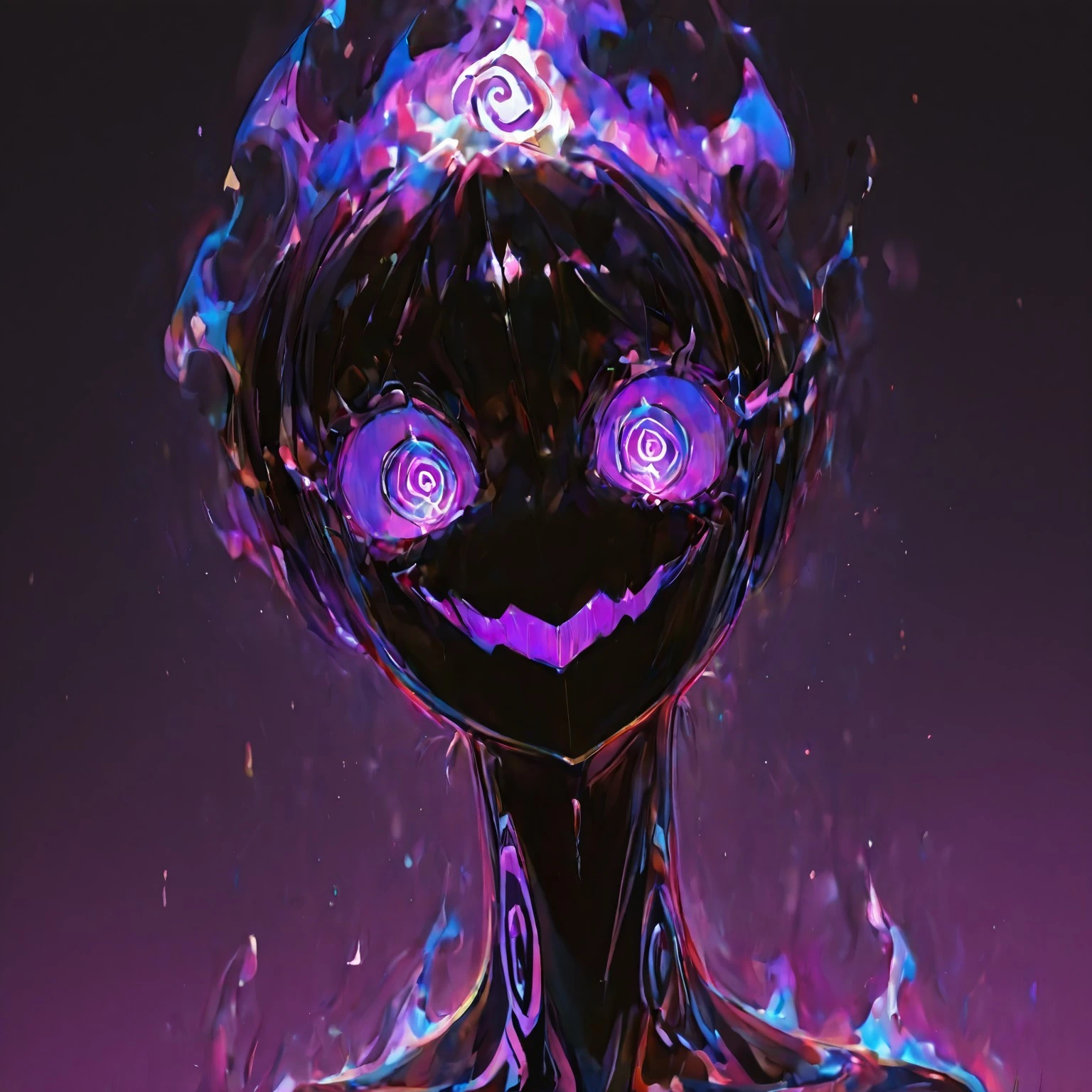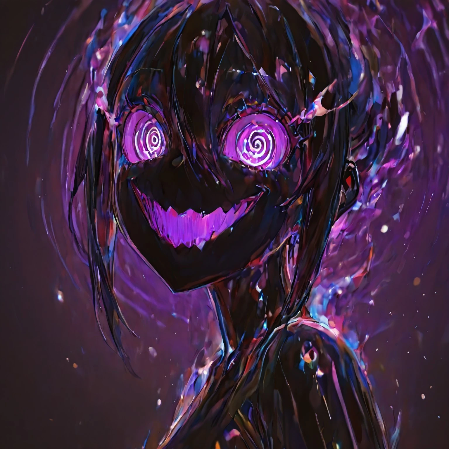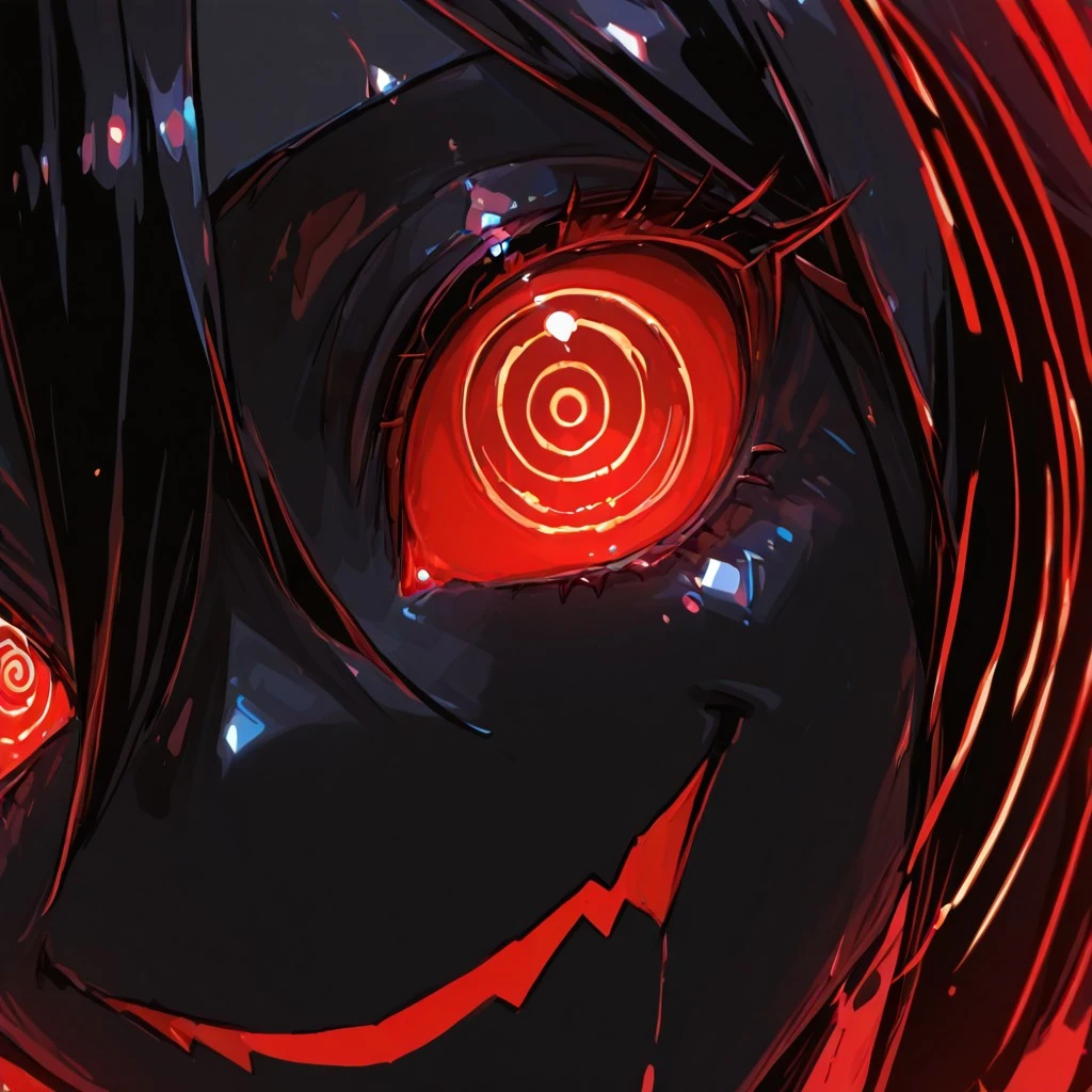 (pitch black skin, black fiery hair, spiral eyes, fire eyes, large eyes, wide eyes, spiral details on body, jagged details),