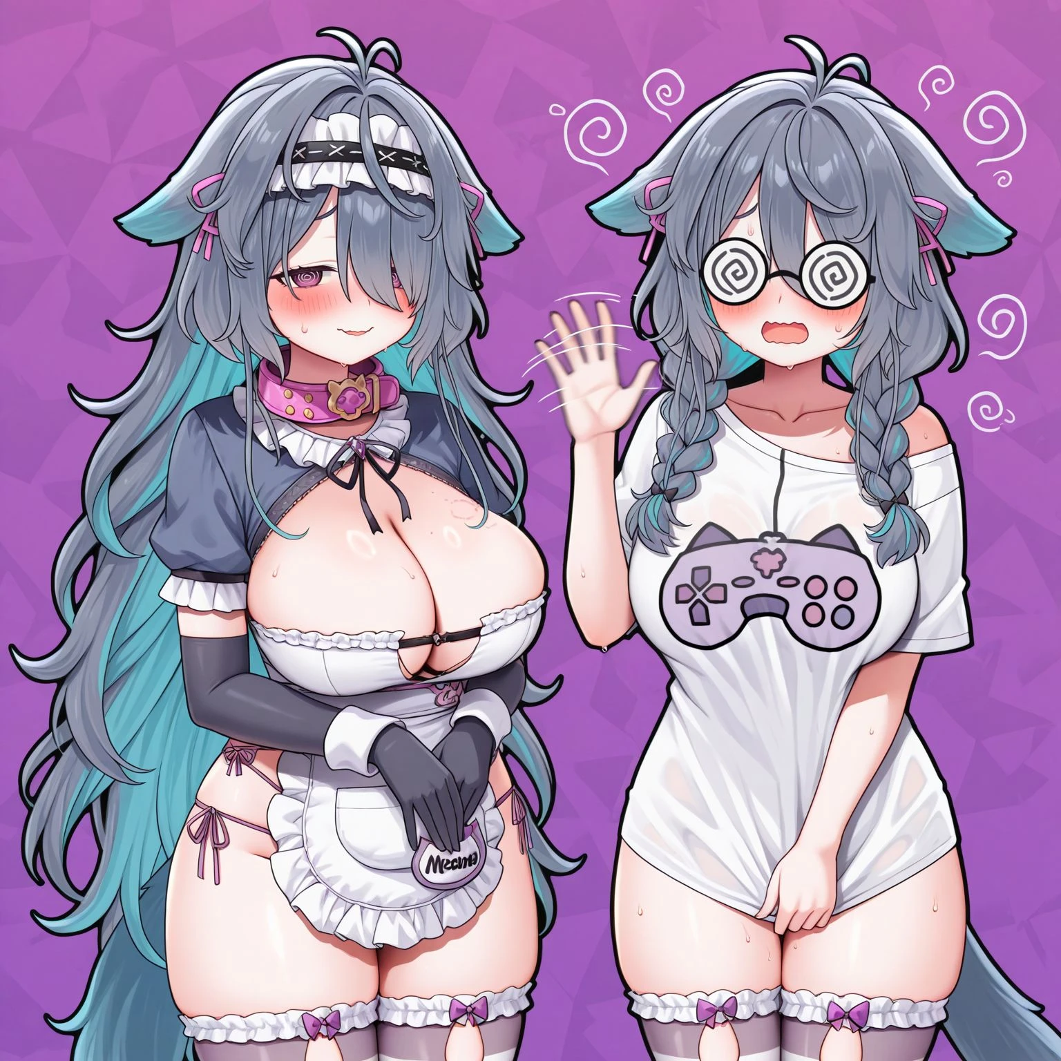 mmkmaid, hair over one eye, very long hair, frilled hairband, pet collar, black elbow gloves, neck ribbon, apron, striped thighhighs, side-tie panties
