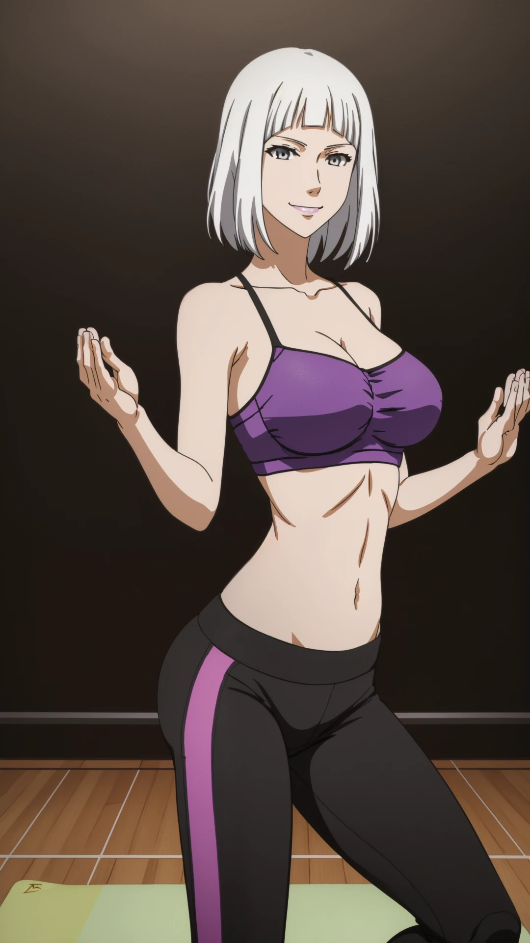 a woman, white hair, silver eyes, purple bra top, midriff, black pants, white shoes,