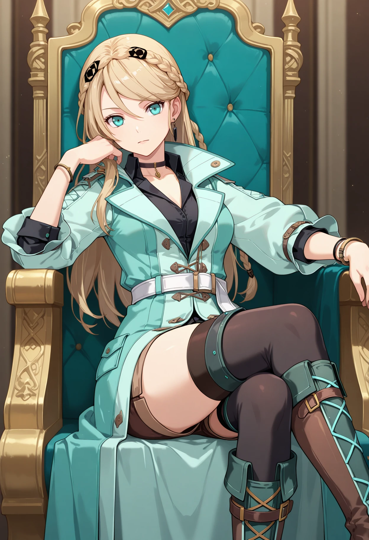 outfit3aaelaine, long hair, blonde hair, french braid, single braid, earrings, aqua eyes, black choker, black shirt, aqua coat, bracelet, belt, brown shorts, black thighhighs