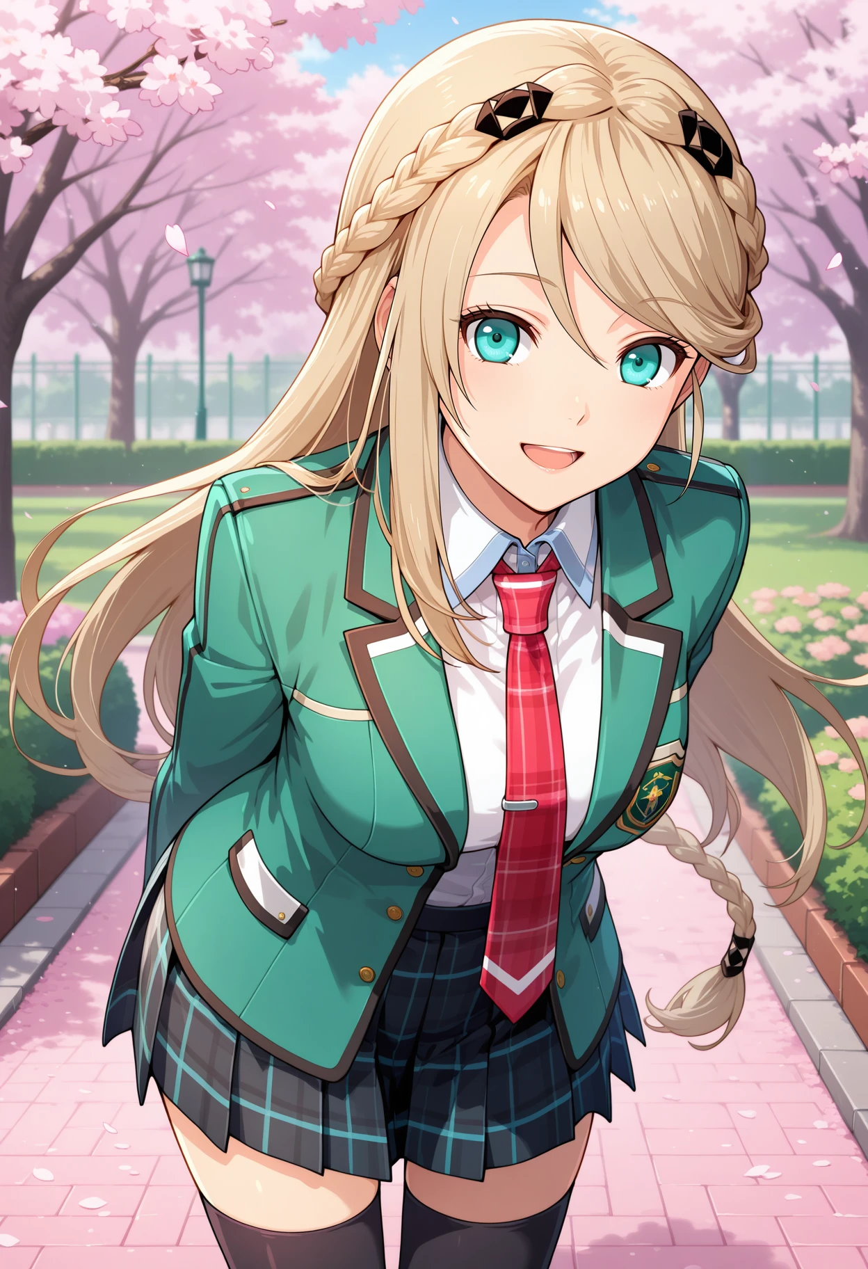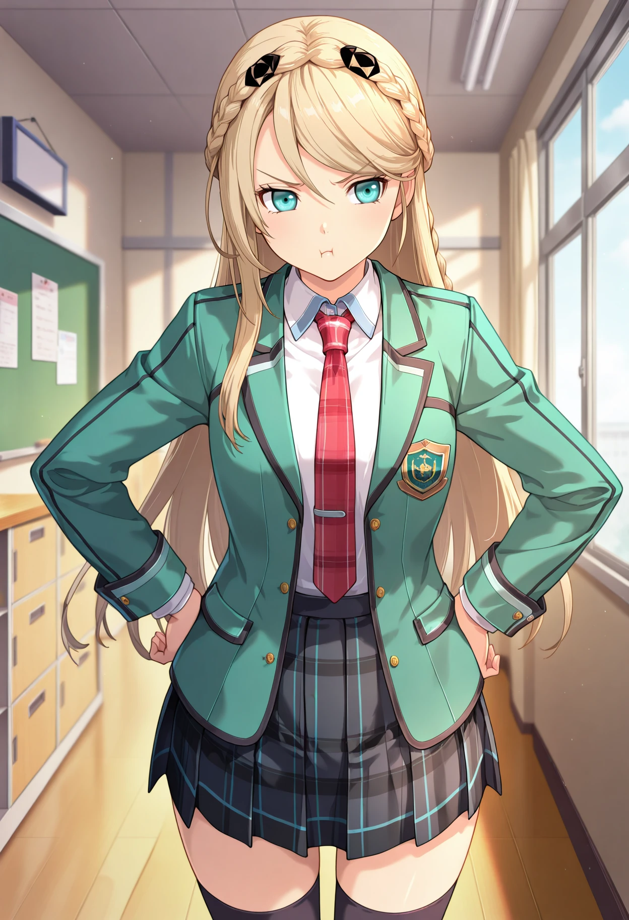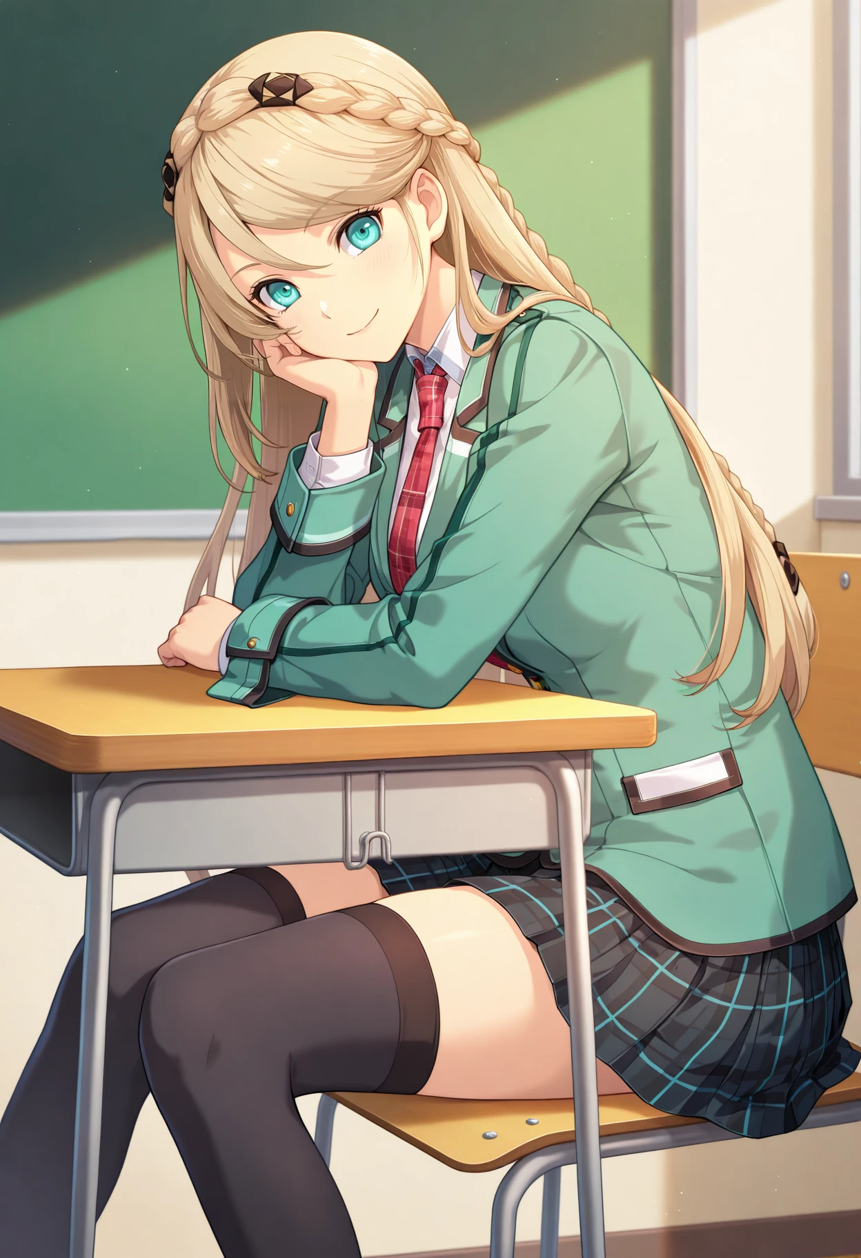 outfit2aaelaine, long hair, blonde hair, french braid, single braid, aqua eyes, school uniform, red necktie, white shirt, blazer, green jacket, long sleeves, plaid skirt, black skirt, black thighhighs