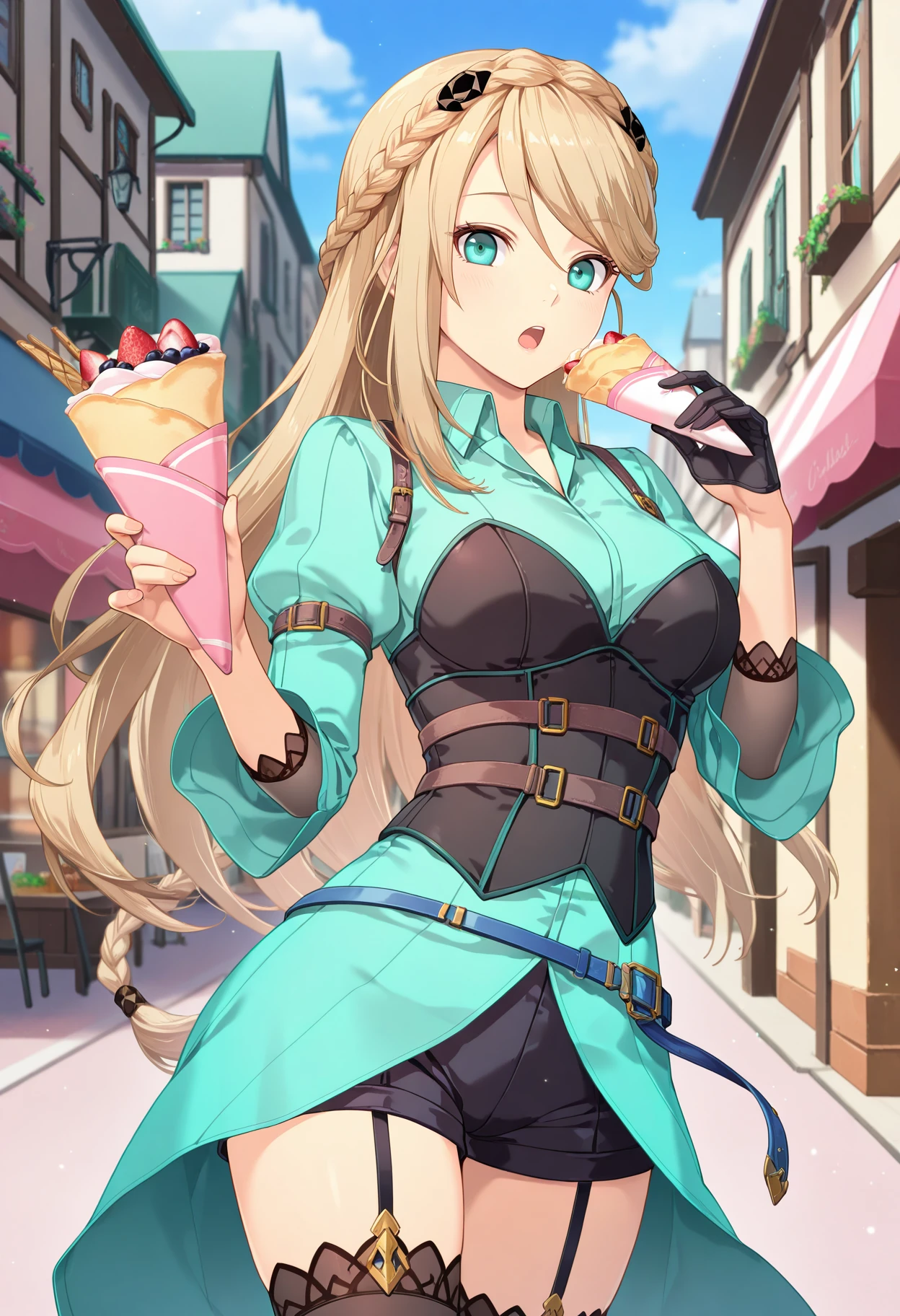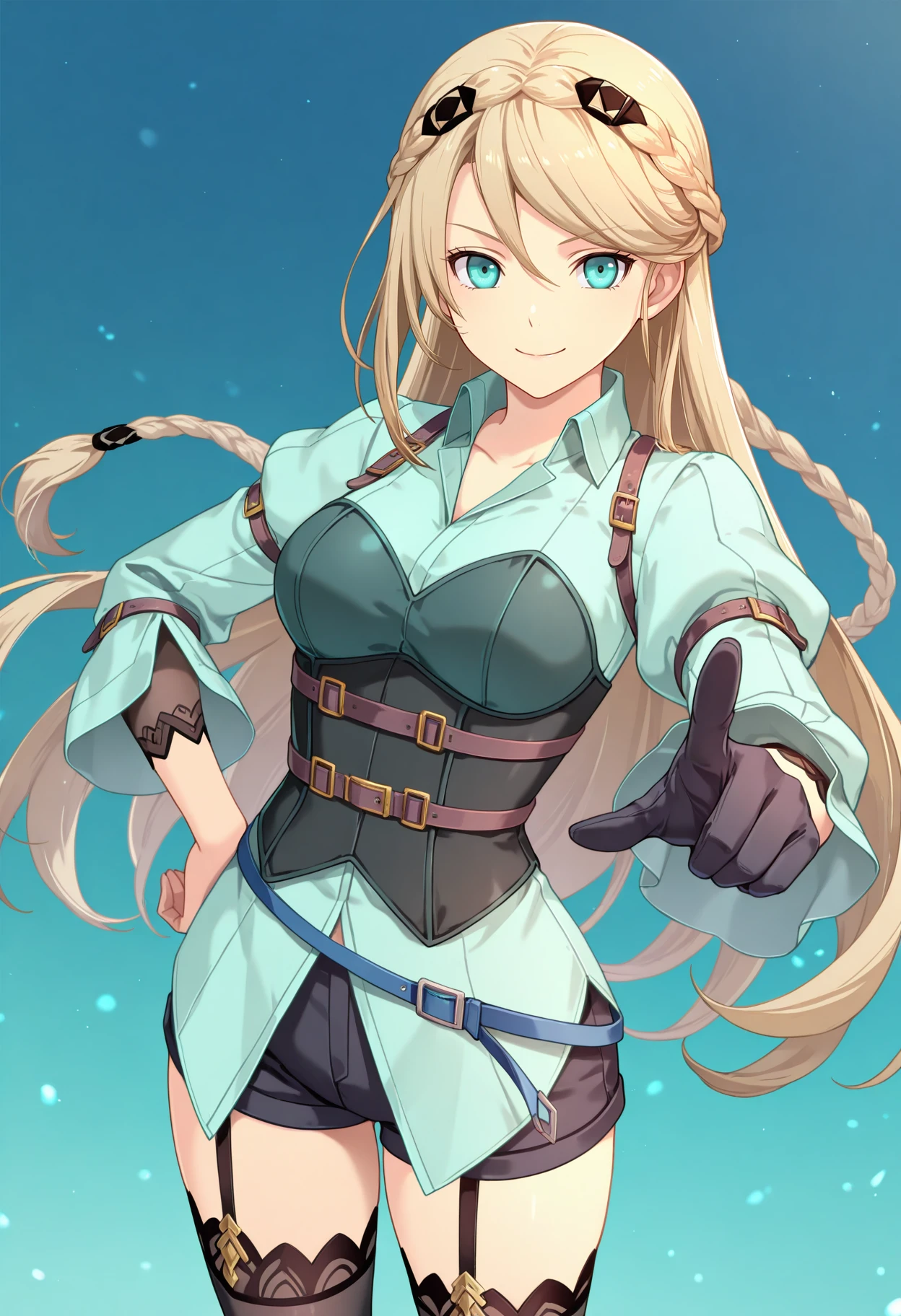 outfit4aaelaine, long hair, blonde hair, french braid, single braid, aqua eyes, aqua shirt, black bustier, long sleeves, single glove, black gloves, belt, black shorts, garter straps, black thighhighs
