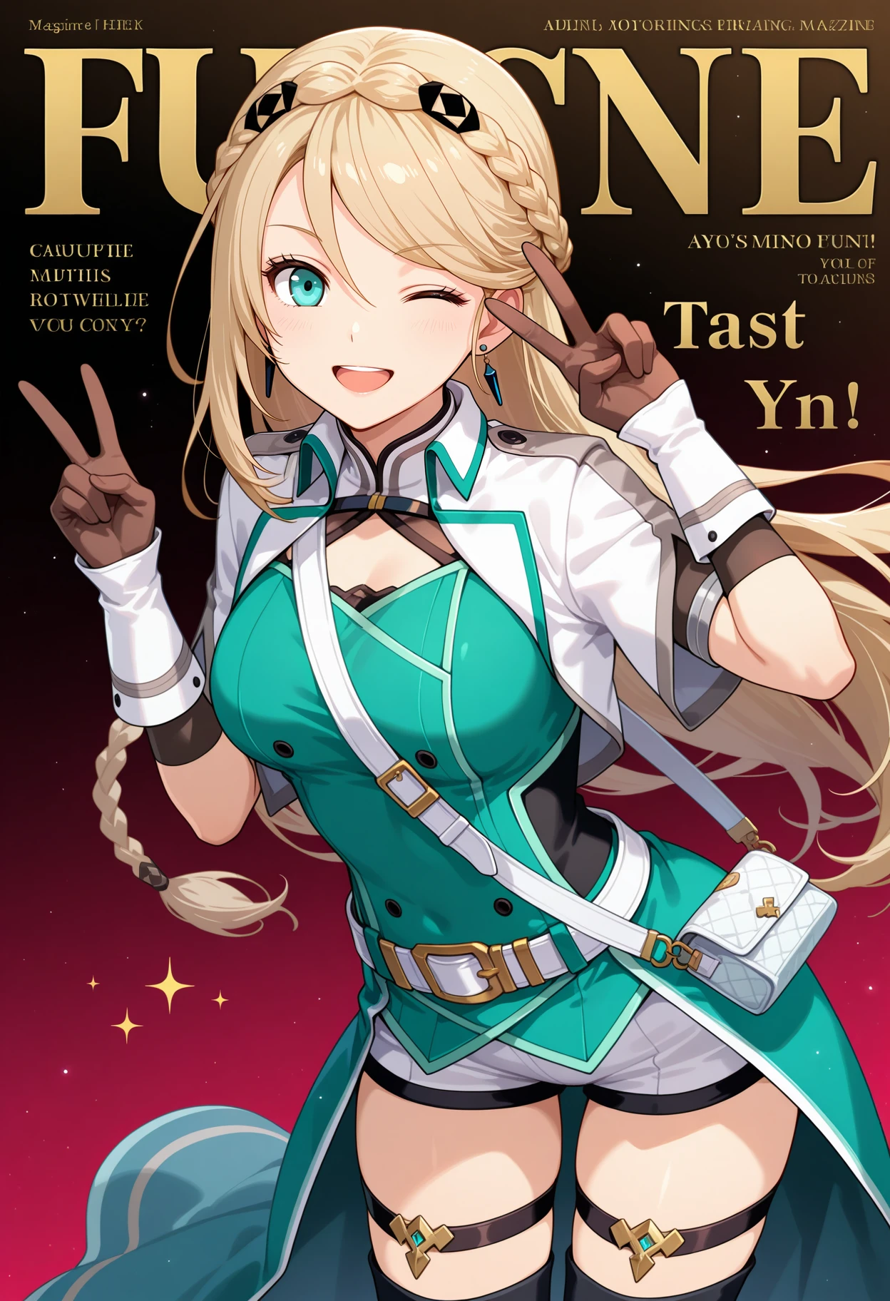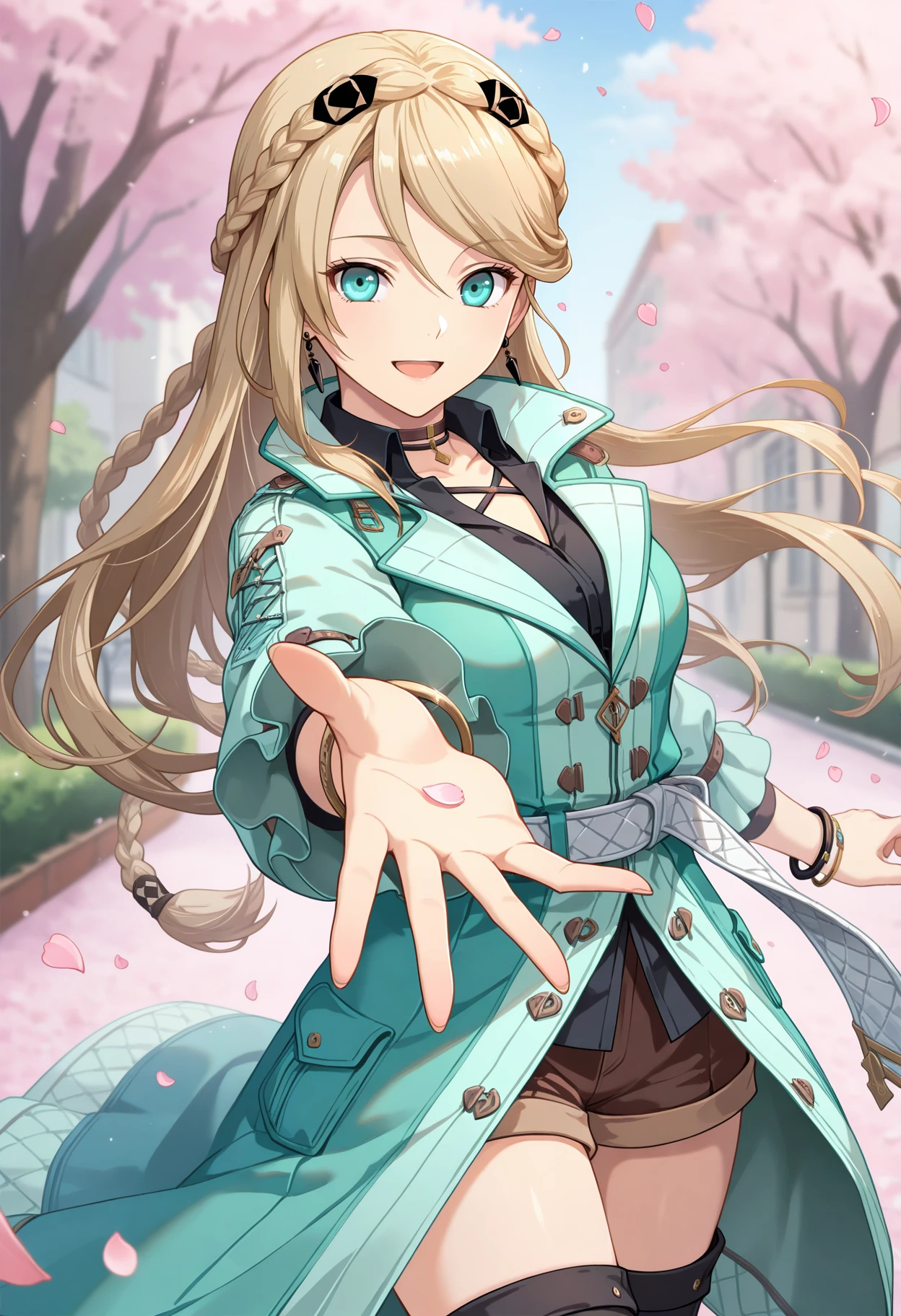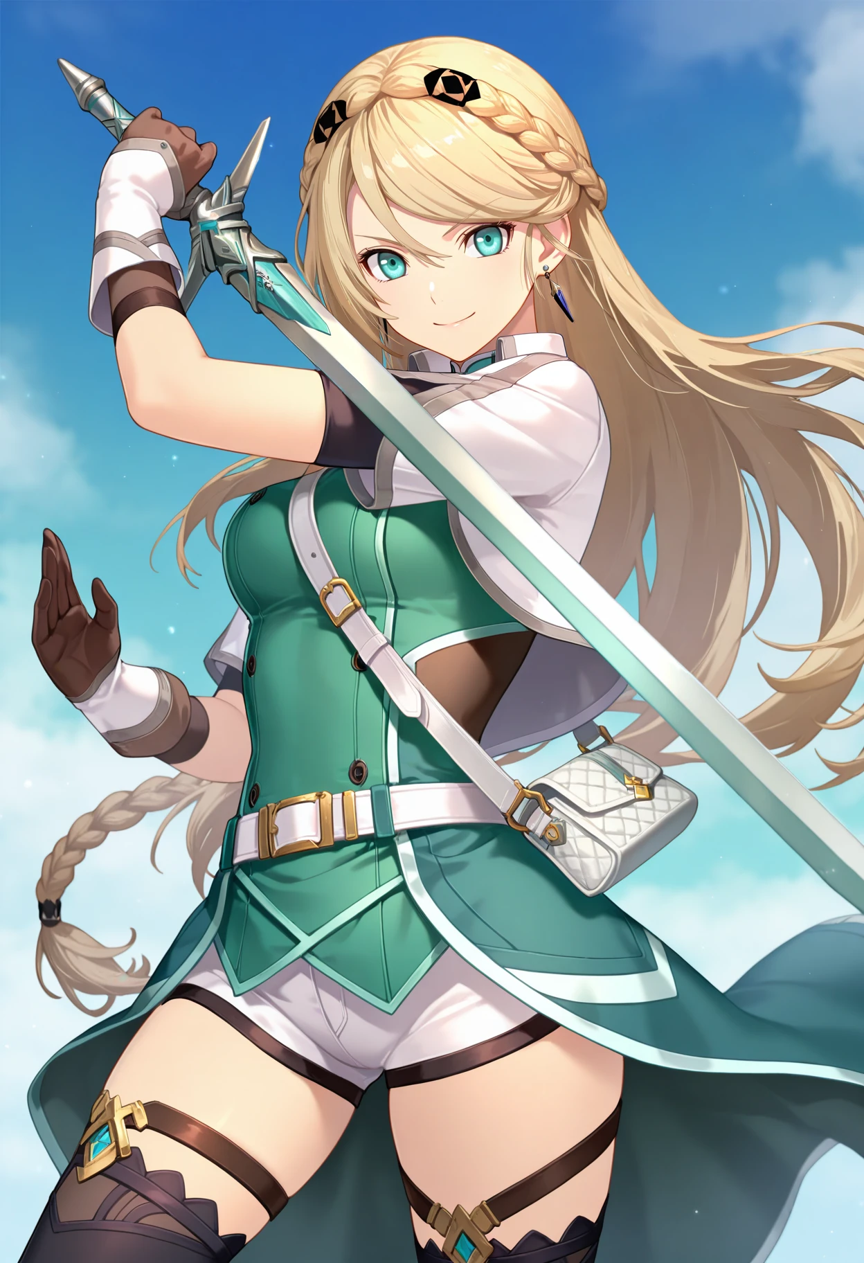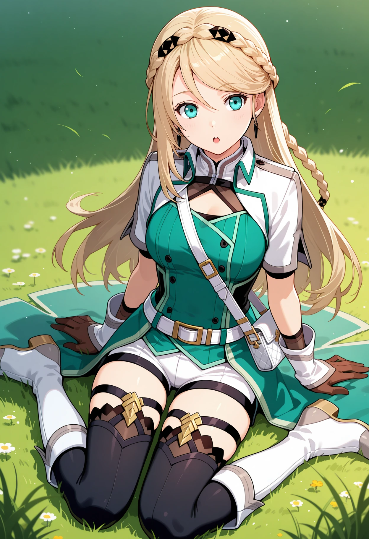 outfit1aaelaine, long hair, blonde hair, french braid, single braid, earrings, aqua eyes, white jacket, green dress, short sleeves, brown gloves, white belt, short shorts, white shorts, thigh strap, black thighhighs