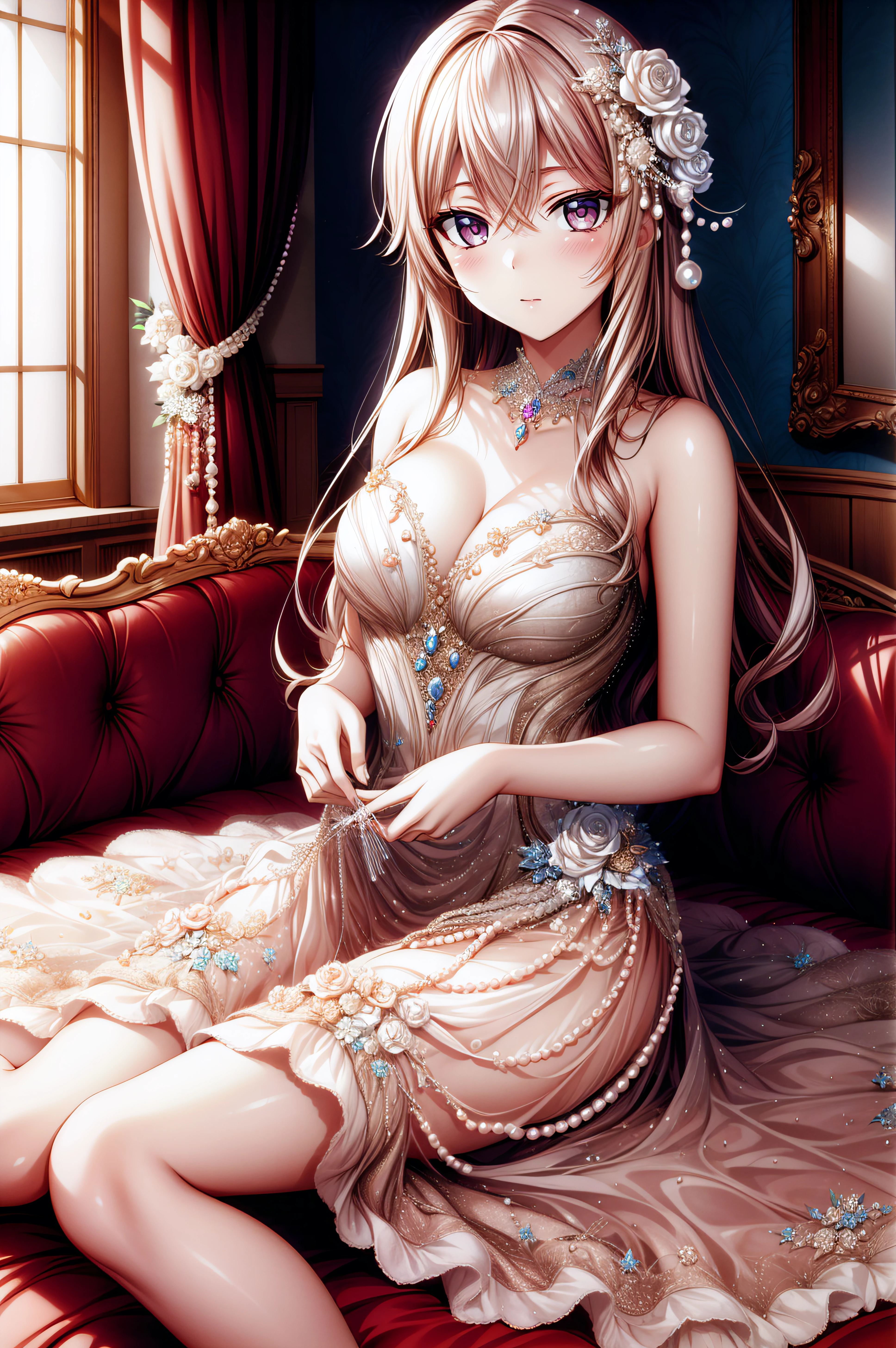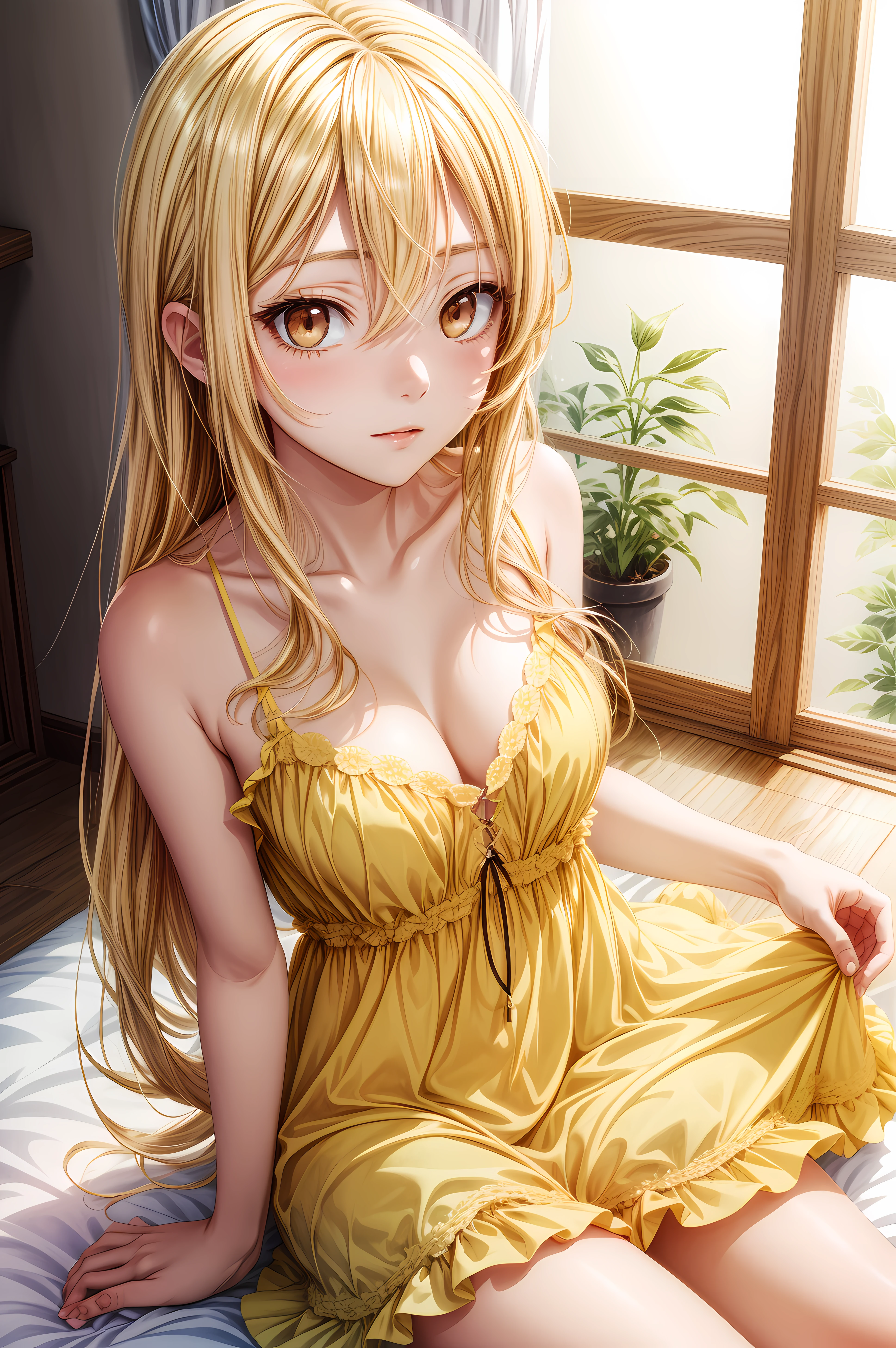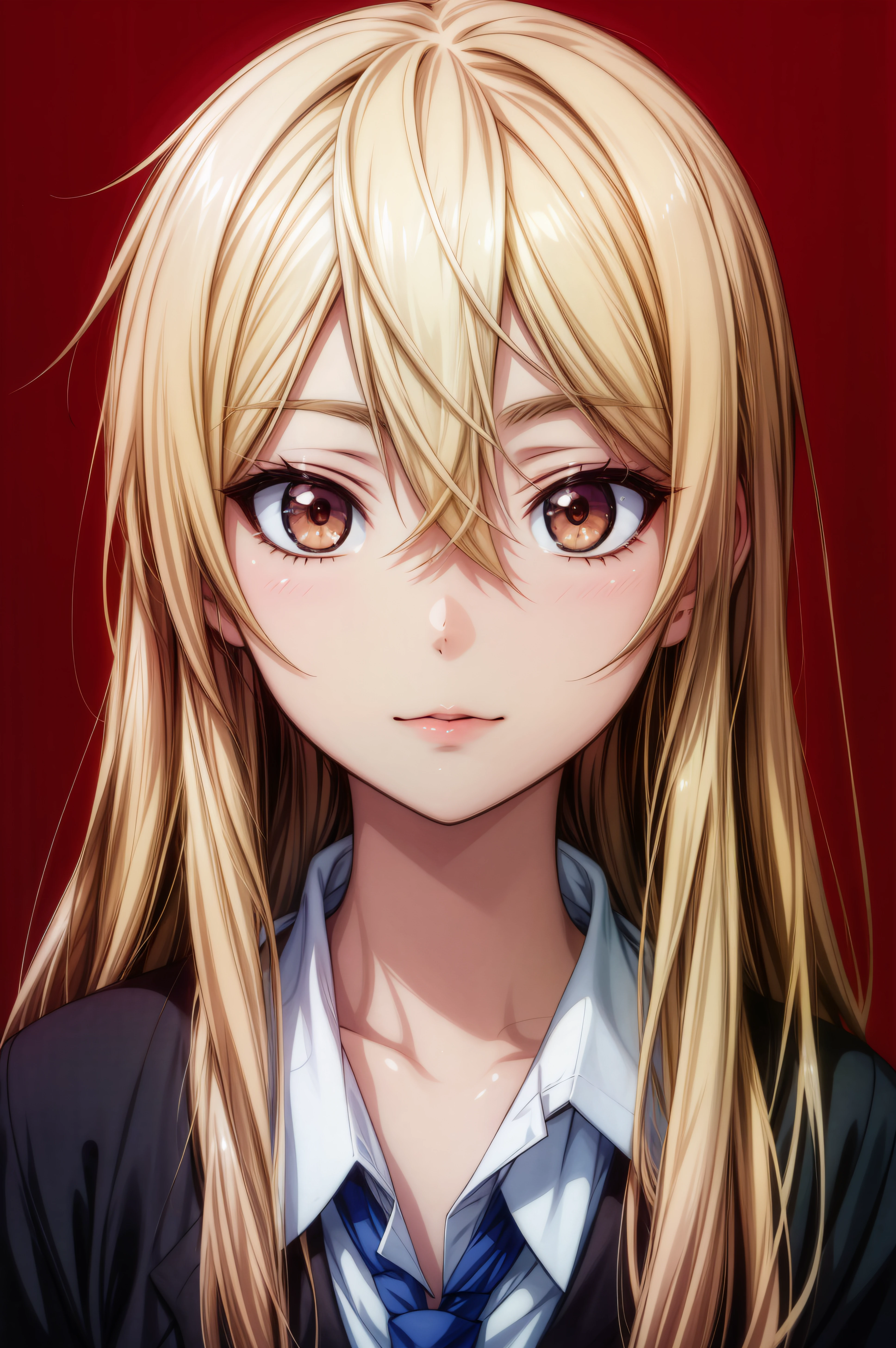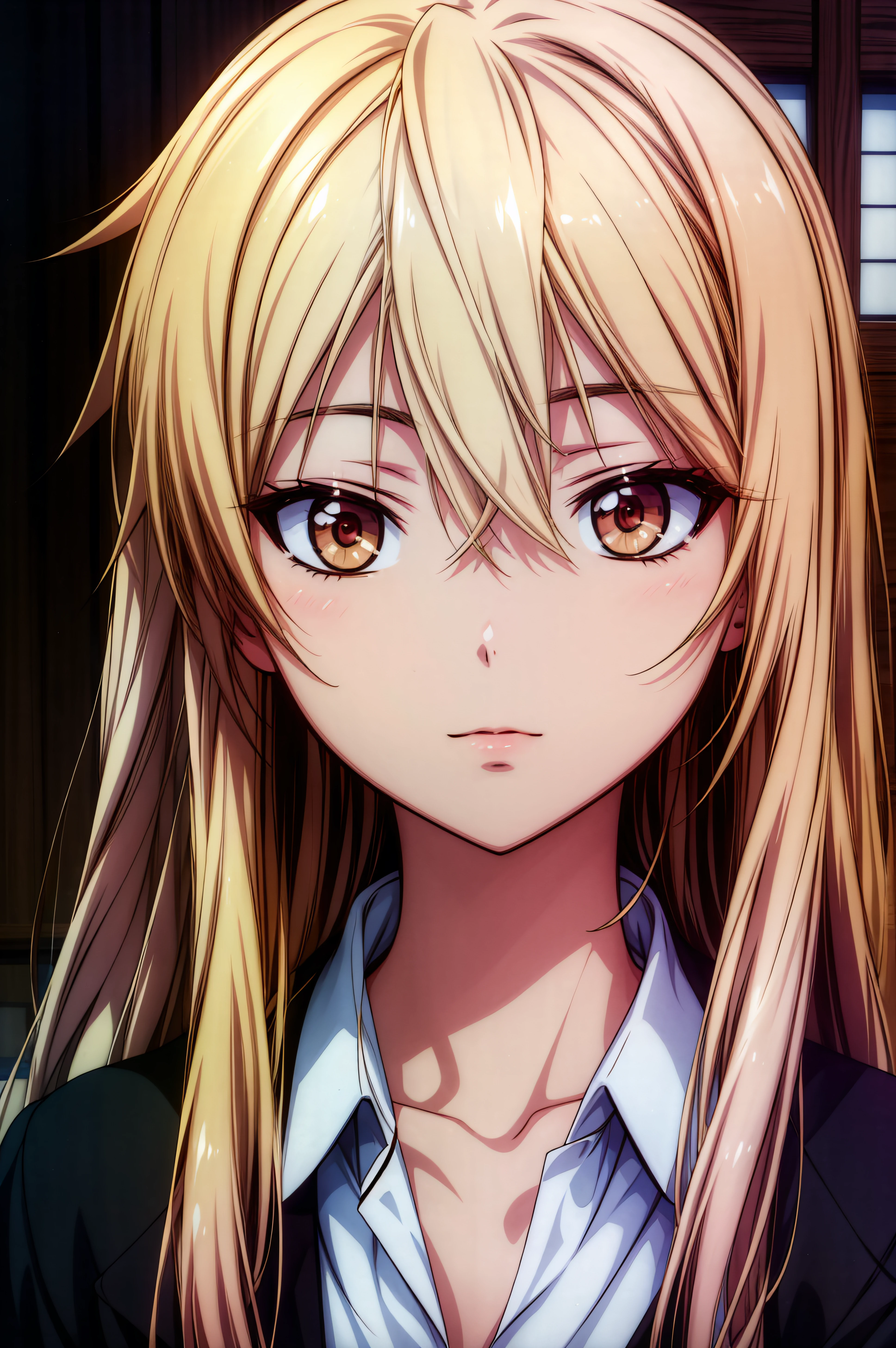 mashiro shiina, caramel-colored eyes, blonde hair, long hair, hair between eyes, long eyelashes,