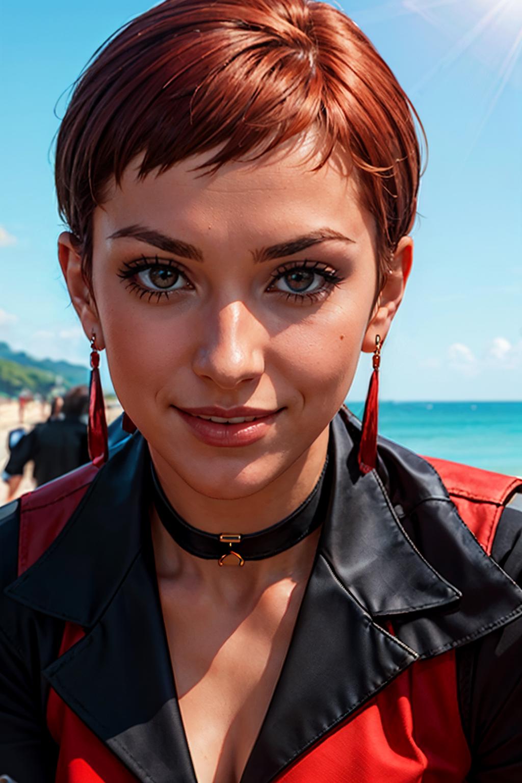 pantyhose, cleavage, dark skin (For later looks) , choker , lipstick , skirt , shorts , long sleeves, black pants, vestthigh strap